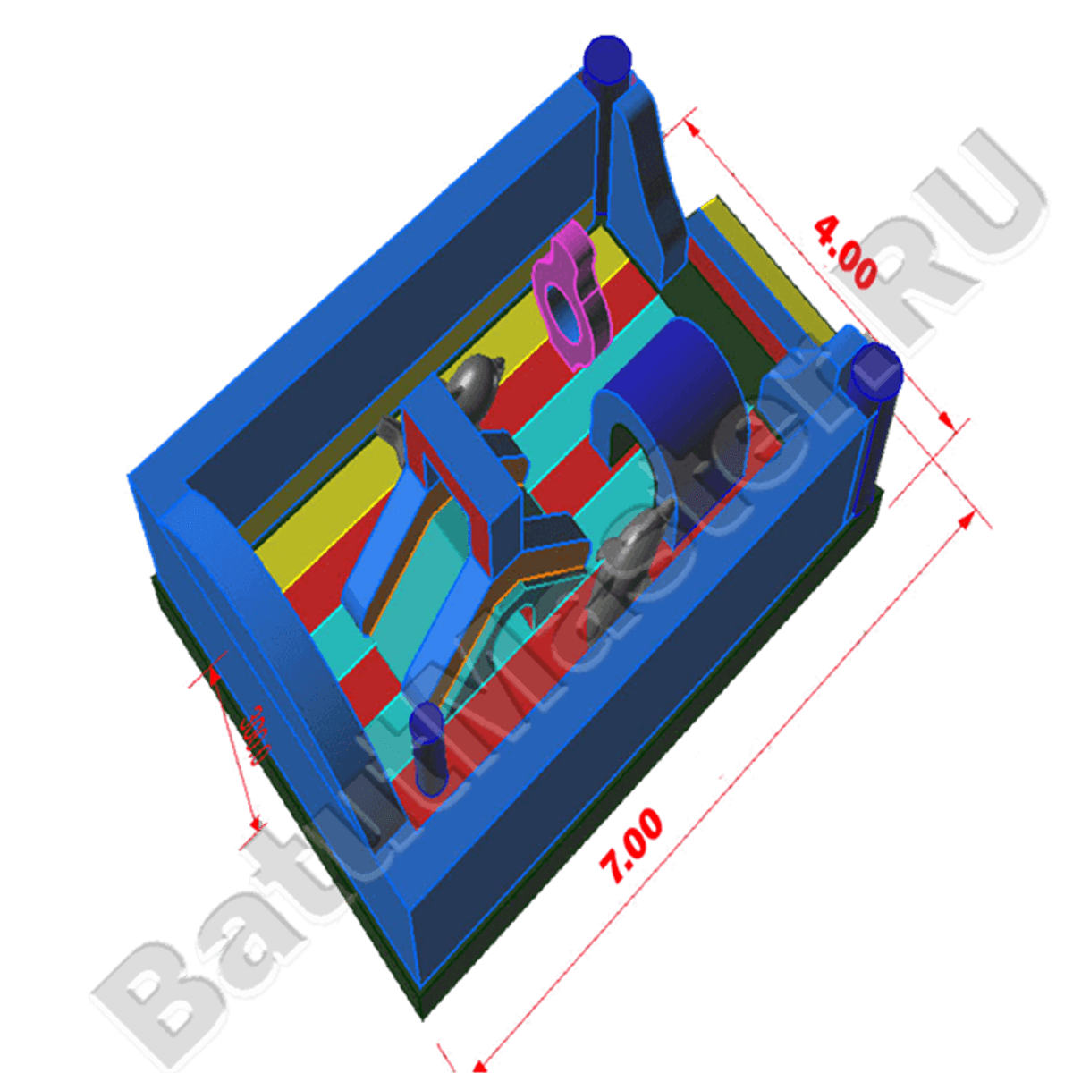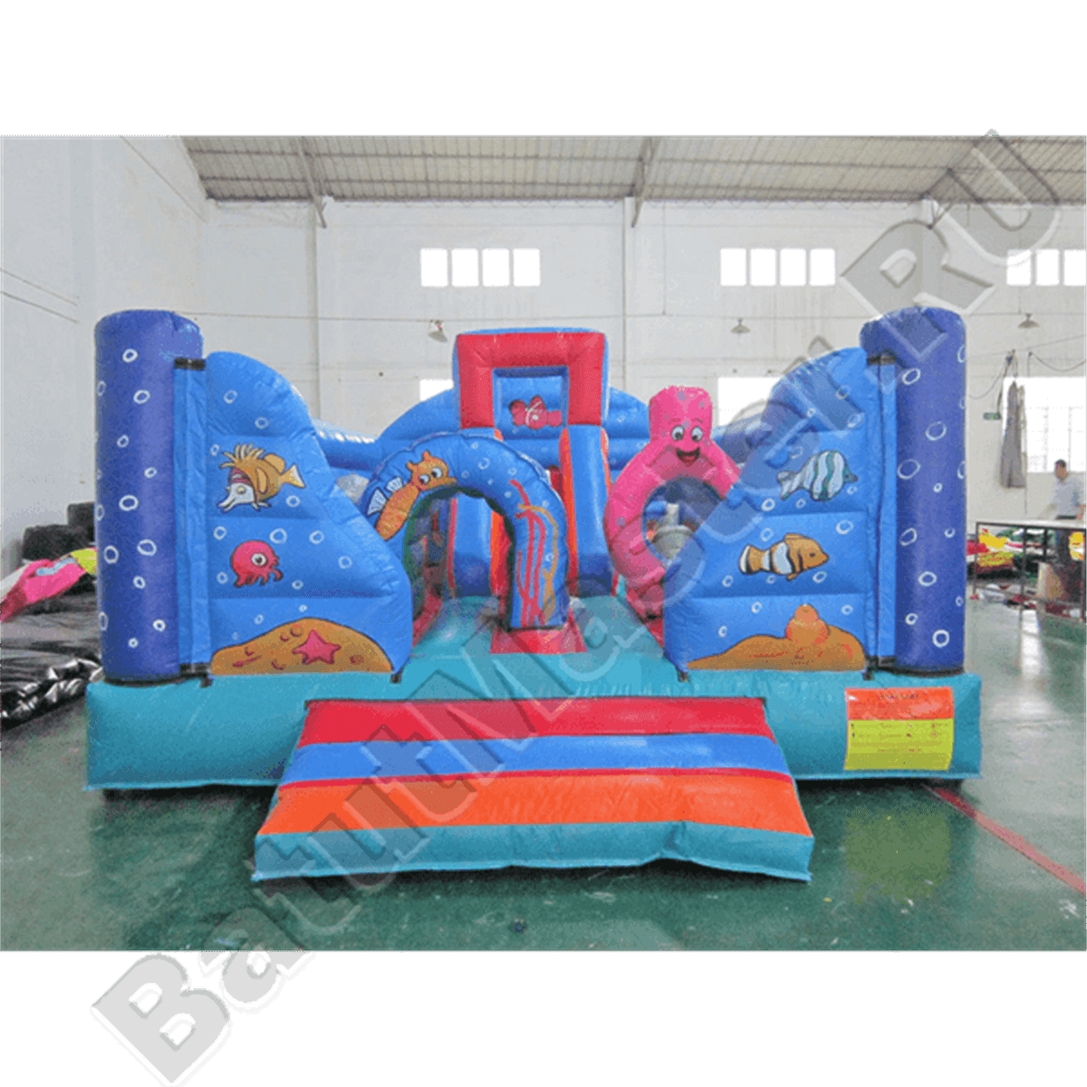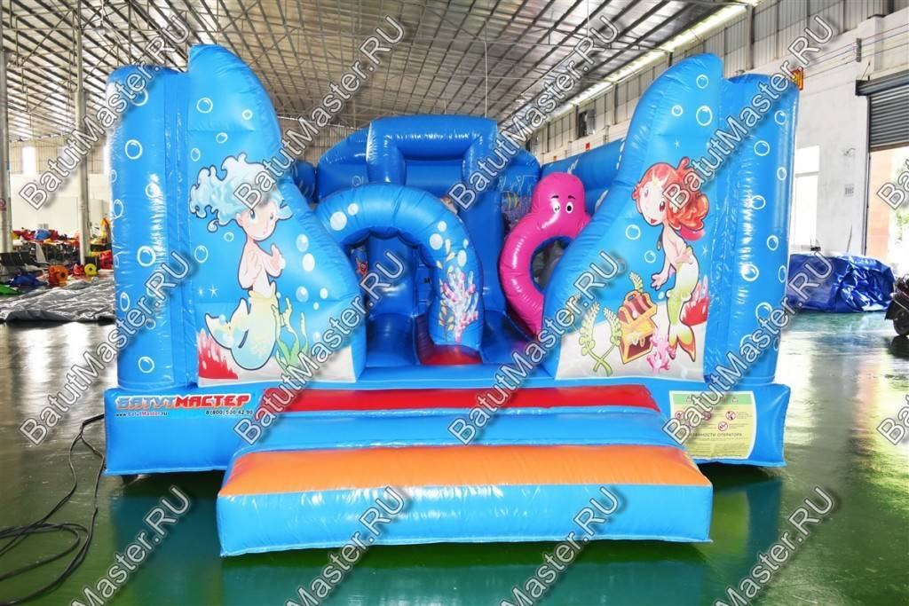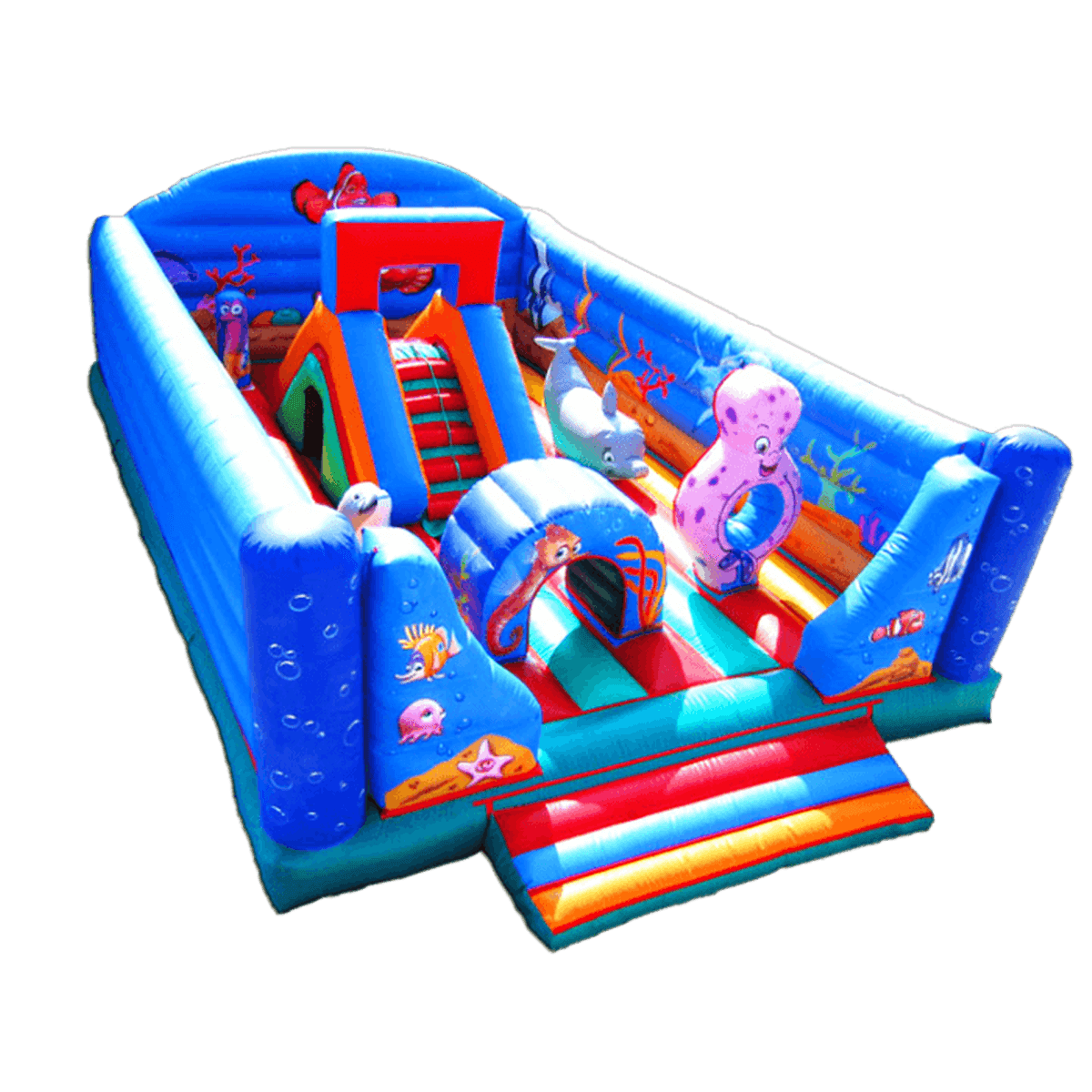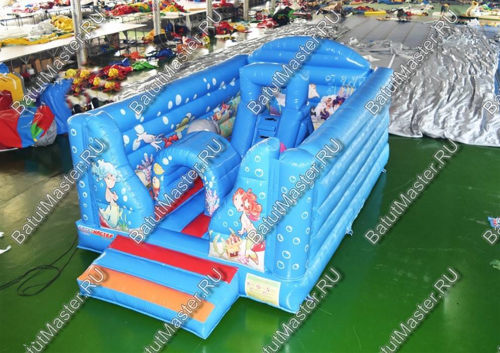 Яркие цвета батута можно увидеть издалека, ведь с них начинается сама подушка безопасности. В центре расположилась занимательная горка с таким же разноцветным подъемом, как и весь аттракцион. Все стены изнутри и снаружи изукрашены морскими подводными жителями. По всему периметру установлены высокие надувные стенки.