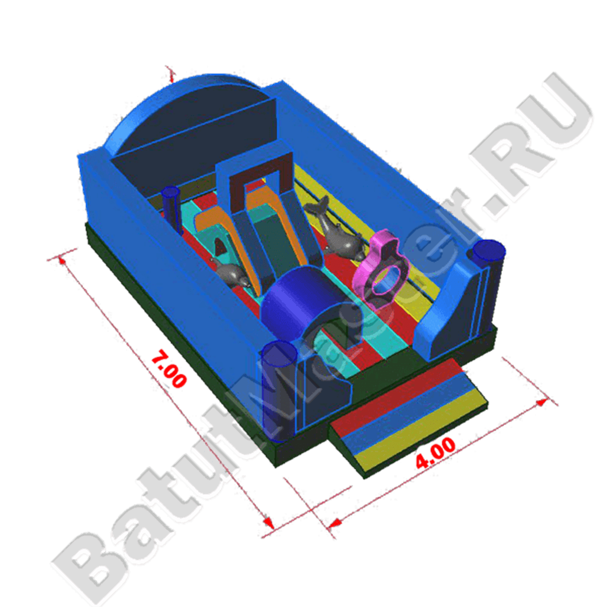Аттракцион в себе сочетает игровые фигурки, на входе есть арка с изображением морского коника, справа – надувной дельфин, на котором можно весело прыгать и резвится вместе со всей морской командой.