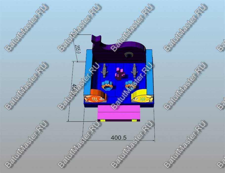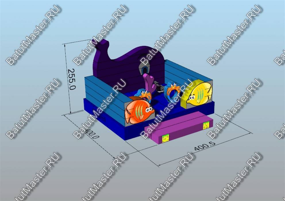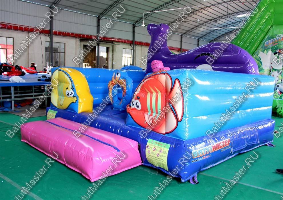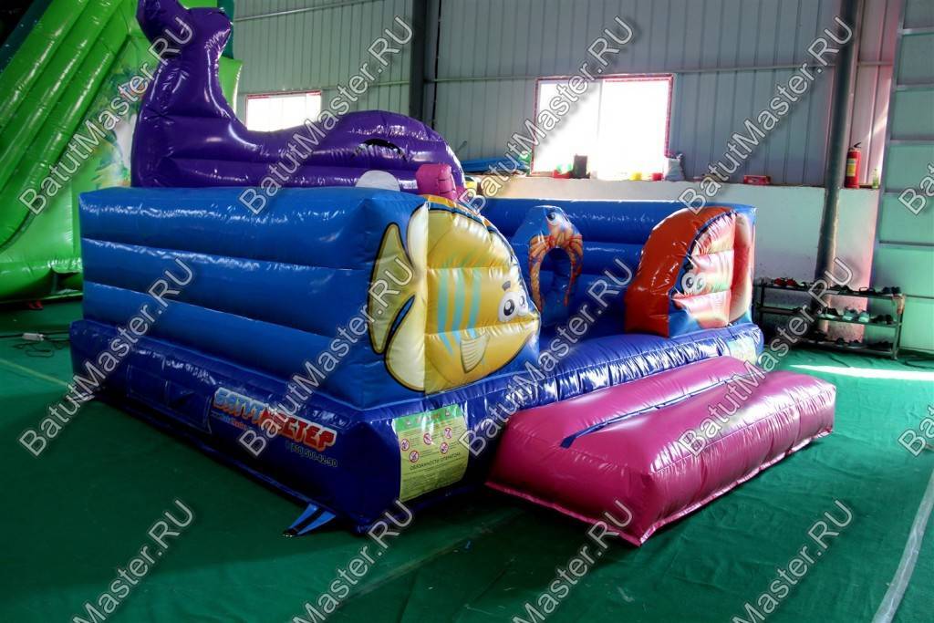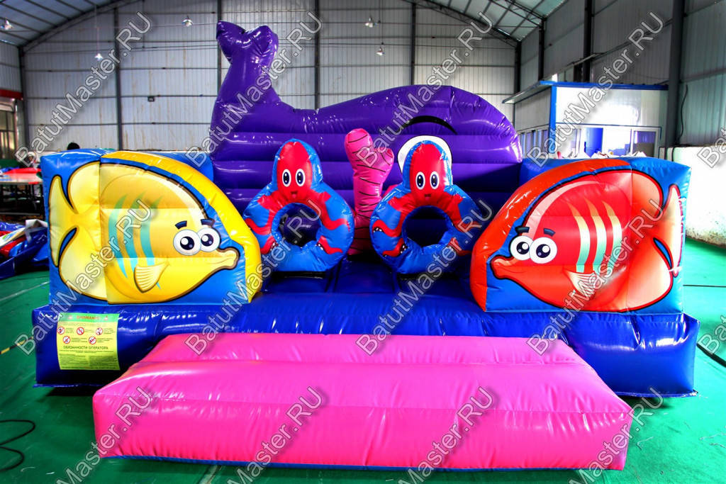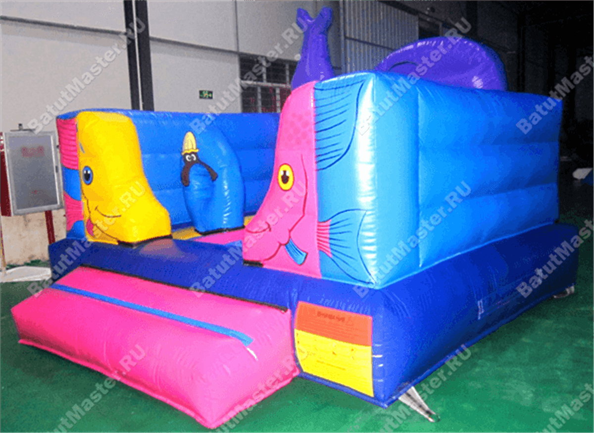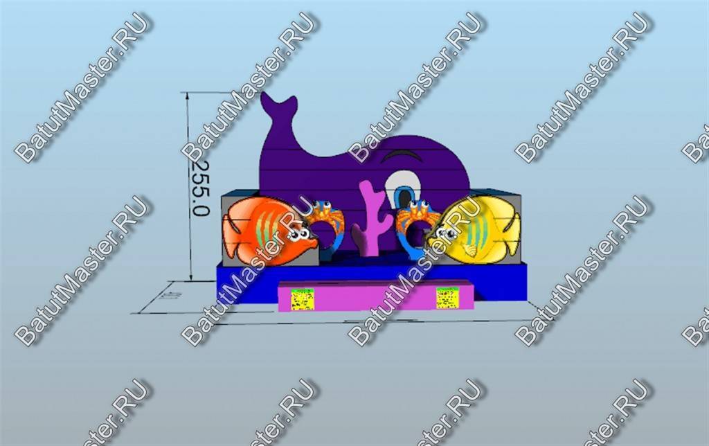 Рыбы встречаются здесь повсюду. Батут открытый, поэтому фронтальная стена аттракциона заканчиваются не ровной стенкой, а фигурой огромного кита. Морская тематика всегда манит детвору, учитывая, что площадь батута не слишком большая, их можно поставить сразу несколько в один рад. Низкая стоимость позволяет приобрести не один аттракцион и получать еще больше выгоды от целого парка развлечений. Отлично подойдет для местности у водоема.