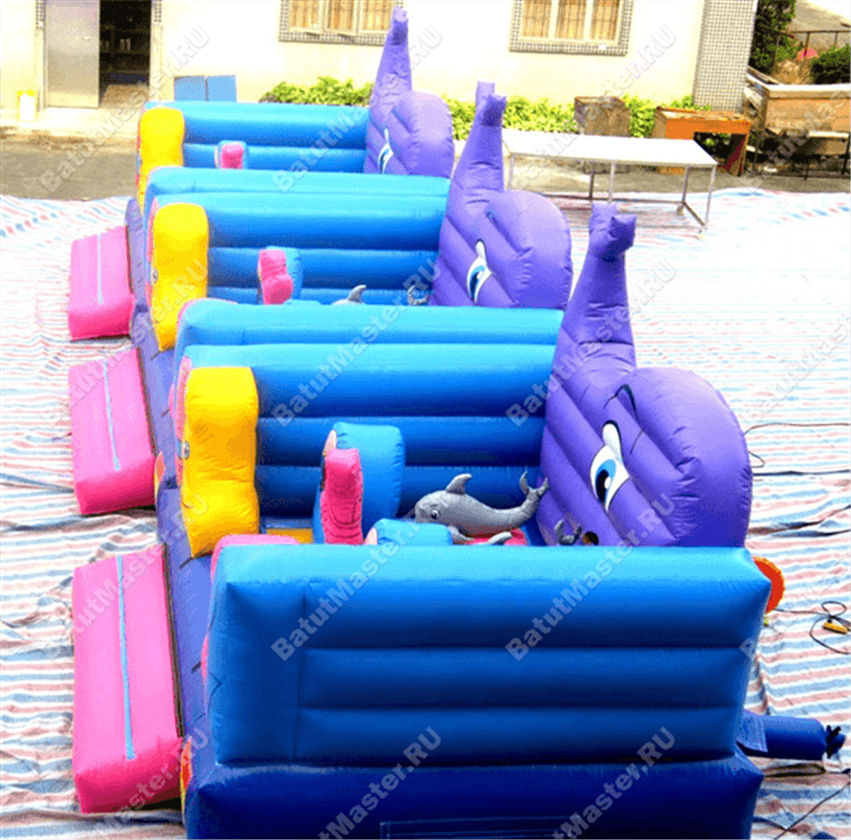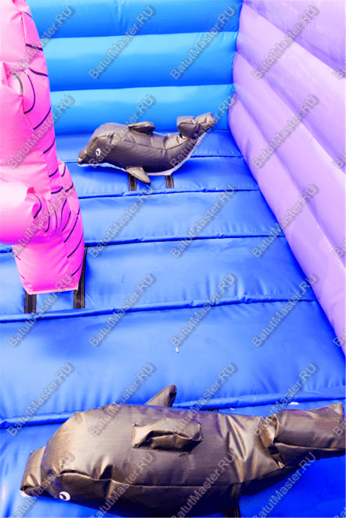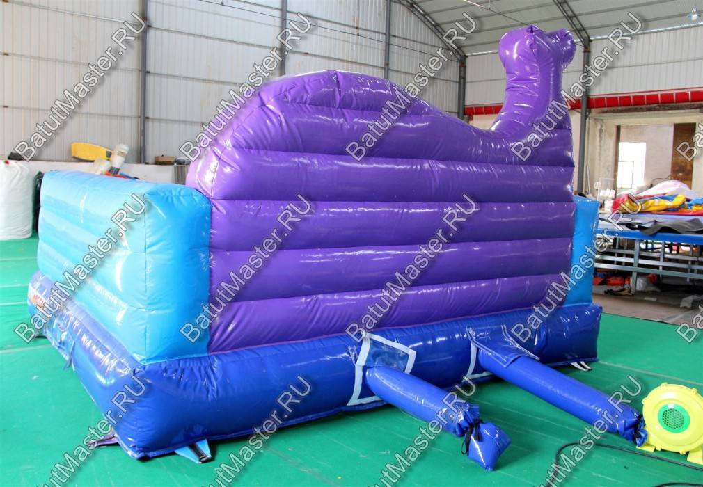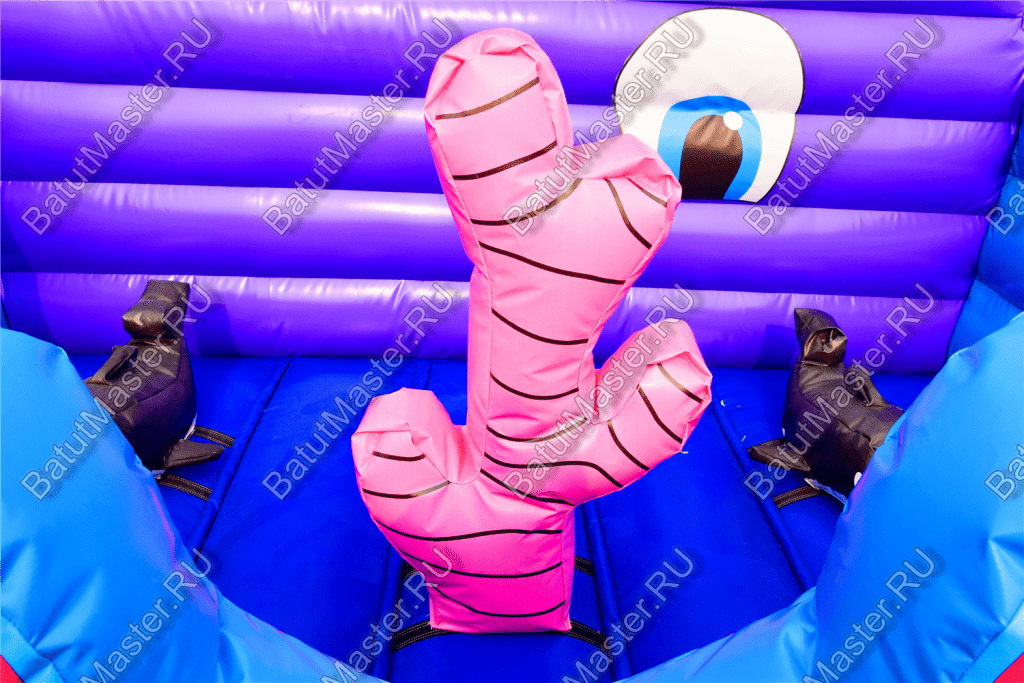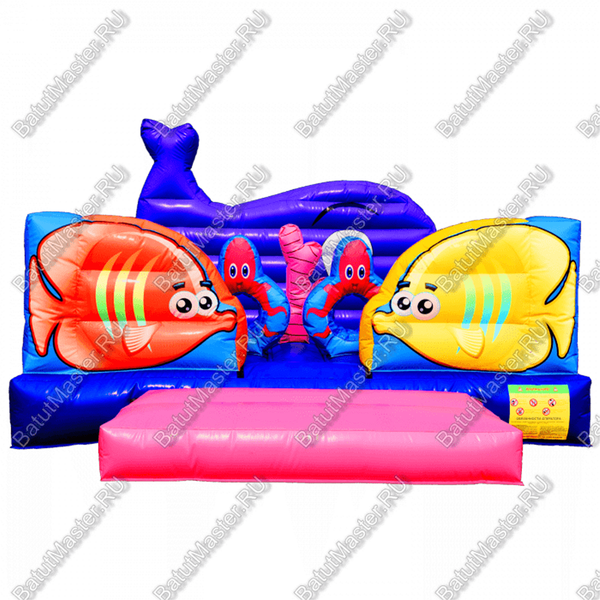 Рыбы встречаются здесь повсюду. Батут открытый, поэтому фронтальная стена аттракциона заканчиваются не ровной стенкой, а фигурой огромного кита. Морская тематика всегда манит детвору, учитывая, что площадь батута не слишком большая, их можно поставить сразу несколько в один рад. Низкая стоимость позволяет приобрести не один аттракцион и получать еще больше выгоды от целого парка развлечений. Отлично подойдет для местности у водоема.