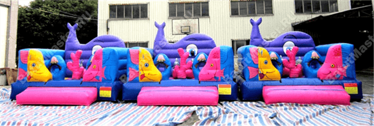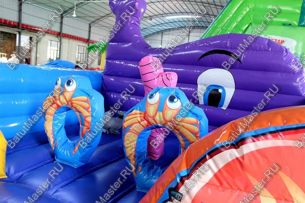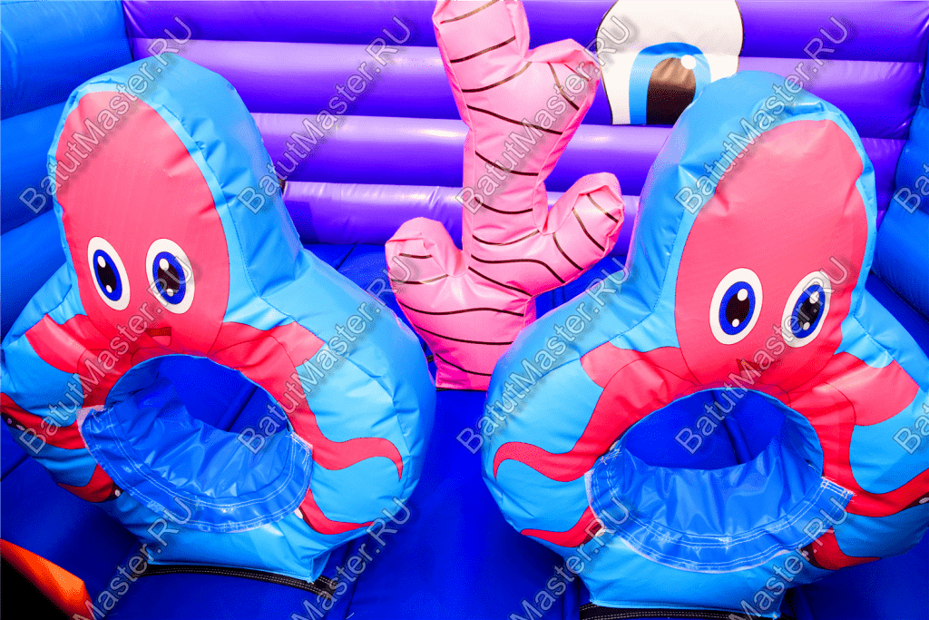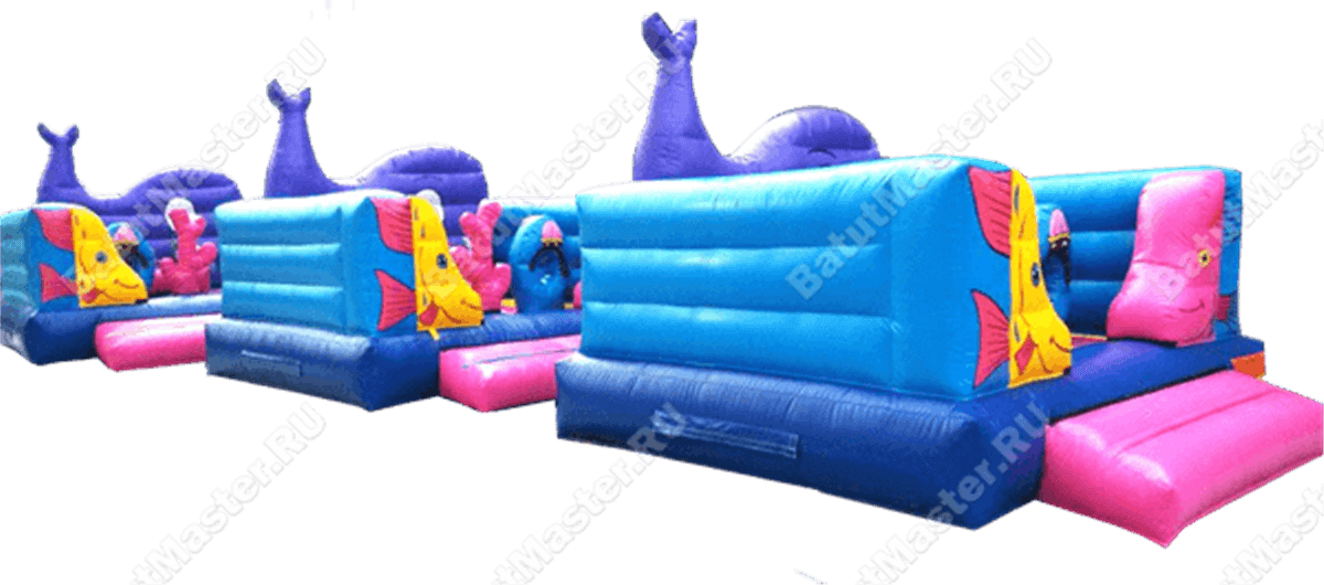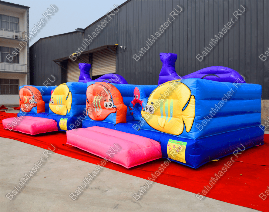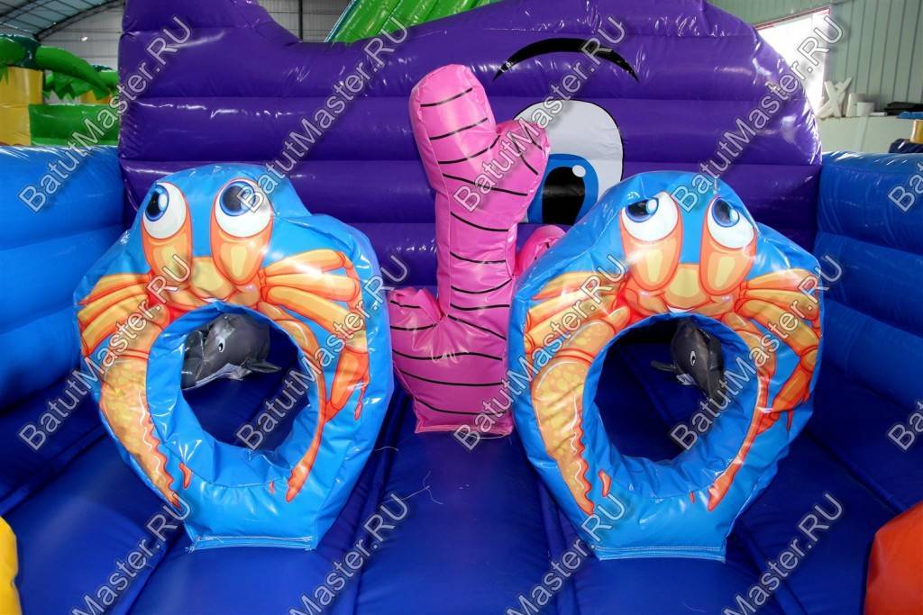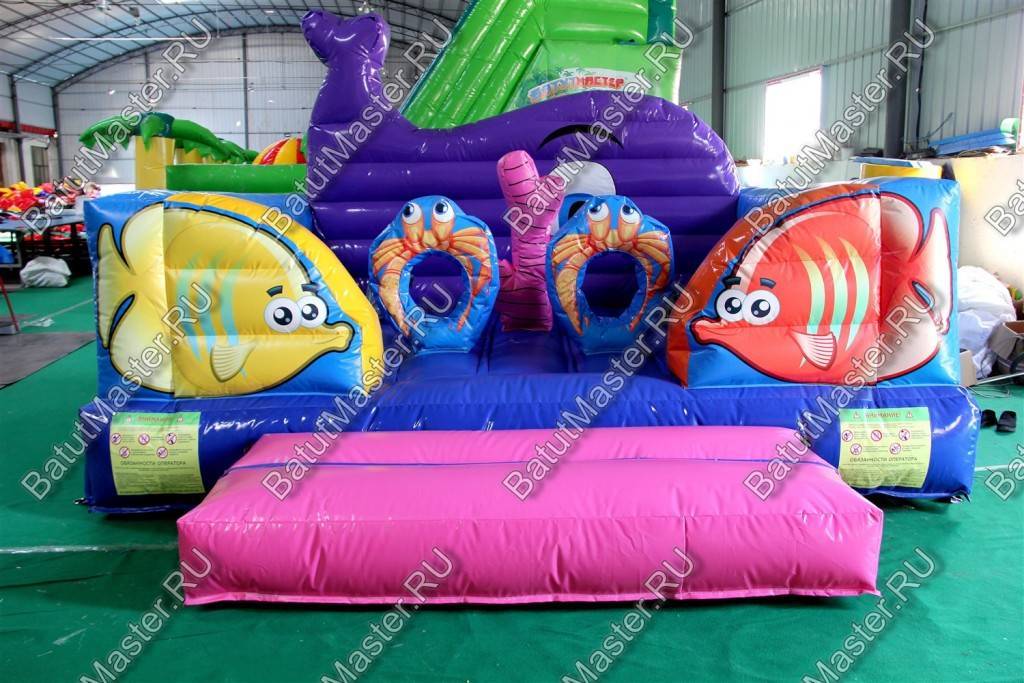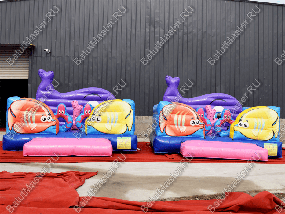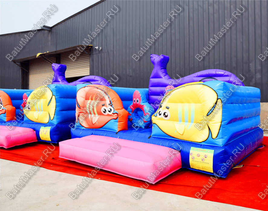 В самом начале небольшой батут представлен в виде двух рыбок разного цвета: желтая и розовая. Дальше расположились игровые фигуры, которые помогают ребенку прыгать еще веселее и задорнее. Огромный коралловый риф розового цвета установлен посреди площадки, по разным сторонам надуты голубые мягкие круги с отверстиями посредине и изображением розовых крабов.
