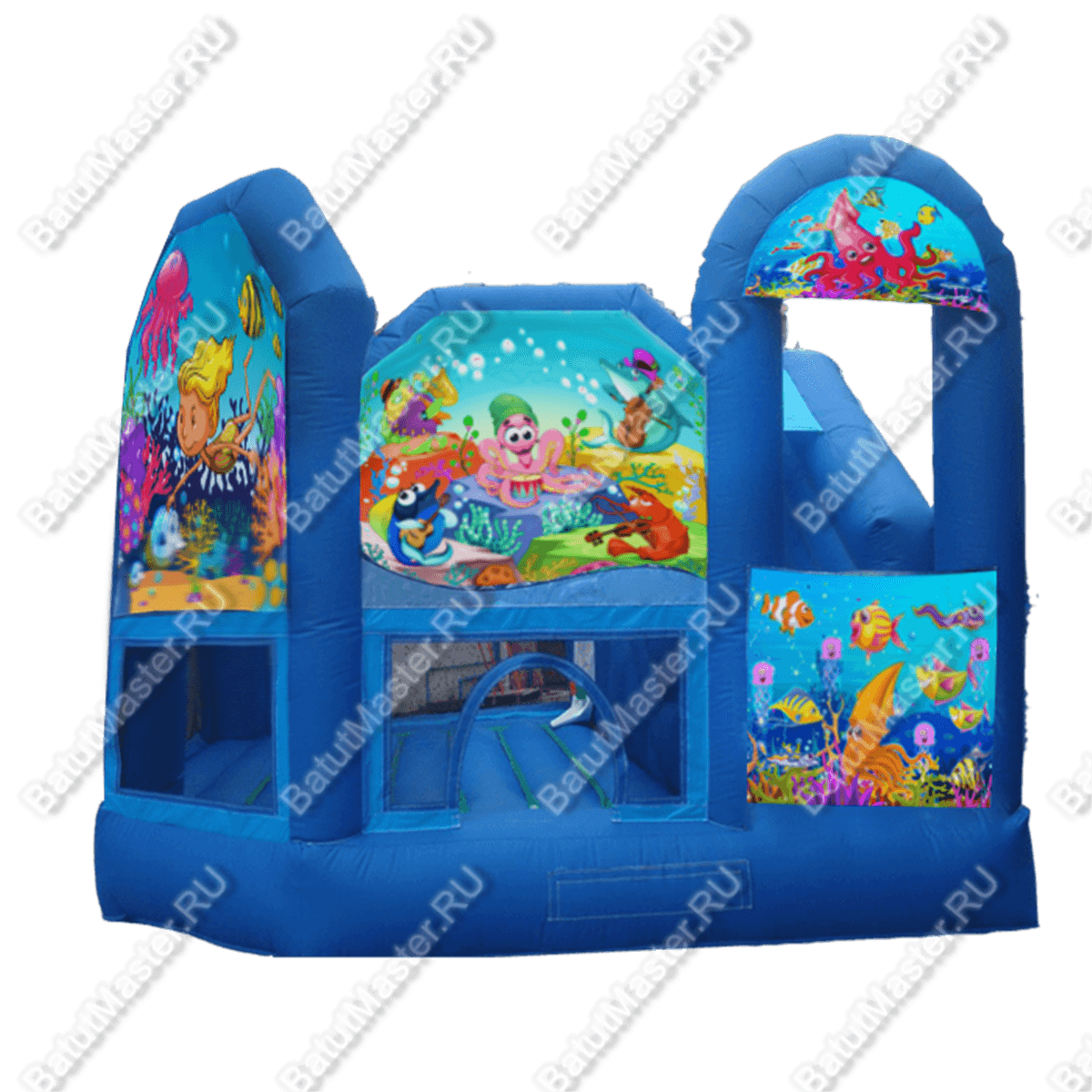 Коммерческий надувной батут для бизнеса музыка моря изготовлен в морской тематике и оснащен вместительным прыжковым полем, а также горкой. Детям будет очень интересно забираться во внутрь и изучать пространство, тем более, что оно все разрисовано морскими обитателями. Снаружи комплекс такой красочный, что рябит глазах, что его заметят издалека.