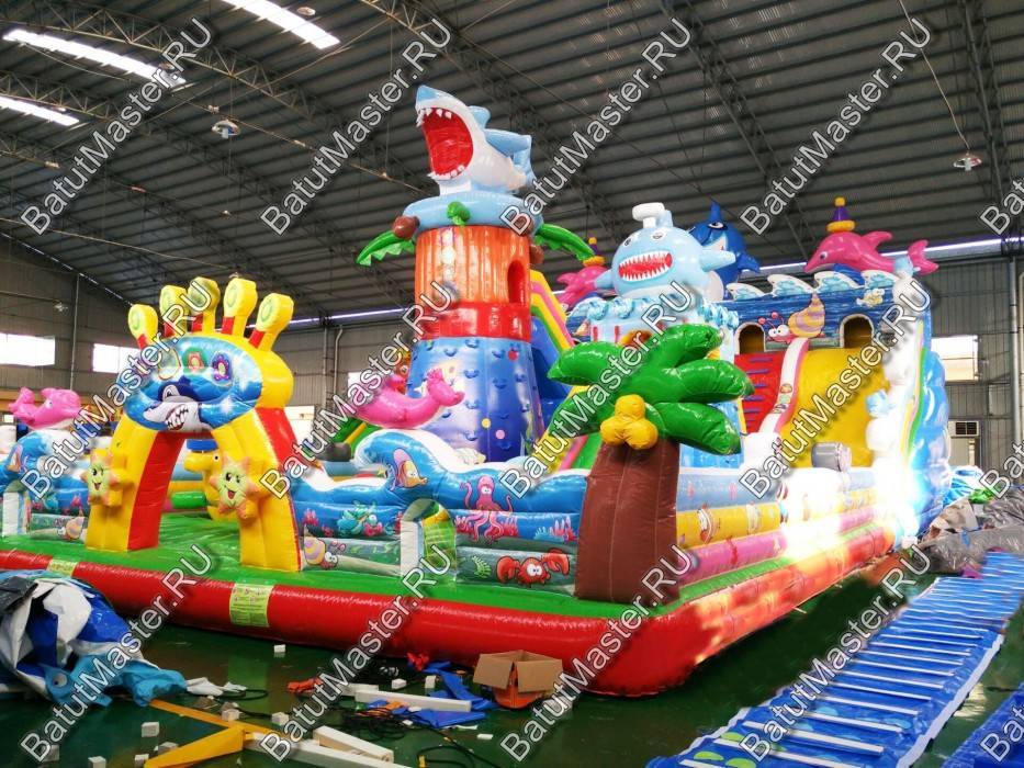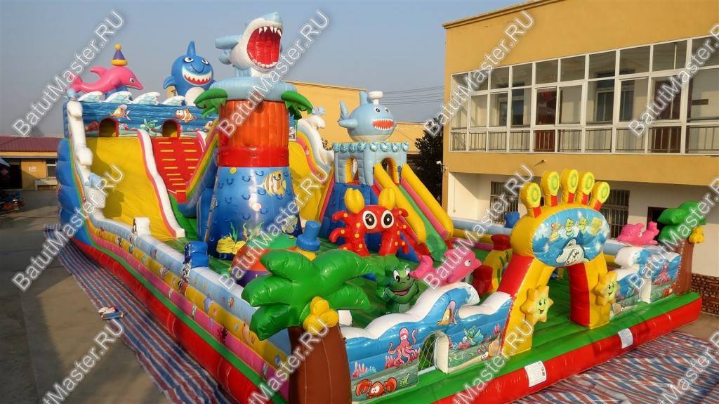 Большой надувной батут непременно порадует детей! Он создан для невероятных приключений и незабываемых впечатлений. Оснащен самыми интересными модулями в виде морских жителей. Здесь есть несколько горок, рассчитанных на разную возрастную категорию детей, скалодром с домиком наверху и спуском, множество модулей в виде рыб, крабов, а также тоннели, кольца и многое другое. Понравится также и большая черепаха, на которую так весело будет забираться, используя безопасные ремни. В конце батута маленьких непосед ждет невероятный спуск, рассчитанный на целую команду. Наверху есть домики, где дети с удовольствием будут играть в прятки. Вся площадь надувного комплекса предназначена для прыжков. Коммерческий батут снаружи украшен дельфинами, деревьями и рисунками подводного мира. Дети по достоинству оценят такой игровой батут, ведь здесь каждая деталь разработана для того, чтобы дети двигались и весело проводили время. Сбоку комплекс защищен надувными бортами, которые не содержат жестких элементов, а это значит, что здесь совершенно безопасно. Спереди есть небольшие окошки из прочной сетки. Рассчитан для бизнеса. Выполнен из качественного ламинированного ПВХ.