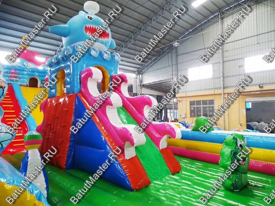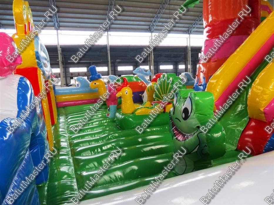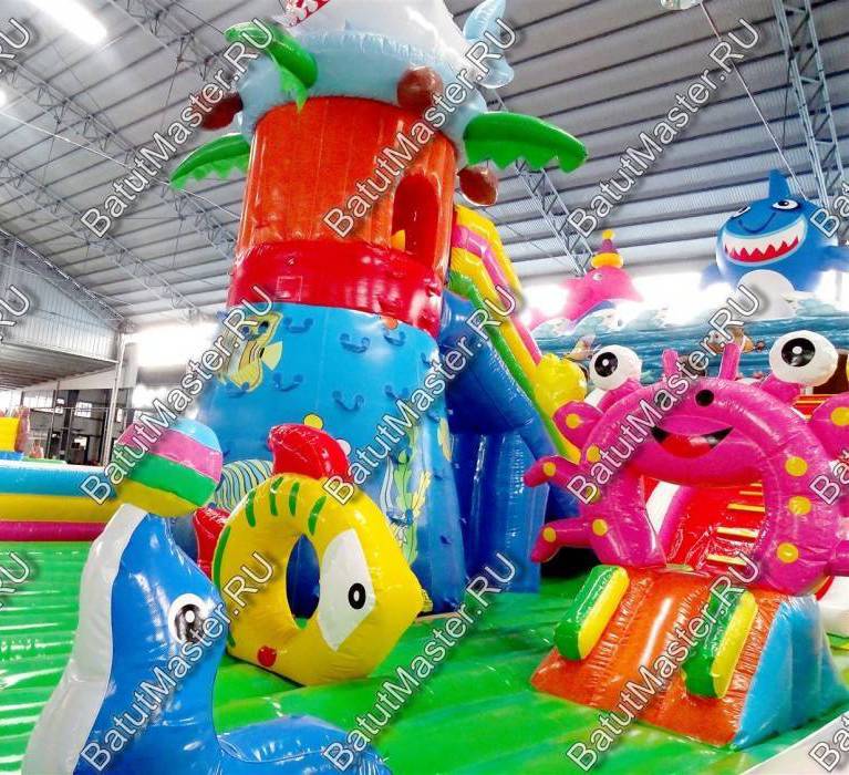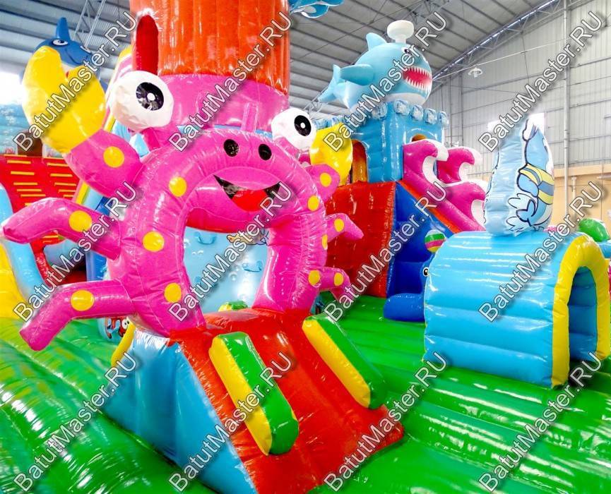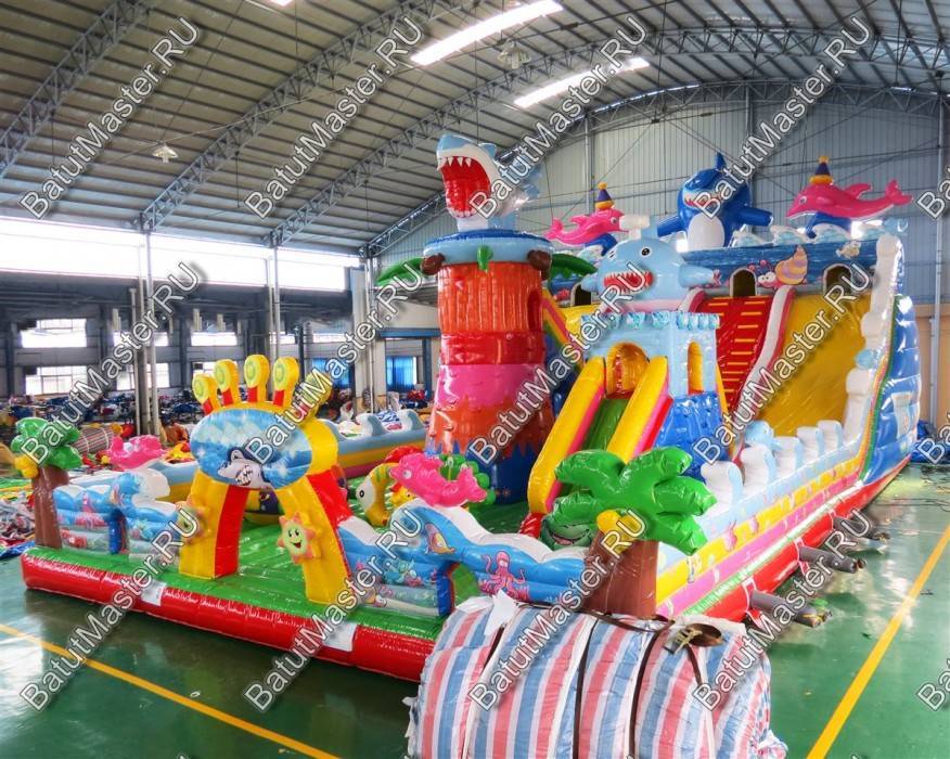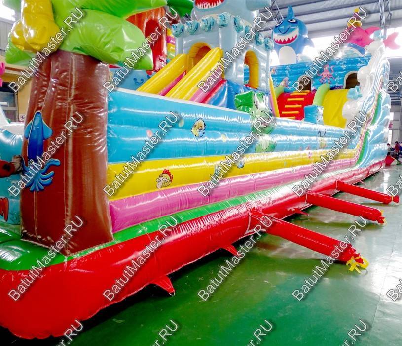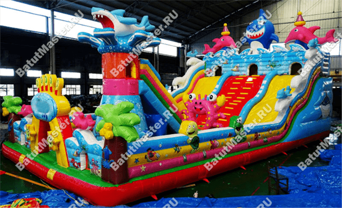 Огромный комплекс с самым интересным наполнением из ярких модулей и игровых элементов ждет каждого ребенка. Здесь имеется несколько горок, домик, черепаха, на которую можно забираться и весело падать с нее на мягкую основу. Кроме этого, надувной батут располагает полноценным скалодромом, на котором есть горка. Морские жители в виде рыб, а также различные элементы в виде растений и водорослей задают тематику морского дна. Стоит отметить безопасность комплекса. Со всех сторон он окружен высокими надувными бортами в человеческий рост. Таким образом дети во время игр не выпадут наружу. Здесь нет ни одного жесткого элемента, а это значит, что веселиться всей командой, еще приятнее.Коммерческий батут выполнен из качественного материала, который прошел предварительное ламинирование. Он не выгорает от солнца и не портится при низкой температуре. Легко собирается и разбирается согласно инструкции. В комплекте имеется необходимое оборудование для установки и эксплуатации.Предназначен для бизнеса. Может быть установлен на любую ровную поверхность и даже на песок. Станет отличным дополнением детской игровой зоны в развлекательном центре или на территории санатория или гостиницы.