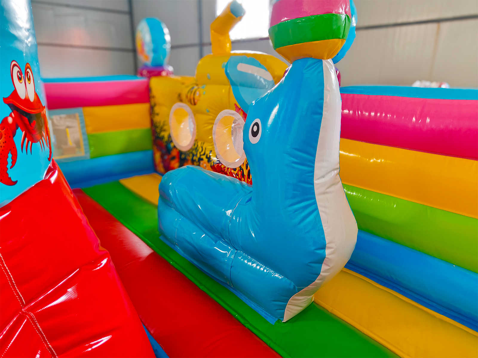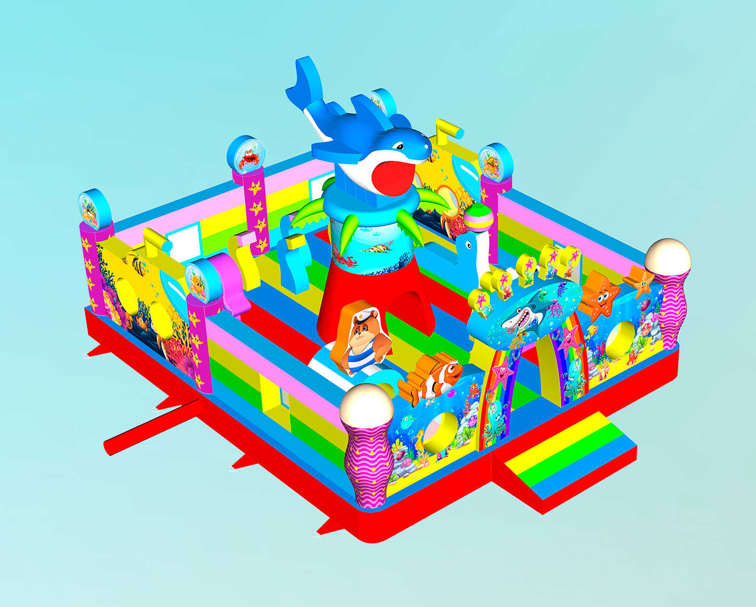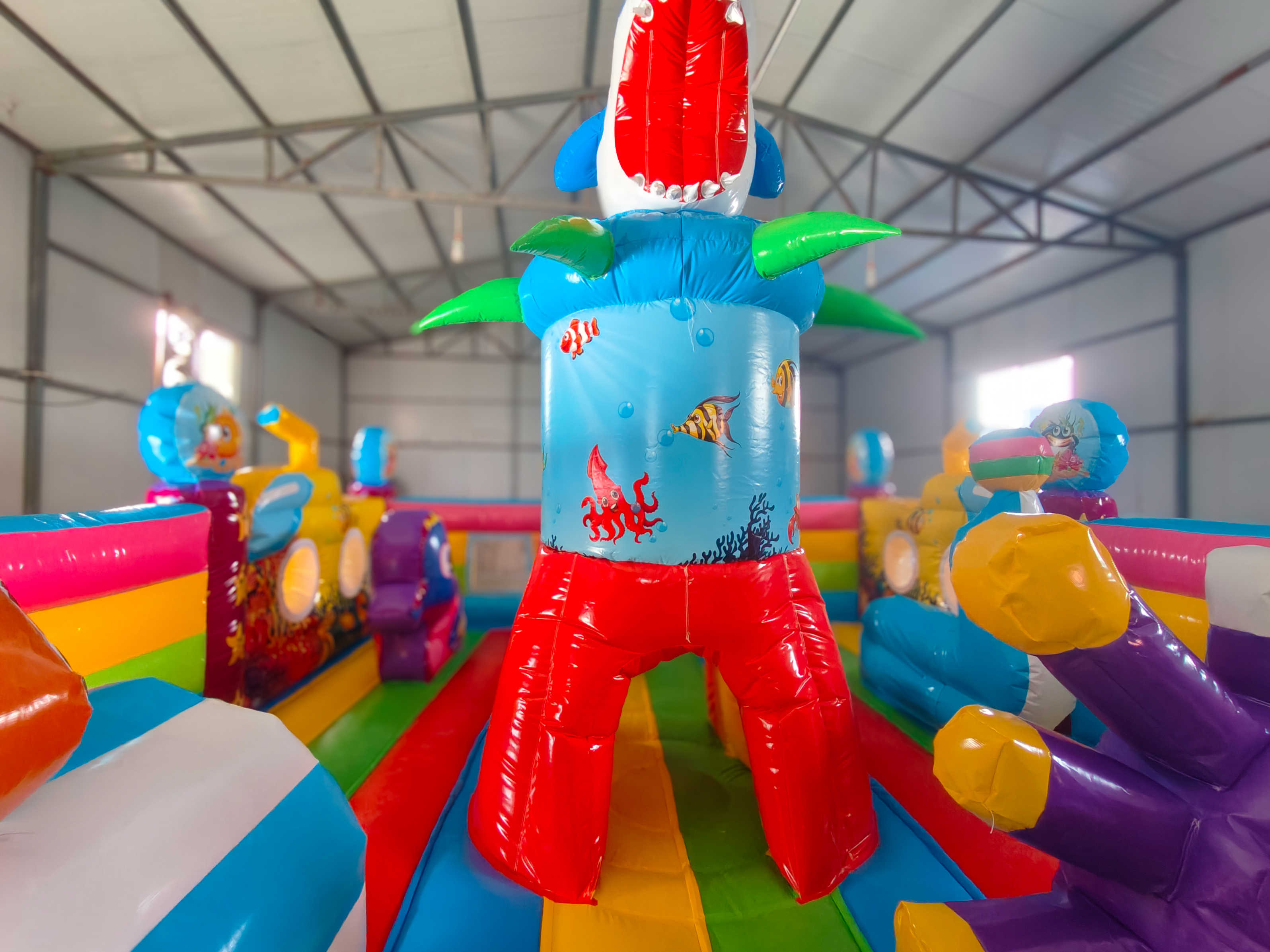 Батут «На морском дне» выполнен в морской тематике, наполненной красочными рыбками, акулами, кораллами и другими обитателями глубин. Это не просто батут, а сказочное пространство, в котором каждый ребёнок превращается в исследователя подводного царства. Декоративные элементы в виде надувных животных, тоннели, арки и препятствия стимулируют активность, развивают координацию и вызывают море эмоций у малышей.
