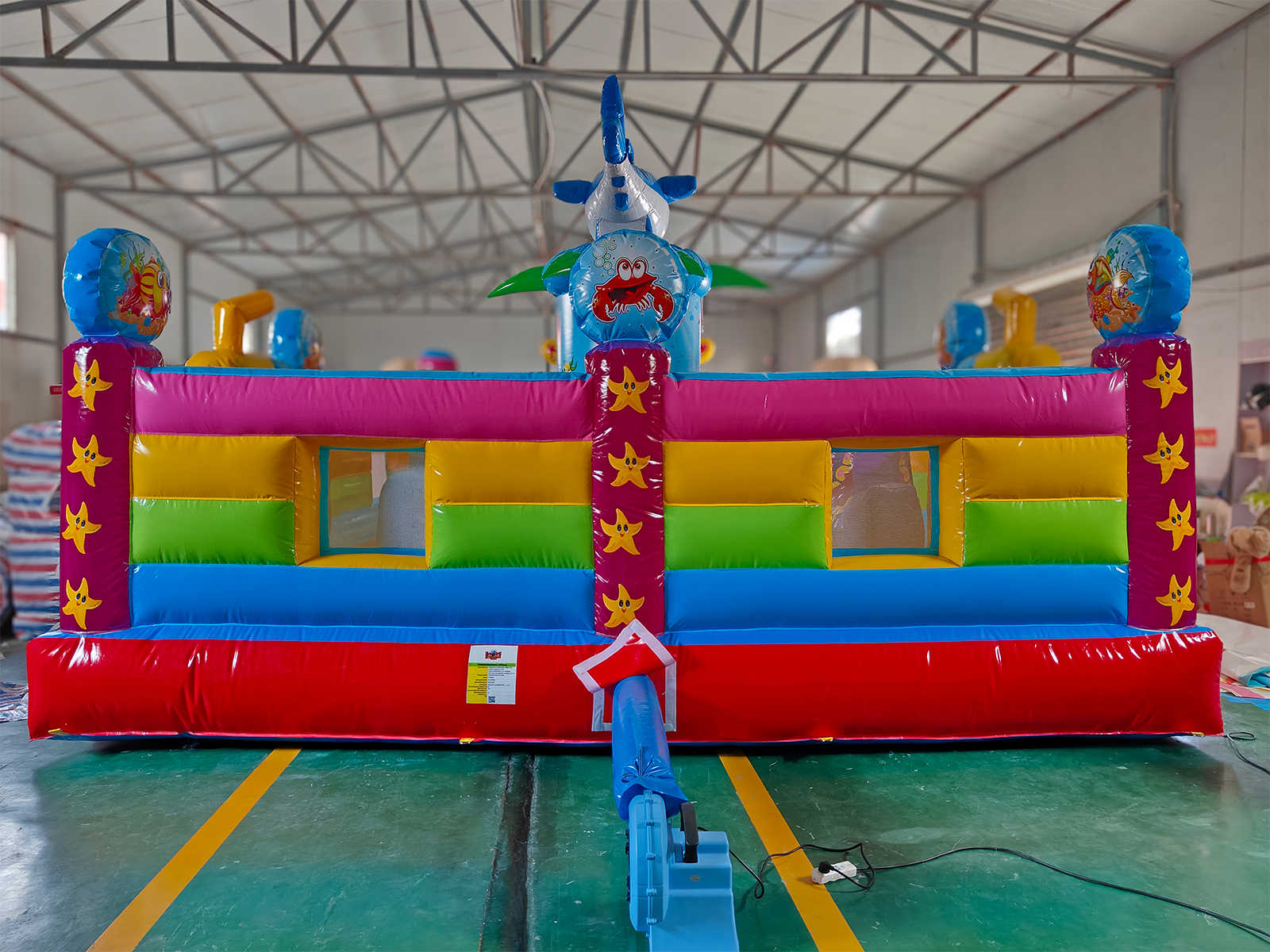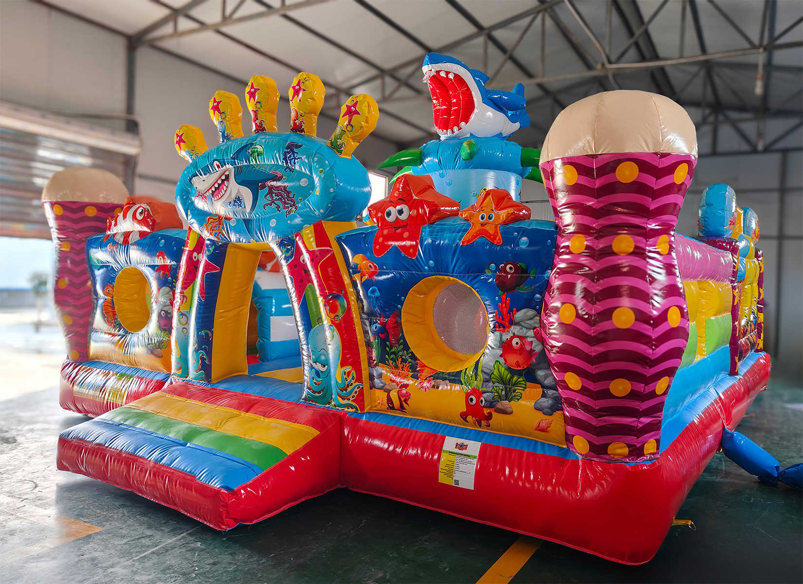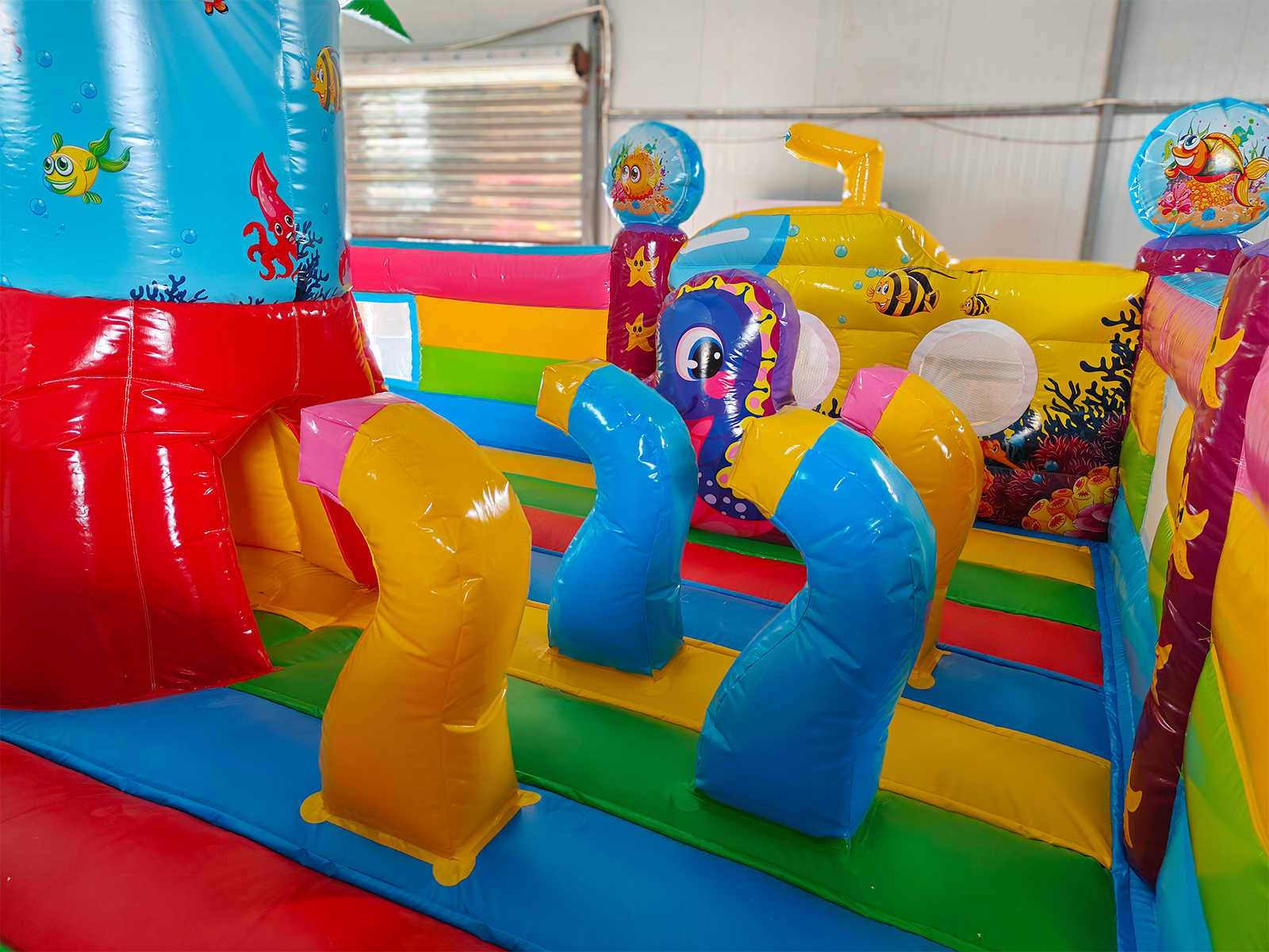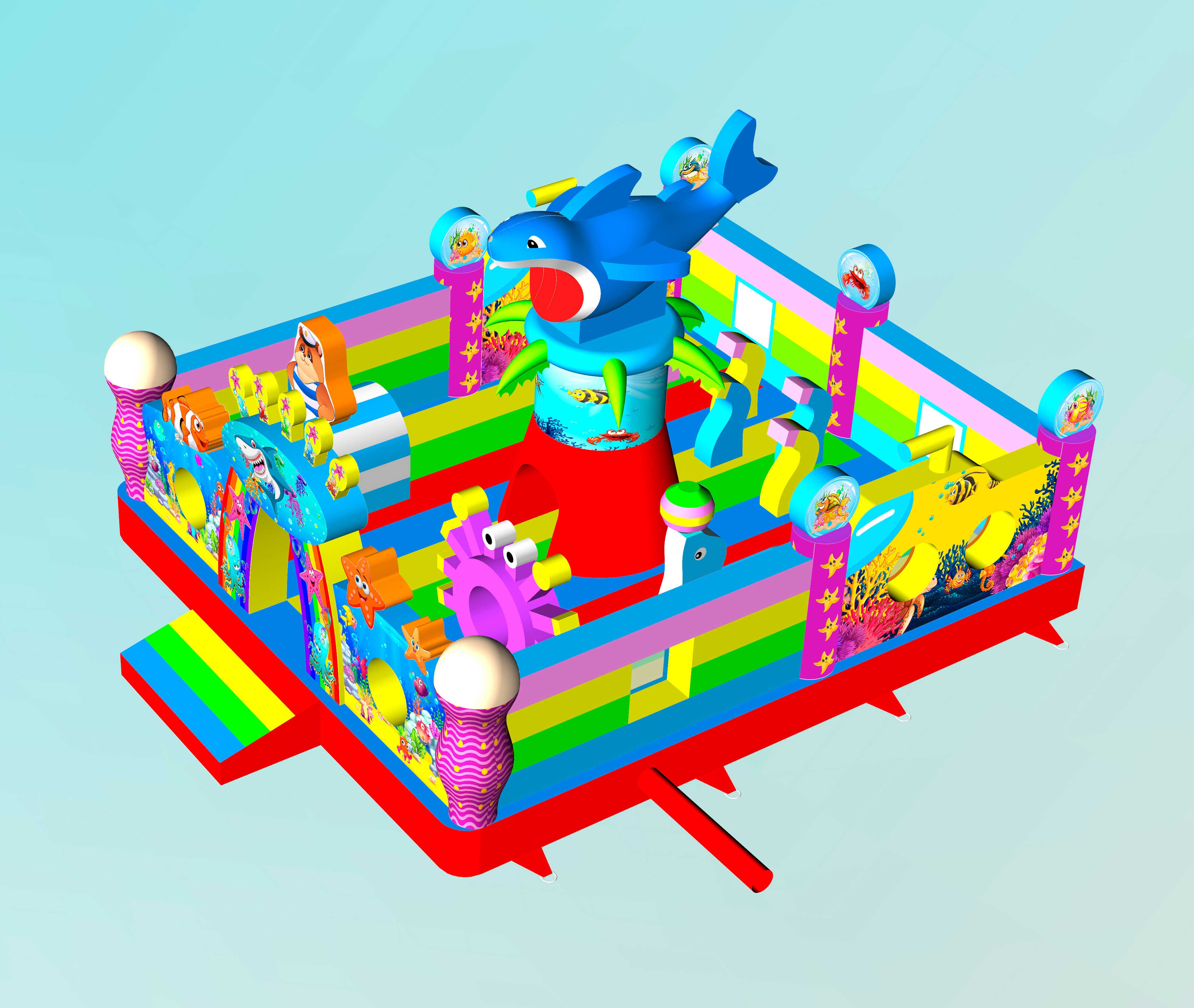 Батут «На морском дне» выполнен в морской тематике, наполненной красочными рыбками, акулами, кораллами и другими обитателями глубин. Это не просто батут, а сказочное пространство, в котором каждый ребёнок превращается в исследователя подводного царства. Декоративные элементы в виде надувных животных, тоннели, арки и препятствия стимулируют активность, развивают координацию и вызывают море эмоций у малышей.