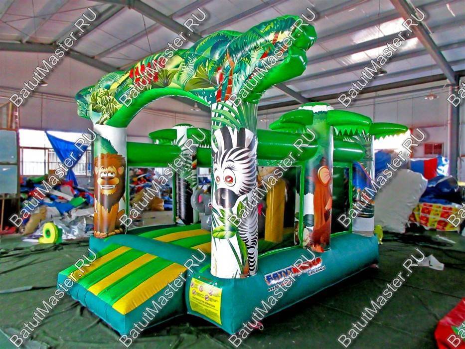 Небольшой батут в африканской тематике способен собрать целую команду отважных «путешественников» и любителей попрыгать, порезвиться. Вся конструкция довольно яркая: насыщенная зеленая подушка в виде нижней платформы, по всему периметру установлены колонны – пальмы. На верхушках этих надувных растений созданы почти натуральные листья из ПВХ.
