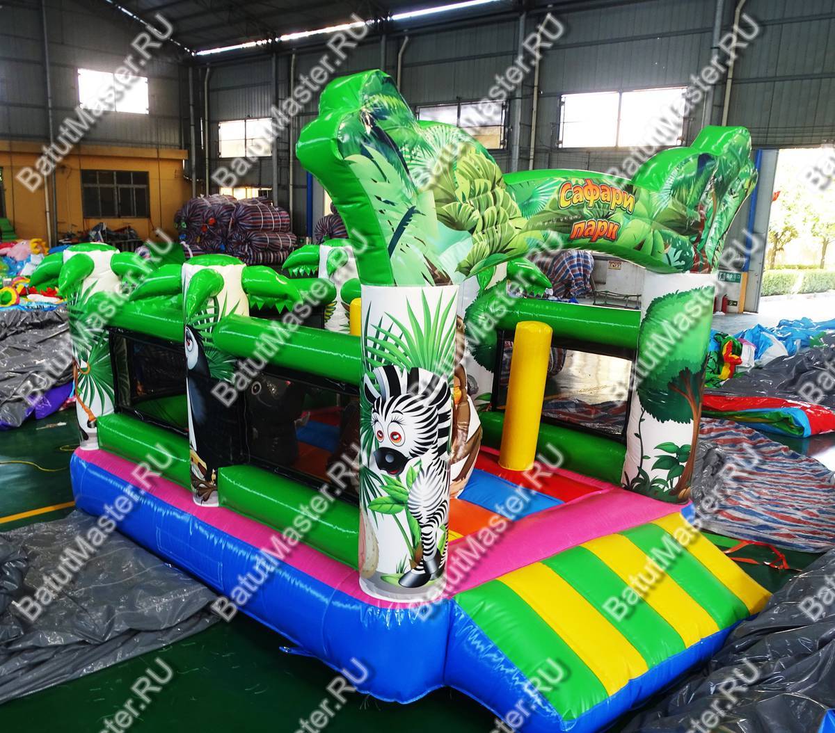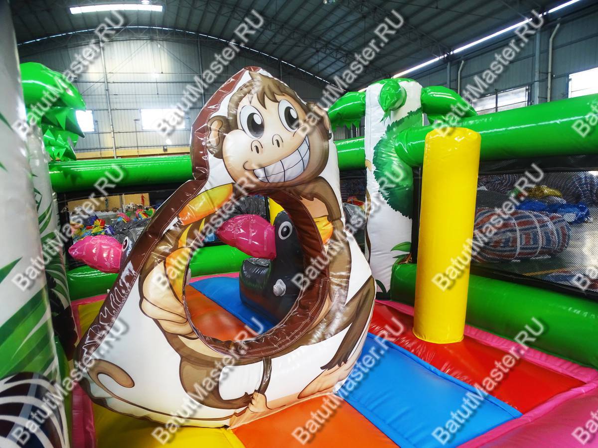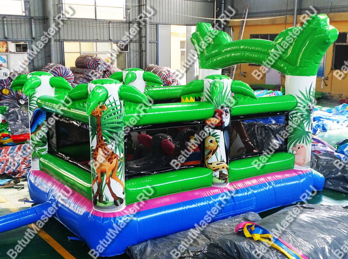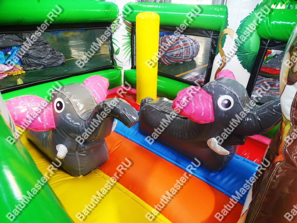 Недорогой батут начинается с огромной арки на фасадной части. На передних колоннах изображен лев и тигр. Между пальмами-колоннами натянута прочная сетка, которая предупредит ребенка от случайного выпадения. В центре площадки игровые фигуры: два слона и большая обезьяна с отверстием внутри для лазания.