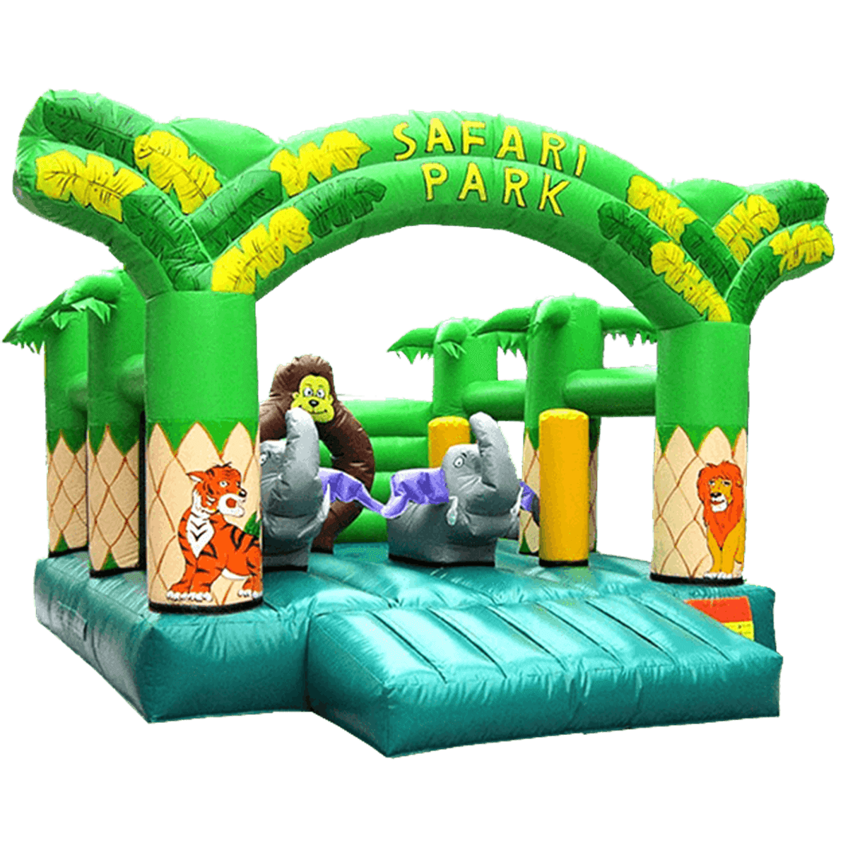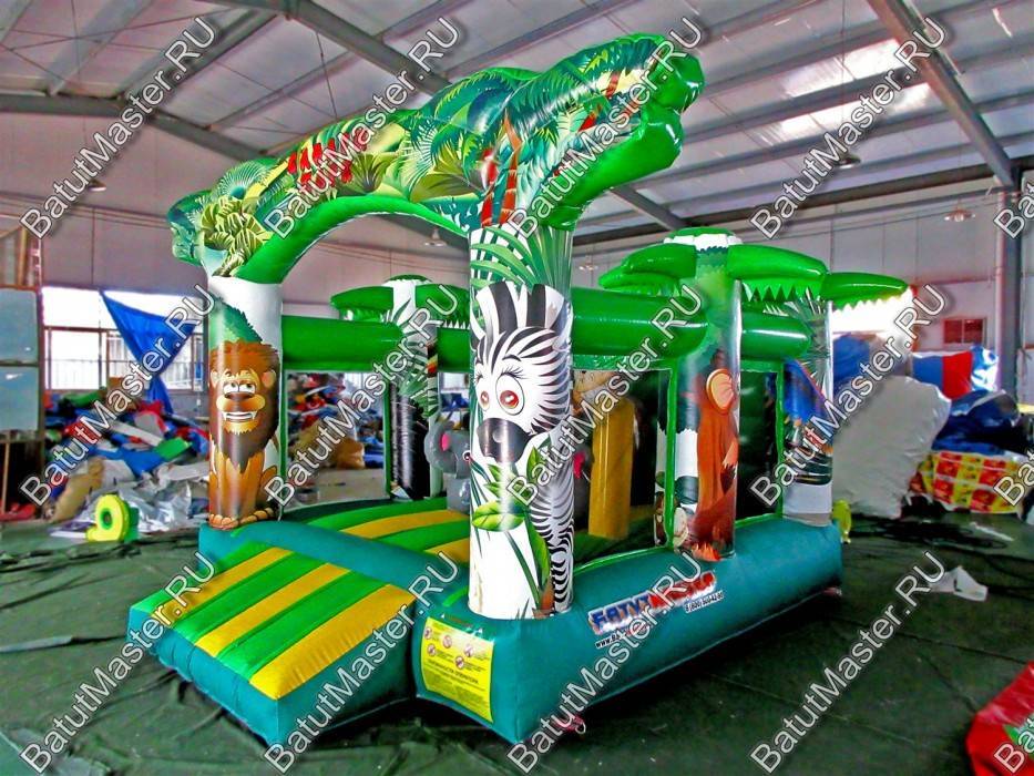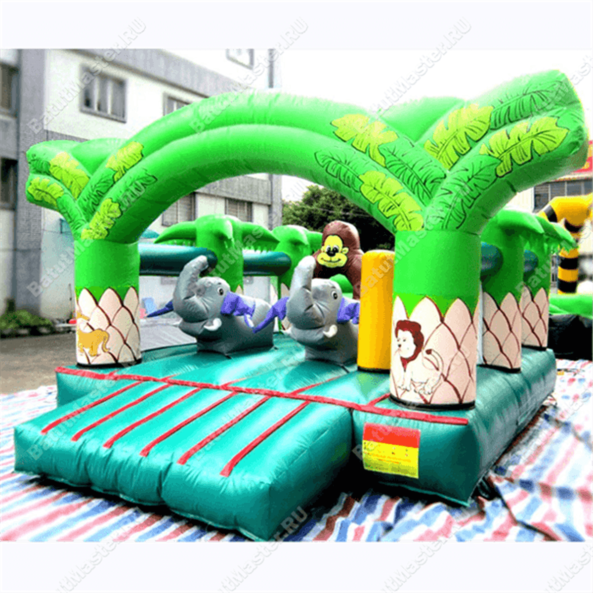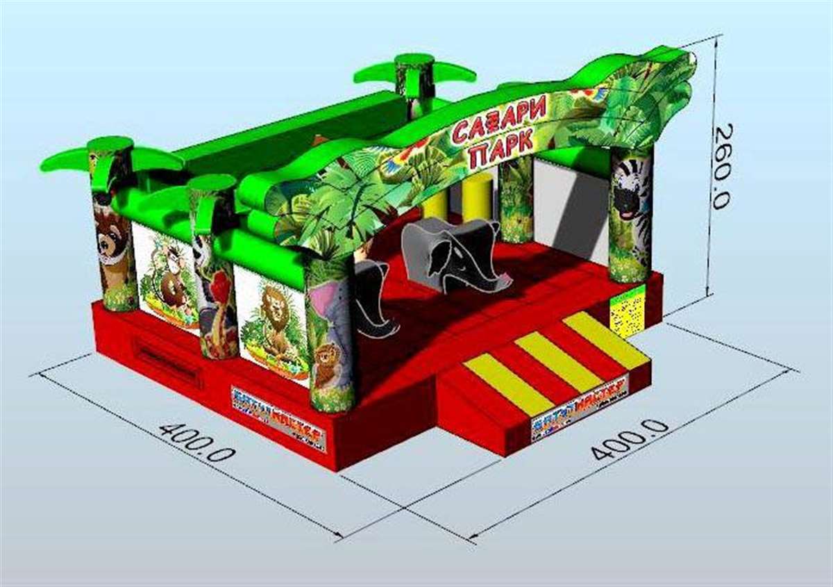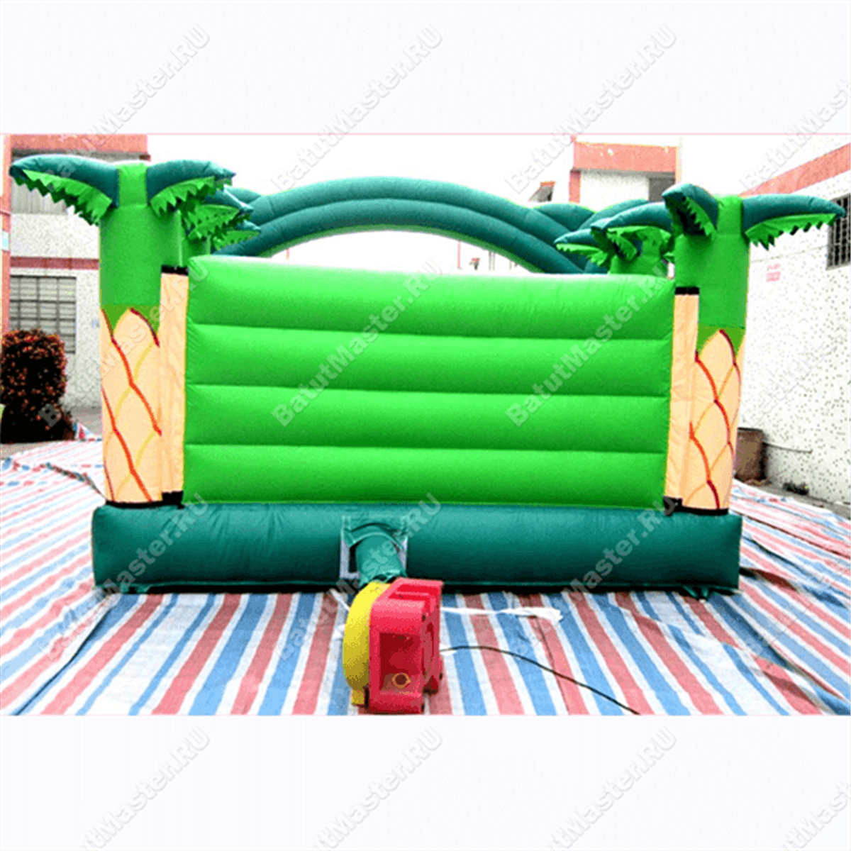 Надувной батут с размерами 4 на 4 м выполнен в виде простой коммерческой площадки, предназначенной для детей самого раннего возраста. Аттракцион внутри имеет 5 надувных фигур, 2 из которых – слоники, третья – вертикальное кольцо с изображением обезьяны и еще 2 желтых столбика. Тематика площадки – Сафари парк, поэтому кроме животных из Африки мы можем наблюдать еще один элемент жаркого континента – высокие пальмы, выстроившиеся в ряд строго по периметру батута. Фасадная стенка полностью отсутствует, а задняя изготовлена в виде высокого надувного элемента зеленого цвета. Чтобы коммерческий аттракцион был просматриваемым и пропускал воздух, основная часть его стен – это сетка, прикрепляемая к высоким пальмам. Также сетка может быть заменена на прозрачную пленку. В нашем производстве были изготовлено несколько данных моделей, но в разных интерпретациях: с яркими рисунками животных на фасадной стороне, с дополнительными желтыми столбиками внутри батута, с разноцветной нижней площадкой или с русскоязычным названием. Все модификации можно просмотреть в фото галереи данной модели батута для бизнеса.
