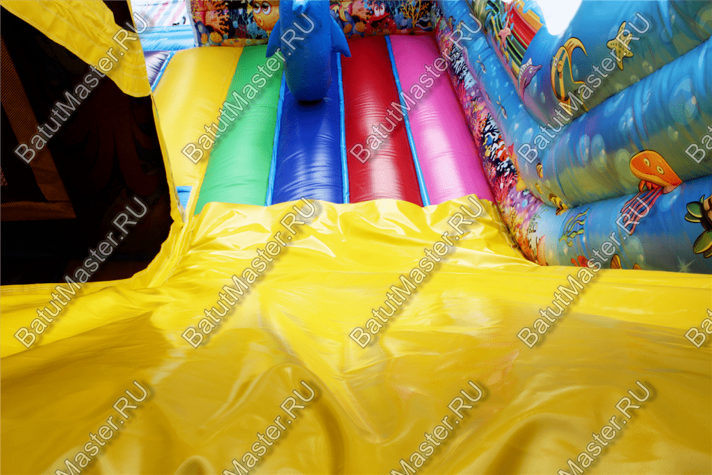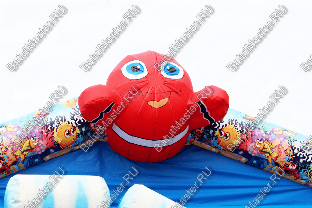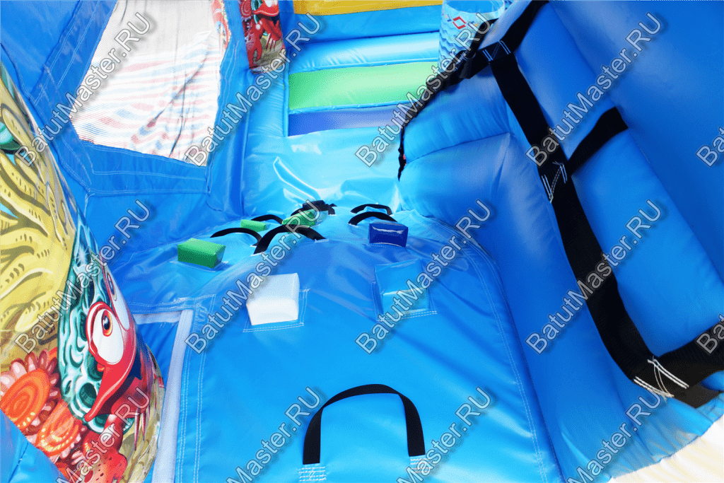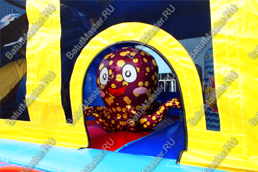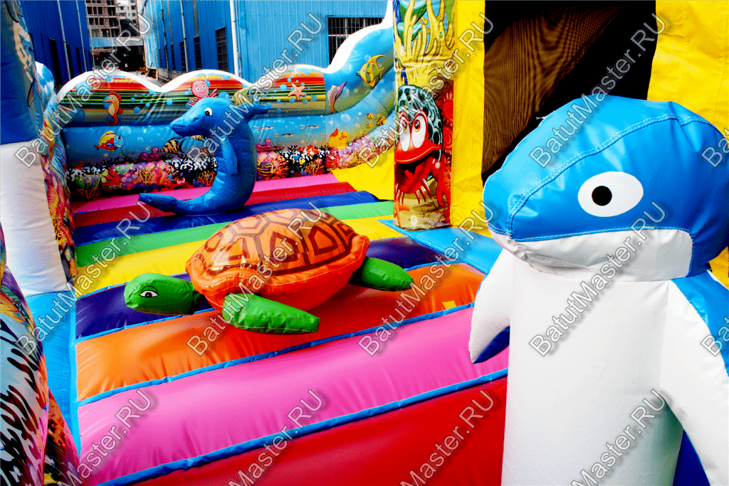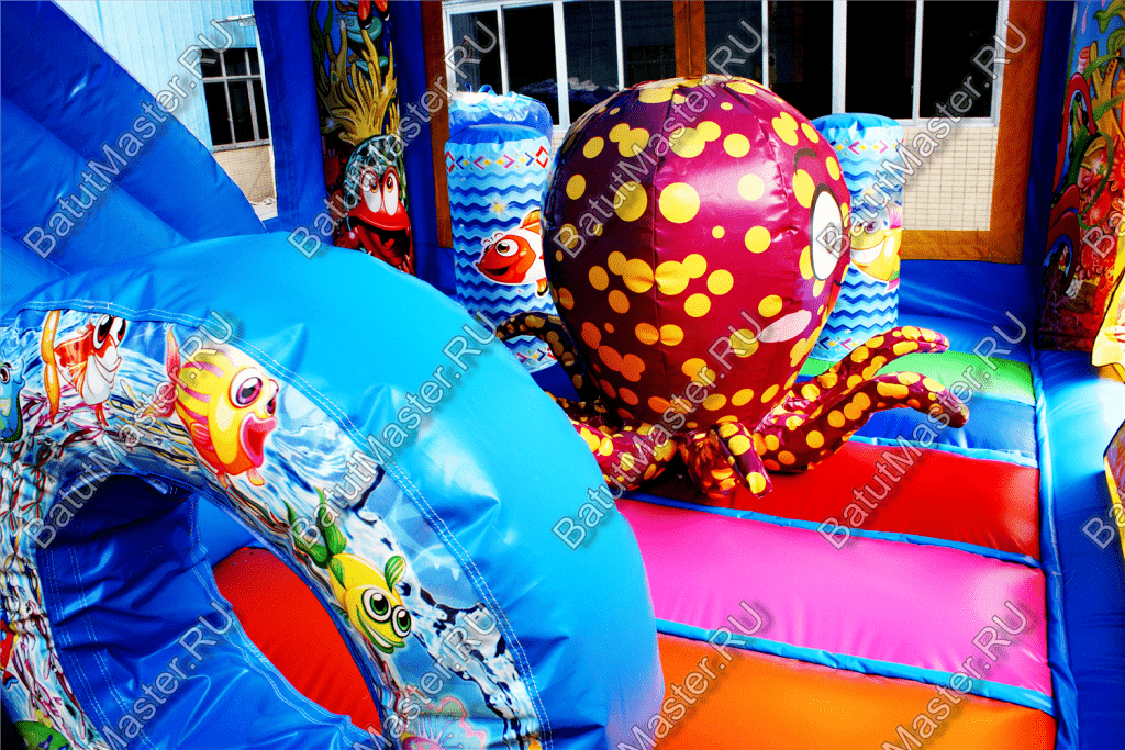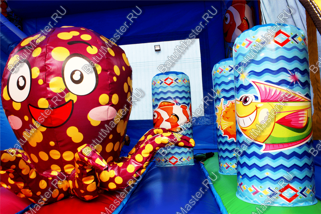 Пройдя внутрь и предварительно перед этим сняв обувь, детей встретят красочные морские обитатели. Выглядят они красиво и завораживающе, кажется, будто они настоящие. Ребята могут сразу же уйти кататься с небольшой горки, на которую можно залезть по лестницам со специальными вспомогательными креплениями, или же они могут пройти внутрь батута со стенками в виде сетки и просто попрыгать на нём. Там тоже будут надувные фигурки морских животных, которые непременно понравятся детям.