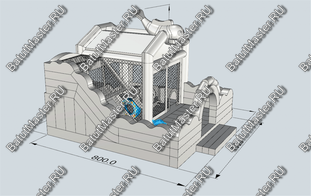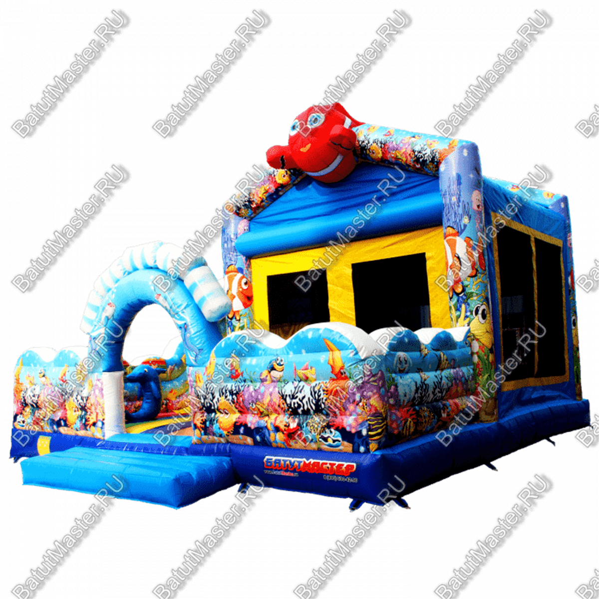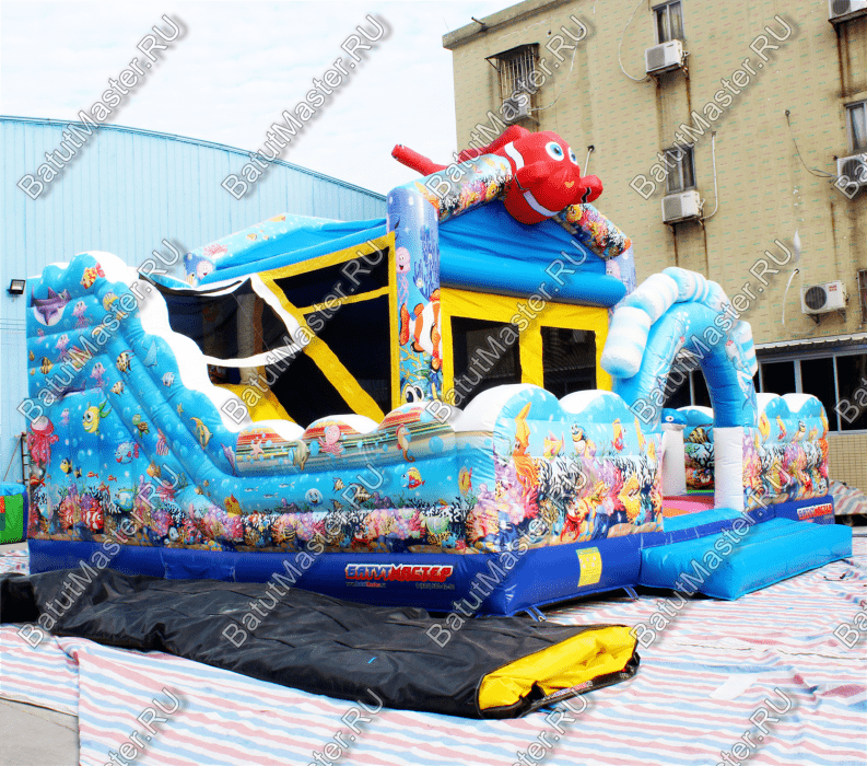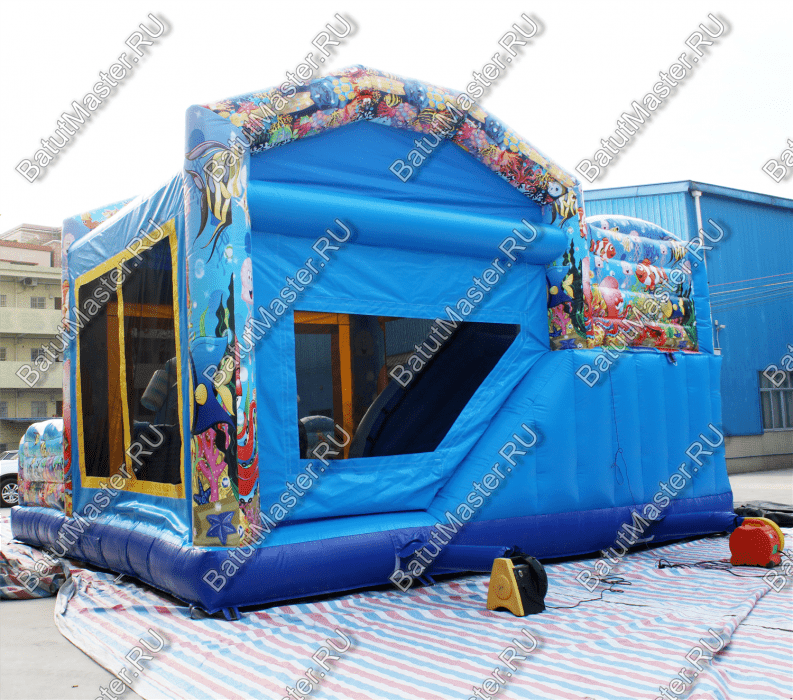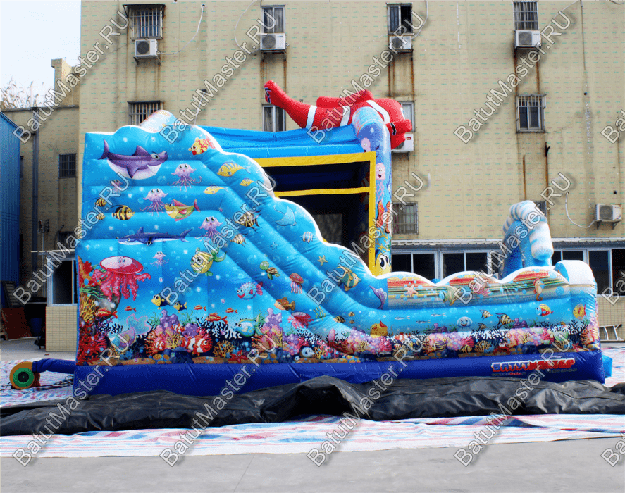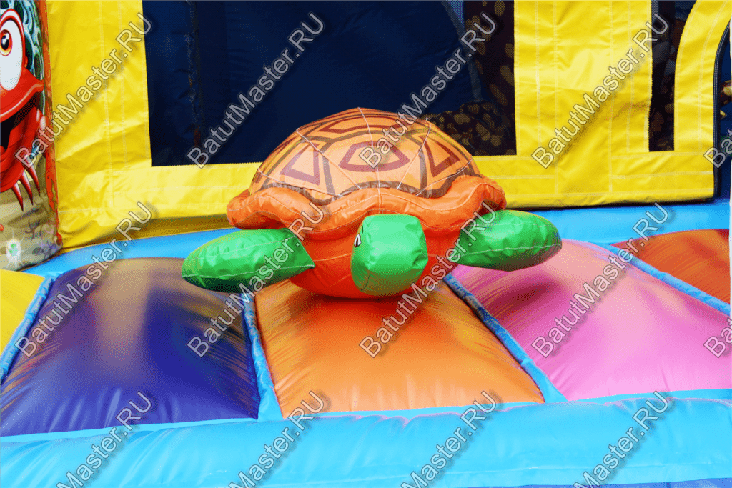 Пройдя внутрь и предварительно перед этим сняв обувь, детей встретят красочные морские обитатели. Выглядят они красиво и завораживающе, кажется, будто они настоящие. Ребята могут сразу же уйти кататься с небольшой горки, на которую можно залезть по лестницам со специальными вспомогательными креплениями, или же они могут пройти внутрь батута со стенками в виде сетки и просто попрыгать на нём. Там тоже будут надувные фигурки морских животных, которые непременно понравятся детям.