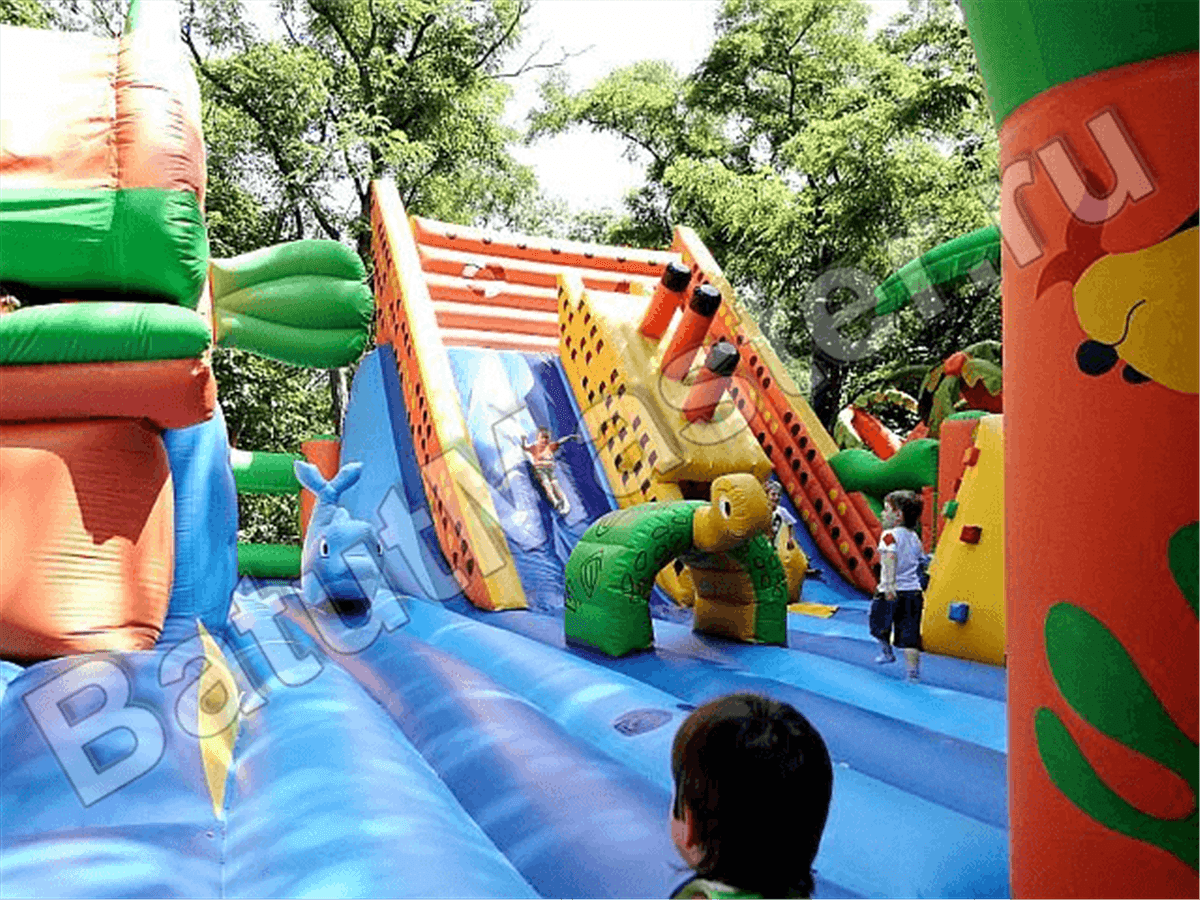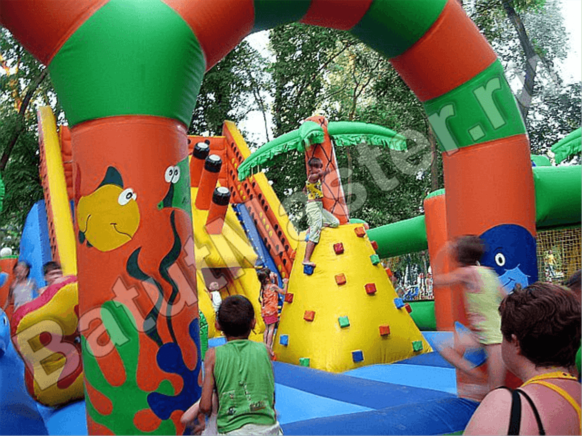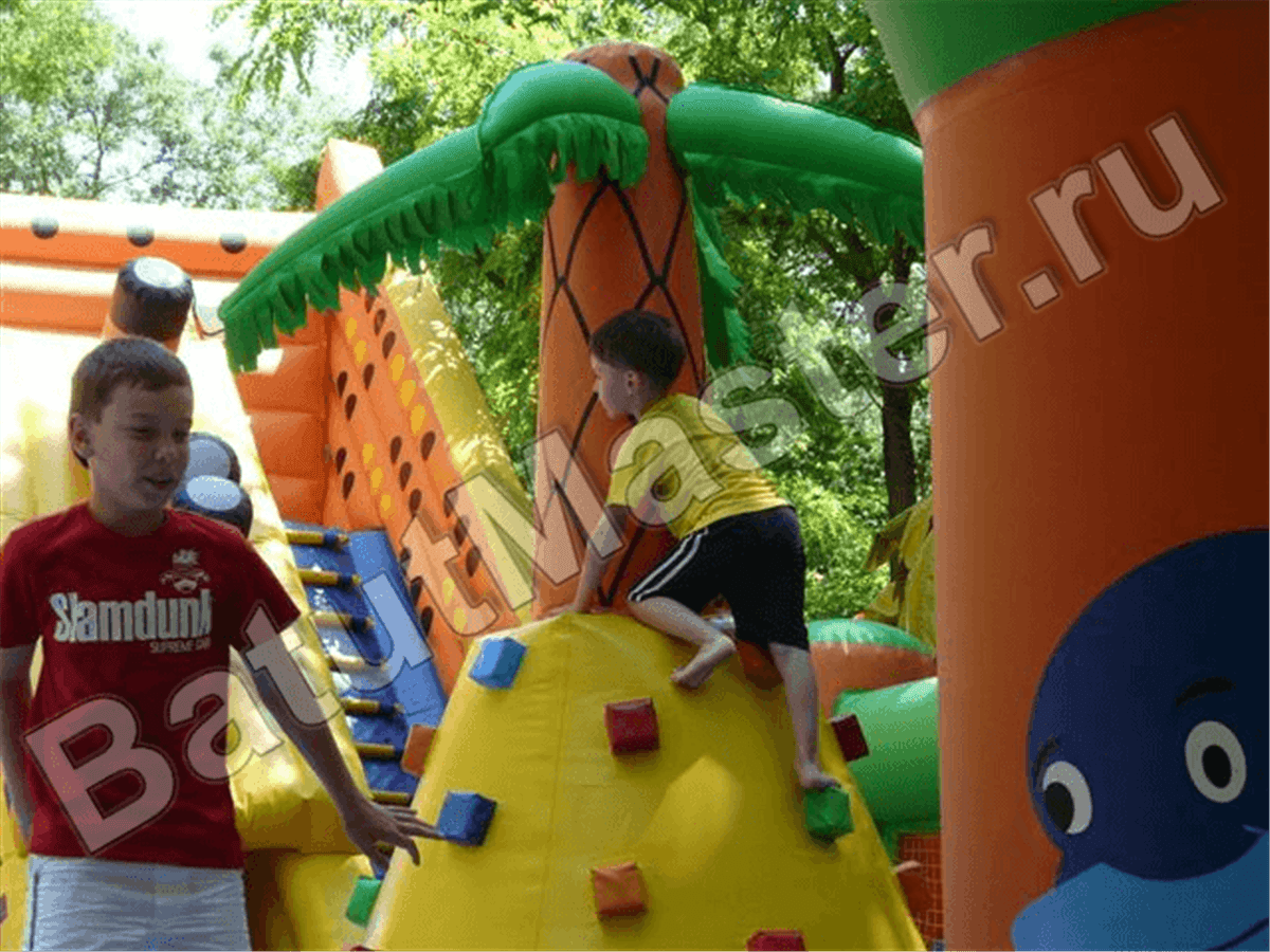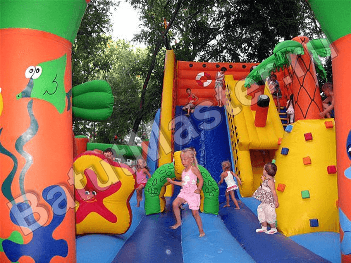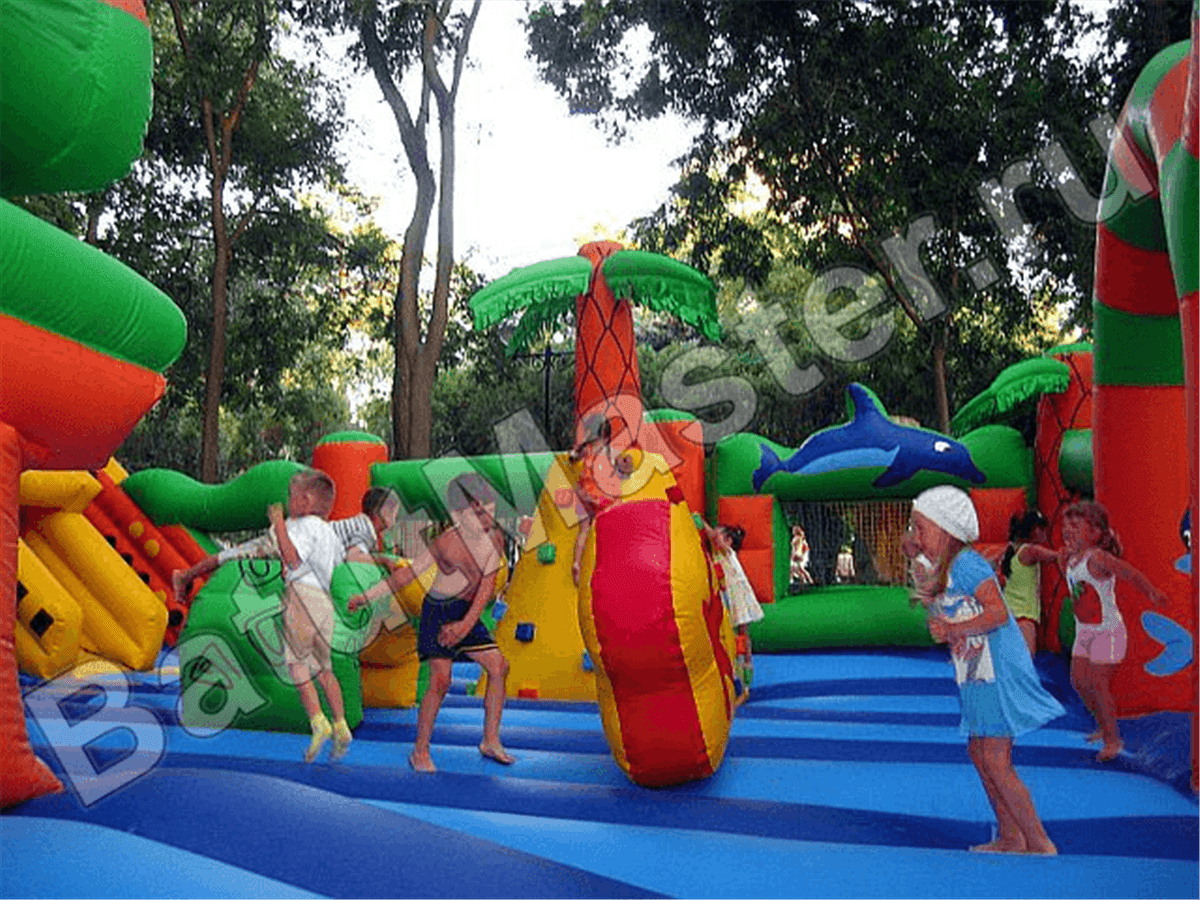 Вход внутрь комплекса двойной из арочных надувных перекрытий, впереди установлен надувной порожек безопасности. Попадая в центральную зону, слева малыши видят огромную надувную рыбку, внутри которой можно прыгать самым маленьким деткам. Конструкция батута позволяет сделать голову рыбки подвижной, что приведет малышей в еще больший восторг. Правая сторона отведена для высокого скалодрома в виде надувной пирамиды с пальмой наверху. По всему периметру мягкой зоны установлены разные спортивные снаряды – мягкие перекрытия в виде тоннелей, фигурки животных и пр.