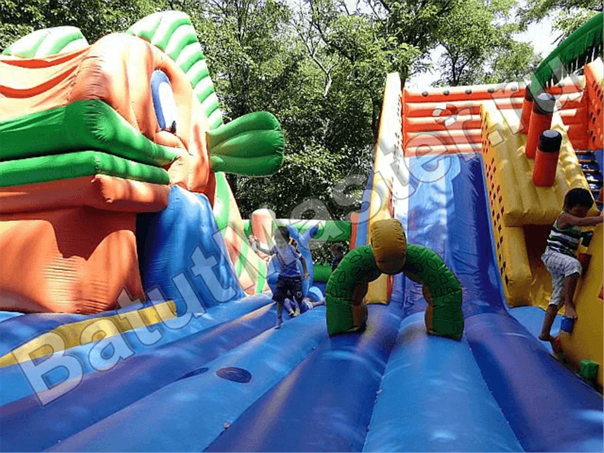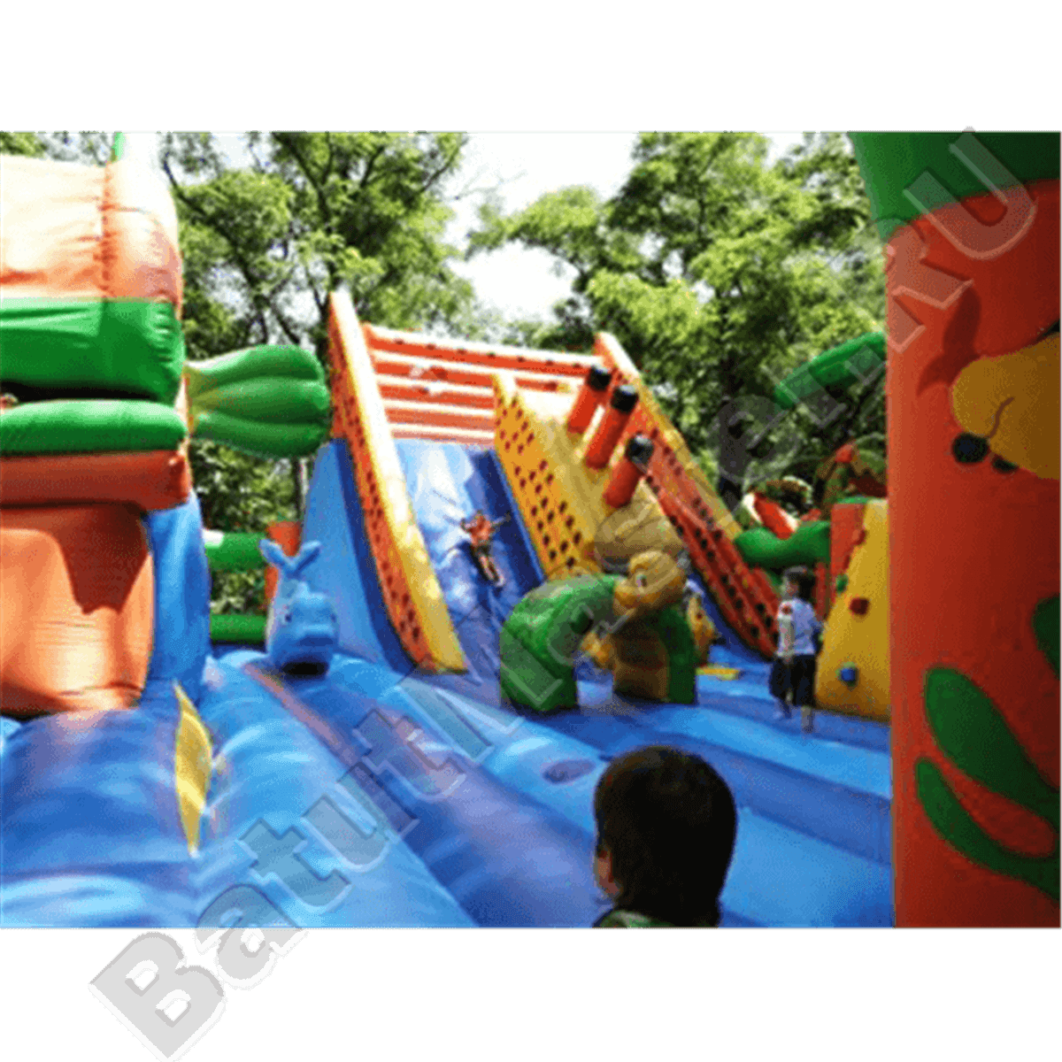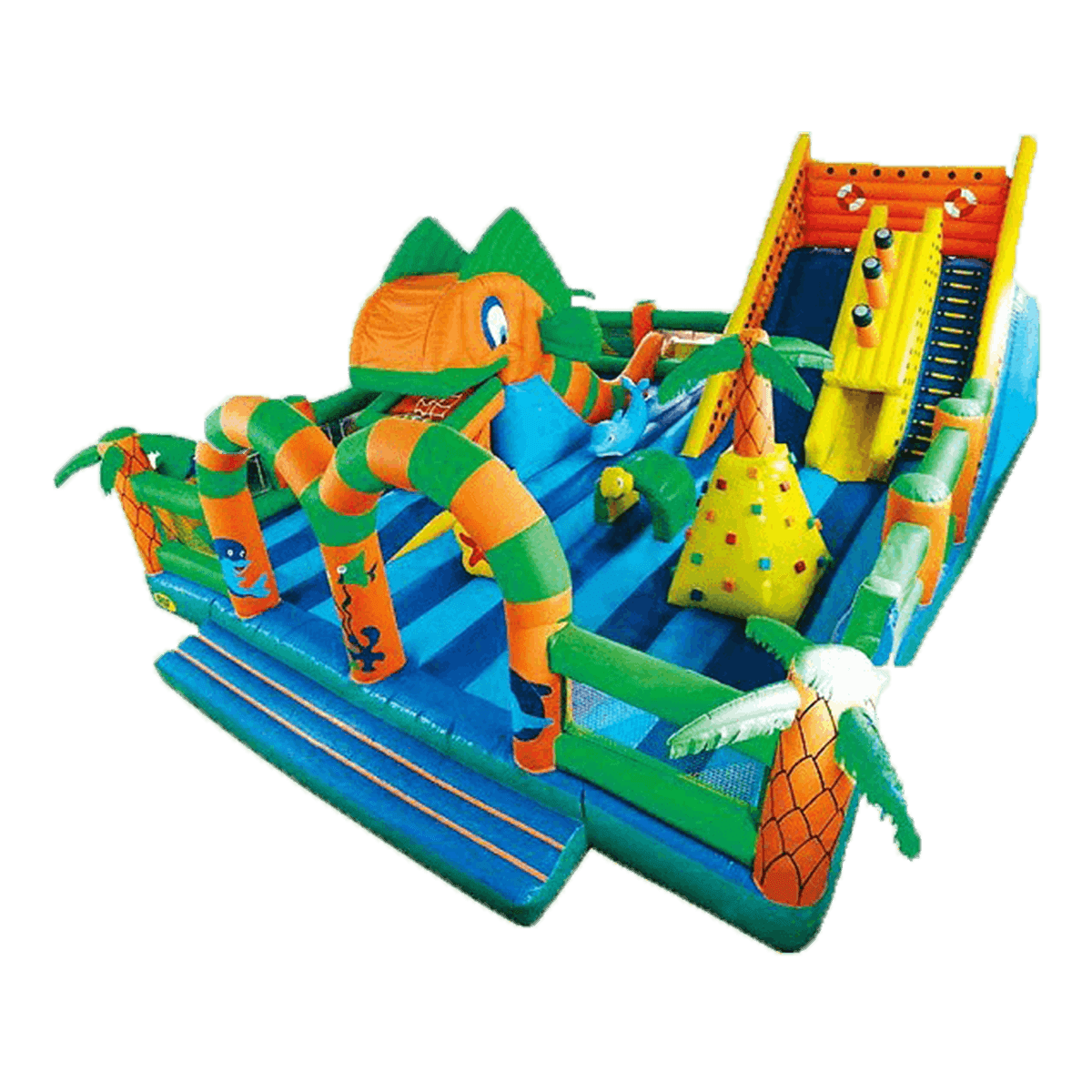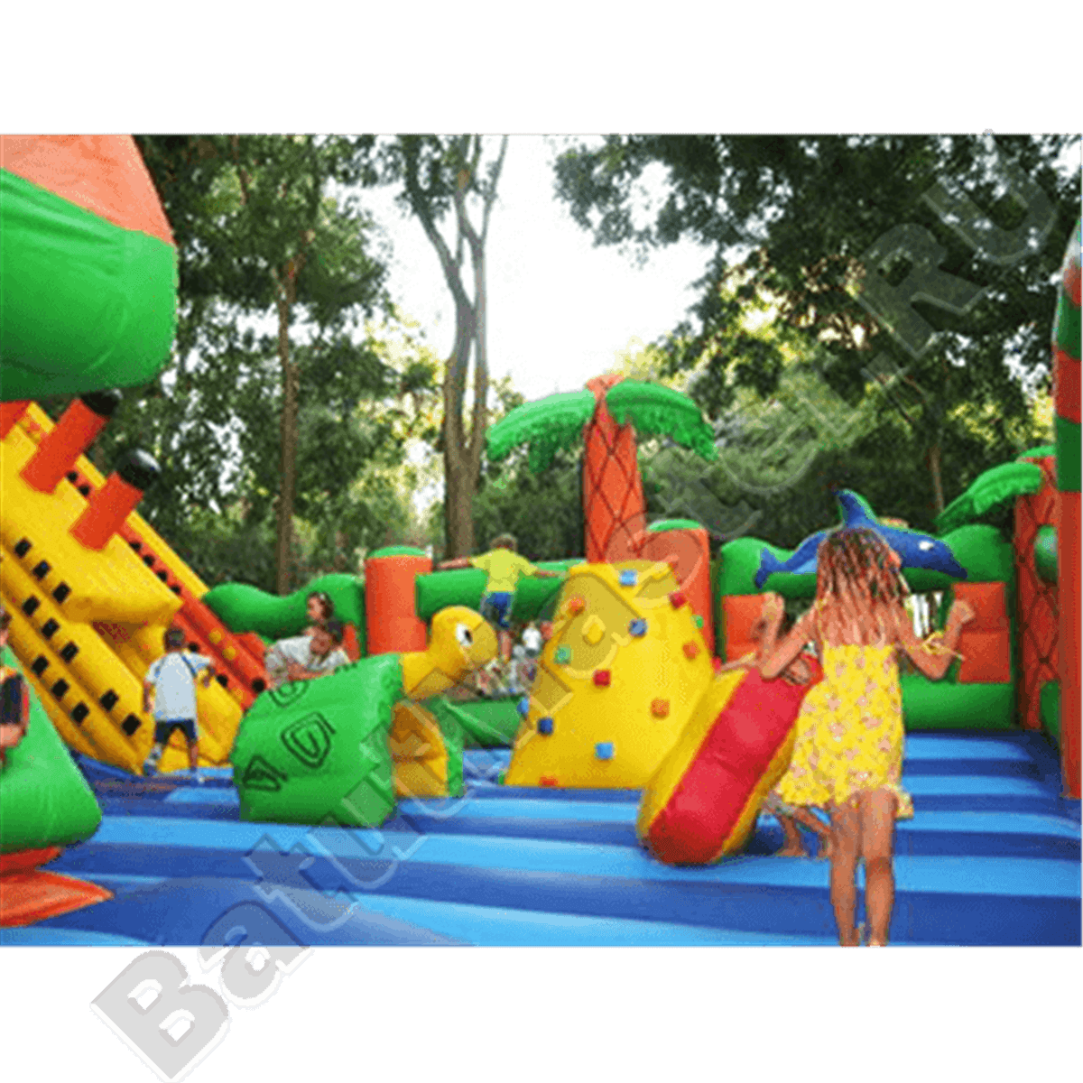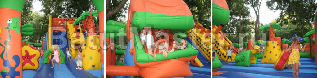 Вход внутрь комплекса двойной из арочных надувных перекрытий, впереди установлен надувной порожек безопасности. Попадая в центральную зону, слева малыши видят огромную надувную рыбку, внутри которой можно прыгать самым маленьким деткам. Конструкция батута позволяет сделать голову рыбки подвижной, что приведет малышей в еще больший восторг. Правая сторона отведена для высокого скалодрома в виде надувной пирамиды с пальмой наверху. По всему периметру мягкой зоны установлены разные спортивные снаряды – мягкие перекрытия в виде тоннелей, фигурки животных и пр.