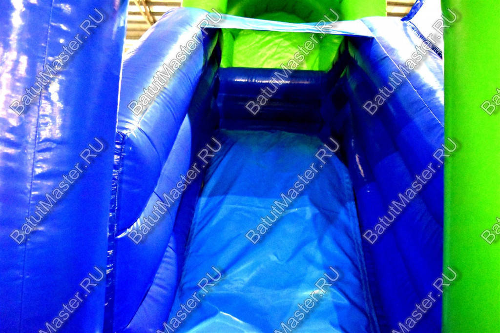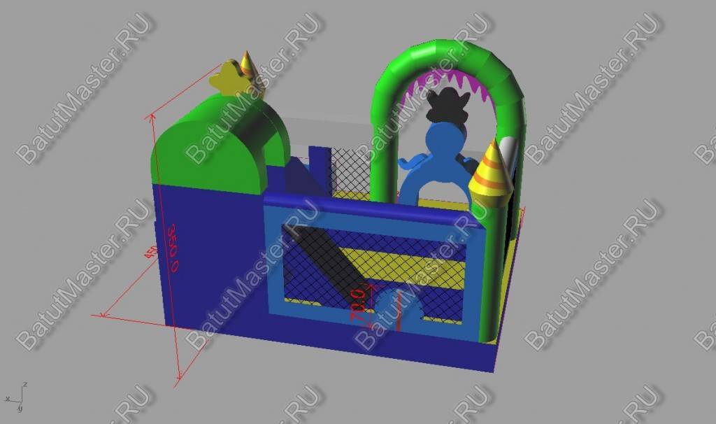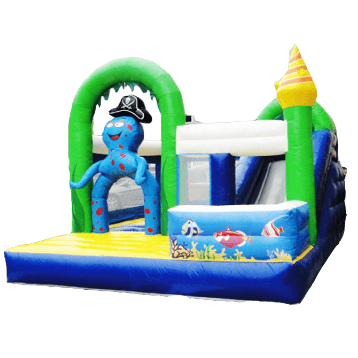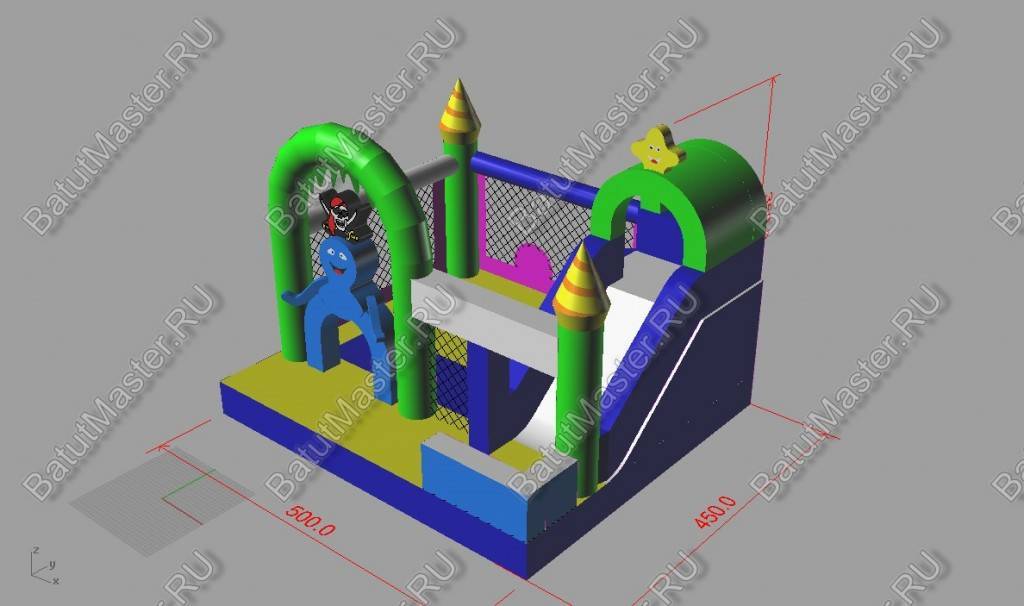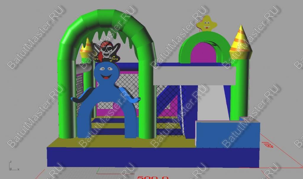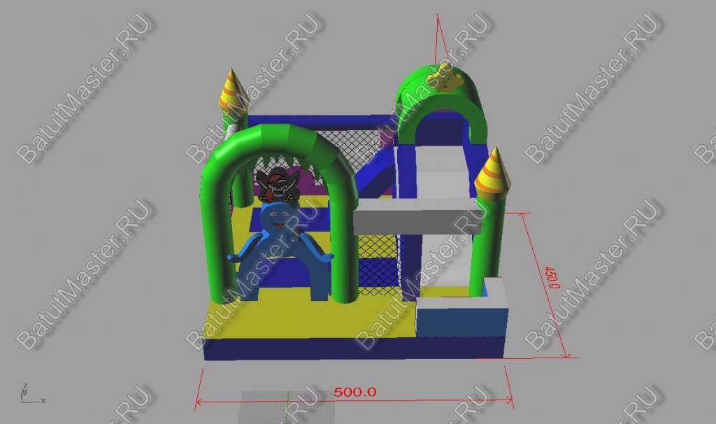 Вход в батут выглядит, как зеленая надувная арка с импровизированными остатками свисающих водорослей. Внутри входа стоит огромный осьминог, и преодолеть его можно будет только лазанием через промежуток пространства между его «ногами». Дальше начинается сама непосредственная площадка, ведущая к горке. Весьаттракцион для парка выполнен в трех основных цветах – зеленый, синий и желтый. Последний встречается только в качестве полового окраса. Внешние стороны и борта батута – стандартно синие.