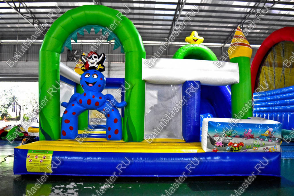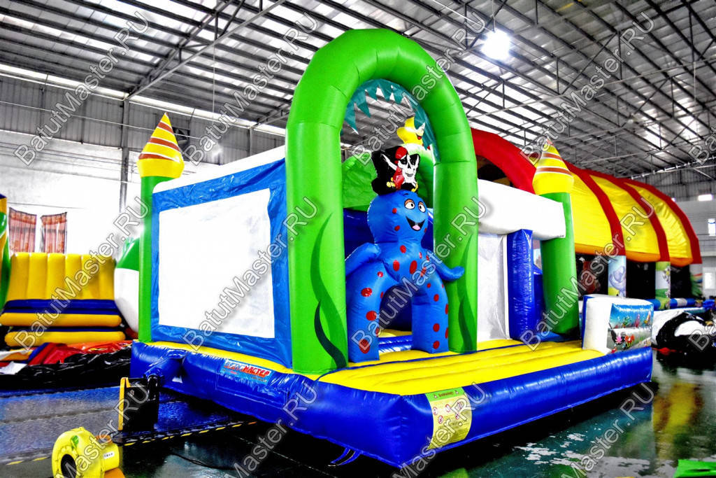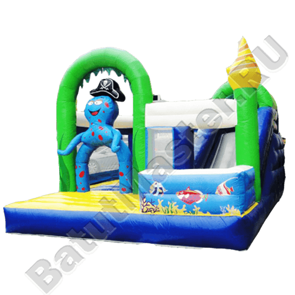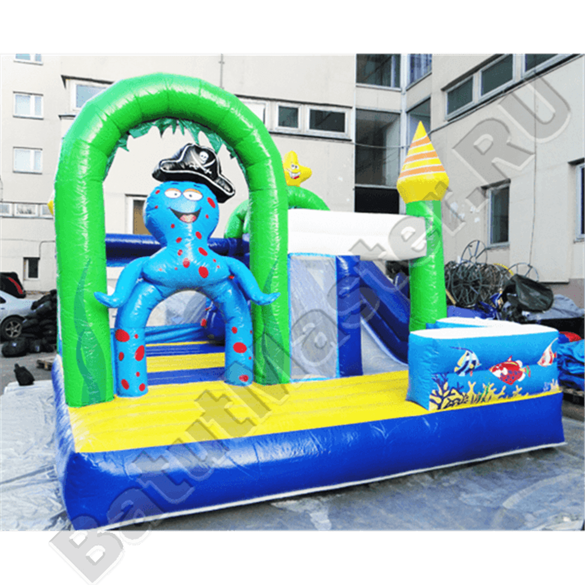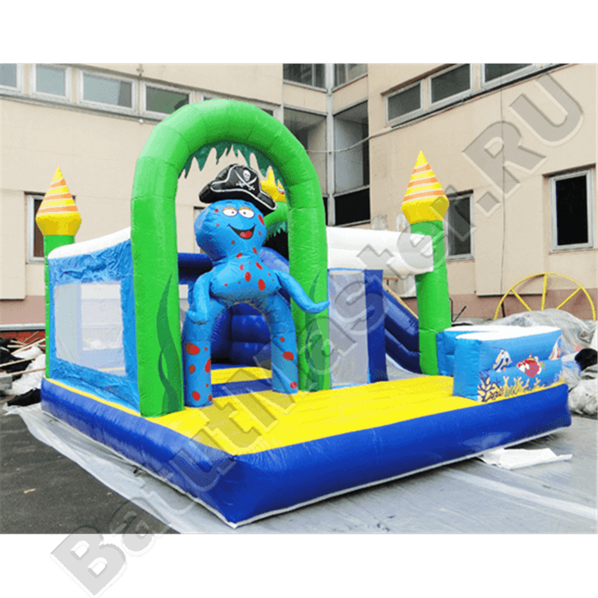 Надувной батут "Осьминог" очень функционален и красив. Сочетает в себе площадку для прыжков и горку - всё, что нужно детям, чтобы порезвиться!. Надувной аттракцион оснащен защитной сеткой, которая поддерживает детей, не давая выпасть с батута, а также благодаря ей родители могут видеть своих детей. На ступеньке безопасности имеется защитный бортик, чтобы дети при катании на горке не выпали из батута. Необычные фигурки из мультфильмов будут поддерживать веселое настроение ребятишек. По Вашему желанию, мы можем изменить фигурки внутри батута, раскрас, цвет, форму и размер.