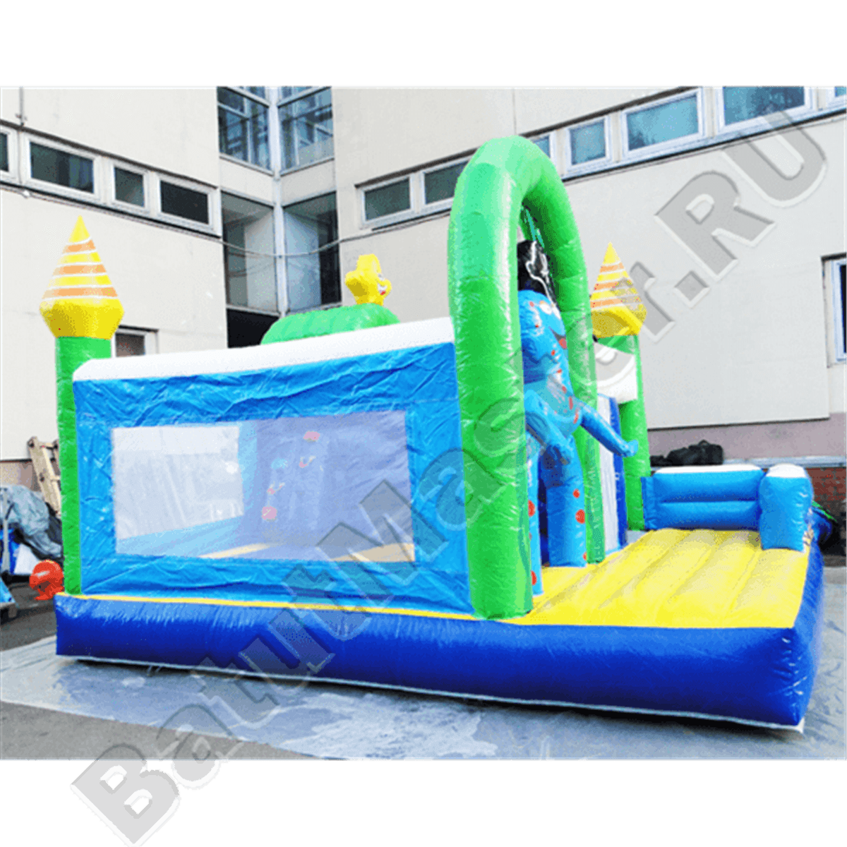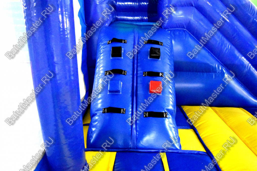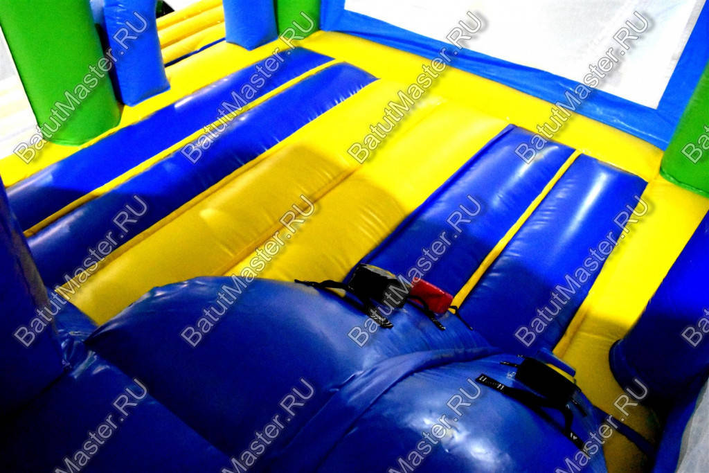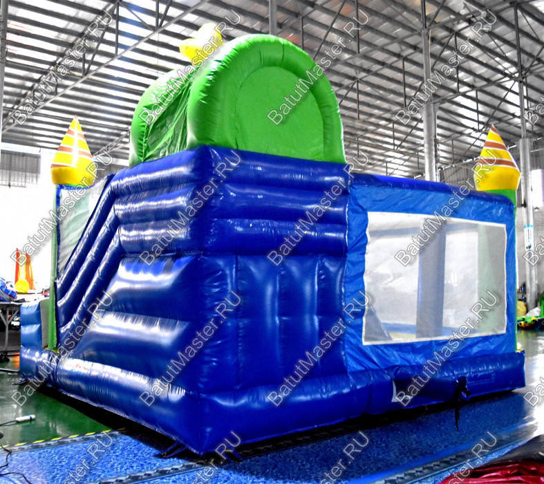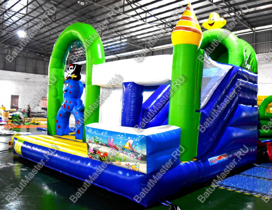 Подушка безопасности для горки изображает морских рыбок, это напоминает о морской тематике. Прыгающая поверхность и горка одновременно позволяют привлекать множество клиентов и получать высокий доход.