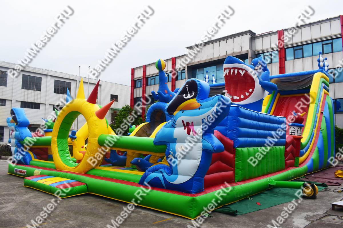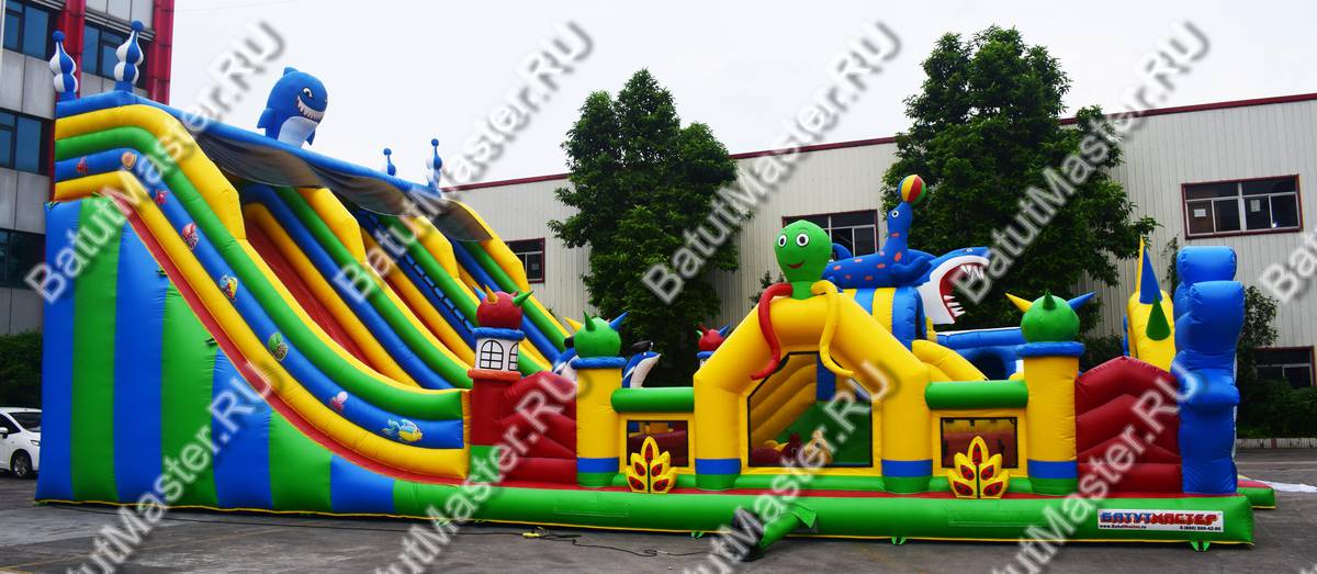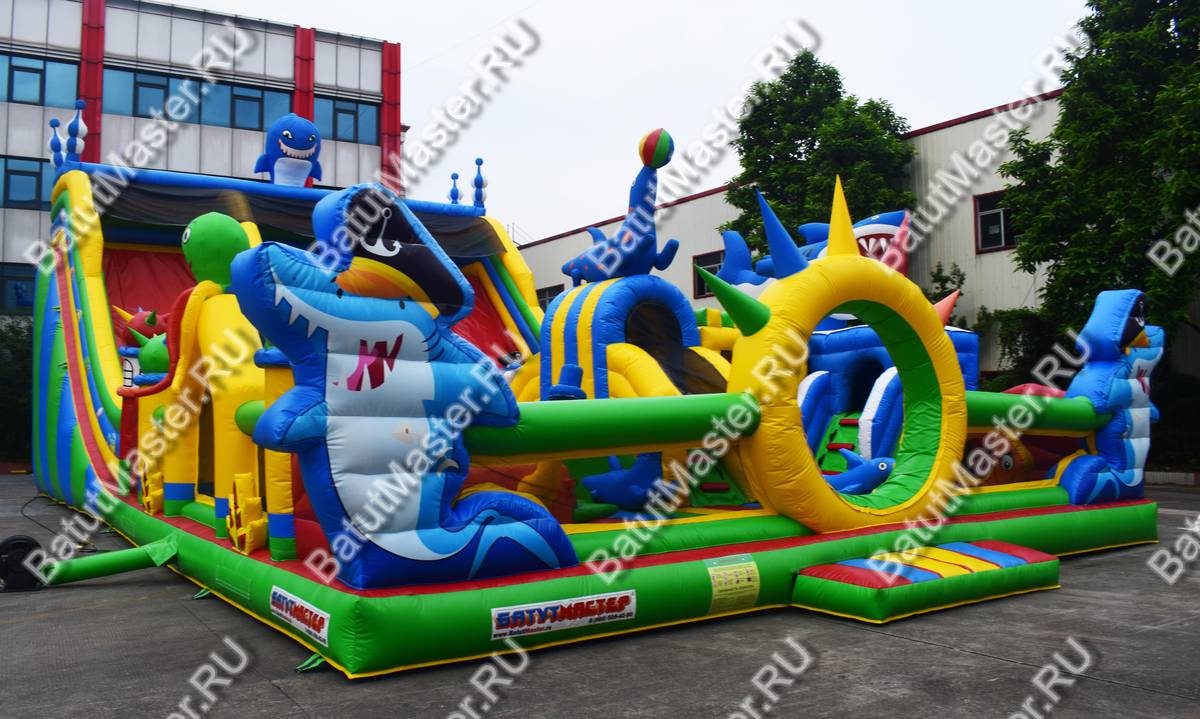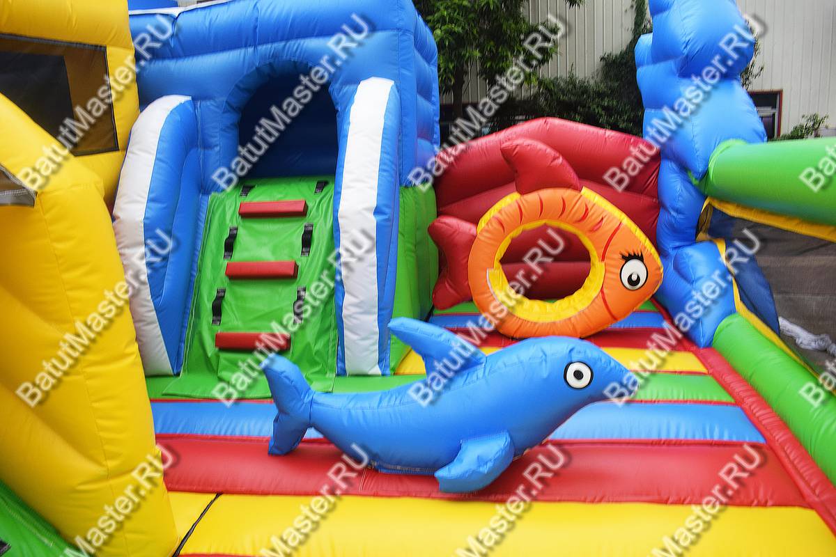 Надувной батут в данной модификации заинтересует детей разного возраста. Ему есть чем удивить. Огромные забавные фигуры в виде акул, осьминогов и морских котиков являются настоящим украшением такого батута. Все вокруг яркое и притягивает взгляд. Здесь есть широкая горка, с которой можно скатиться всей командой одновременно, небольшая черепаха, на которую можно забираться и качаться. Для самых маленьких есть, надувая карусель и небольшая горка. Огромное прыжковое поле позволит кувыркаться, бегать и придумывать различные игры.