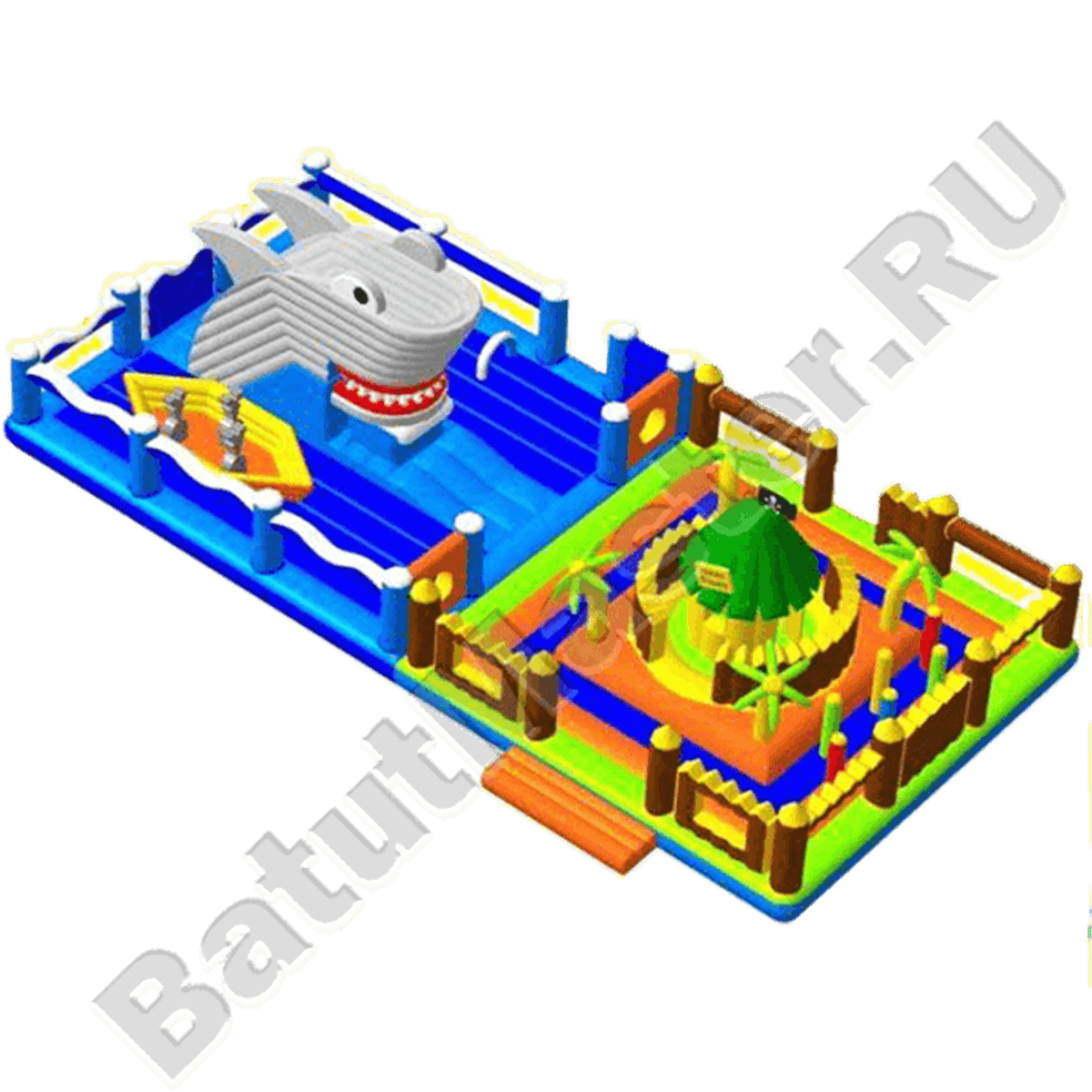 Это не просто очень большой батут, а огромная площадка детского удовольствия, где может поместиться больше десятка детишек одновременно. Одна часто исполняет роль морского побережья со злой акулой, а вторая – яркий песчаный остров, скорее всего с проживающим на нем древним племенем, посреди которого и стоит бунгало. Играть на такой платформе можно часами, придумывая разные истории и весело подпрыгивая. Для владельца дизайн батута и вместительность – гарантия бизнес успеха.