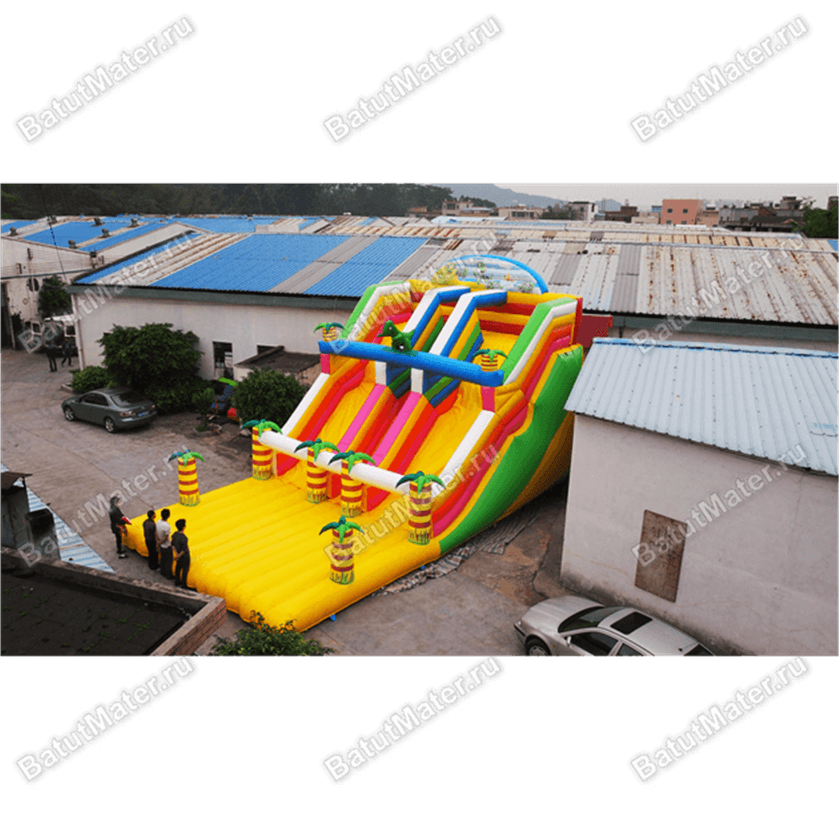 На нижней части для игр расположились 6 забавных пальм, поэтому еще на входе создается впечатление, что это настоящая Африка со своими приключениями. Высокая горка разделена на 2 спуска, а между ними узенькая лестница наверх с яркими цветными ступеньками. В самом центре подъема, на синей перекладине, гостей встретит настоящий, но надувной динозавр, пытающийся напугать. На самом верху выполнена полукруглая стена, где изображены животные из жарких стран.