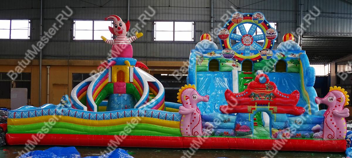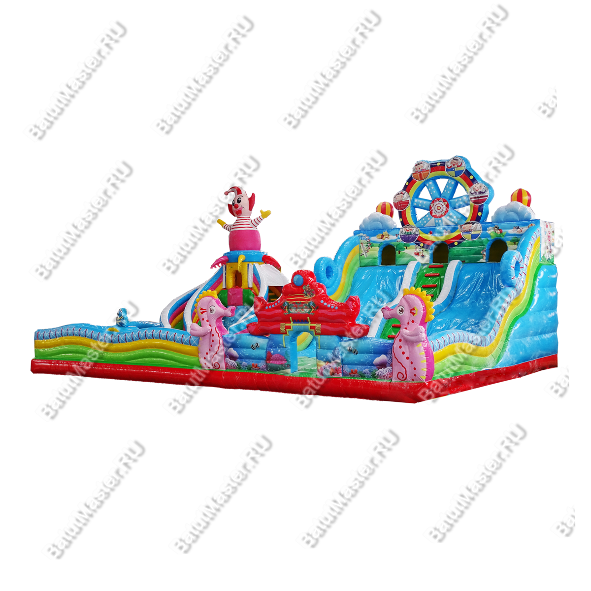 Коммерческий надувной батут «Парк развлечений» будет притягивать детей словно магнит, ведь он выглядит как настоящий парк развлечений. Декорации аттракциона передают всю атмосферу красочных парков, где тут и там виднеются шумные развлечения. Есть тут и большое колесо обозрения, пусть и декоративное.