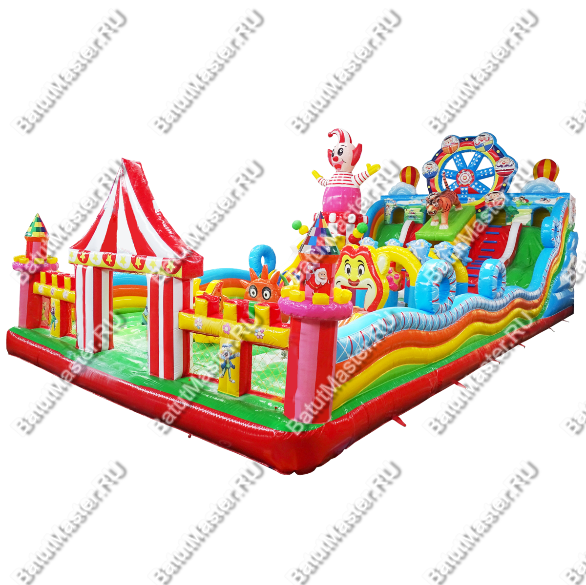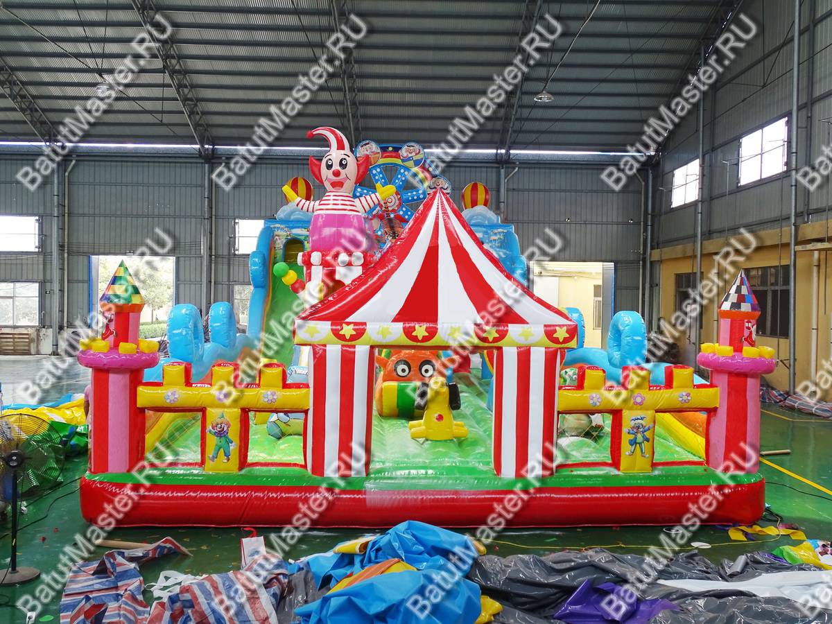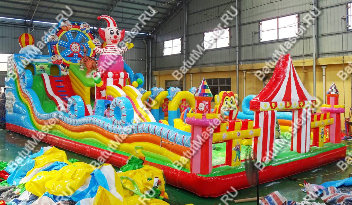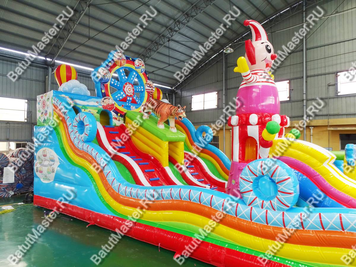 Начало коммерческого аттракциона весьма заманчивое – фасад цирка шапито с прозрачными боковыми стенами и зубчатой поверхностью надувного ограждения. Боковые стороны – разноцветные многоярусные полосы ПВХ, напоминающие морские волны с оригинальными круглыми элементами сверху. Центральная часть прыгательной площадки полностью принадлежит высокому надувному клоуну, стоящему на барабане, из которого выходит горка. С обеих сторон от клоуна располагаются самые разнообразные фигуры: арки, тоннели, невысокие горки, сороконожки и т. д. Как только все эти центральные элементы будут изучены, можно приступать к покорению самой важной части батута – горки у задней стенки.