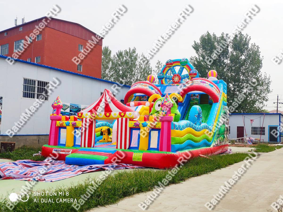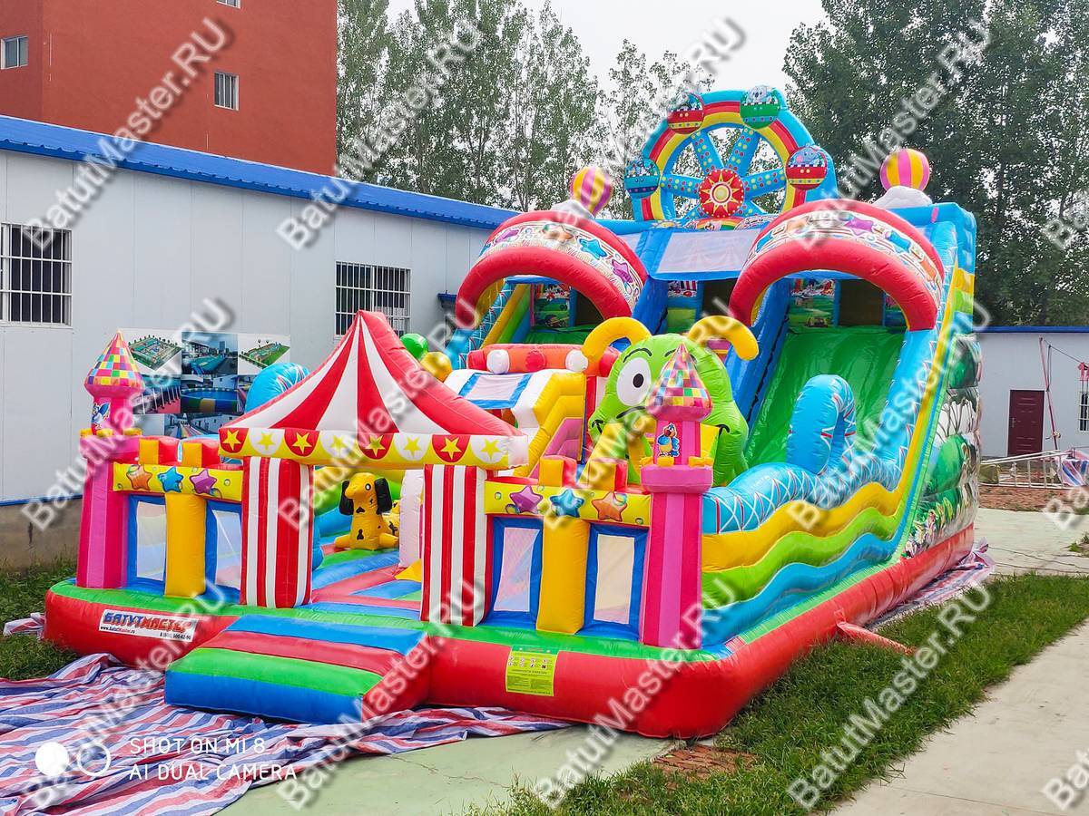 С первого взгляда батут привлекает внимание оригинальным дизайном и яркой цветовой палитрой. Входная часть оформлена в виде старинной крепостной стены с причудливыми башенками, украшенными звёздами и разноцветным мозаичным рисунком. Но самое интересное начинается дальше. За дверьми маленьких гостей ждёт весёлый цирковой балаган. Батут дополнен гигантскими надувными фигурами забавных животных, арками и другими архитектурными элементами. А за некоторыми из них скрываются увлекательные развлекательно-игровые снаряды: горки, скалодром и т.д.