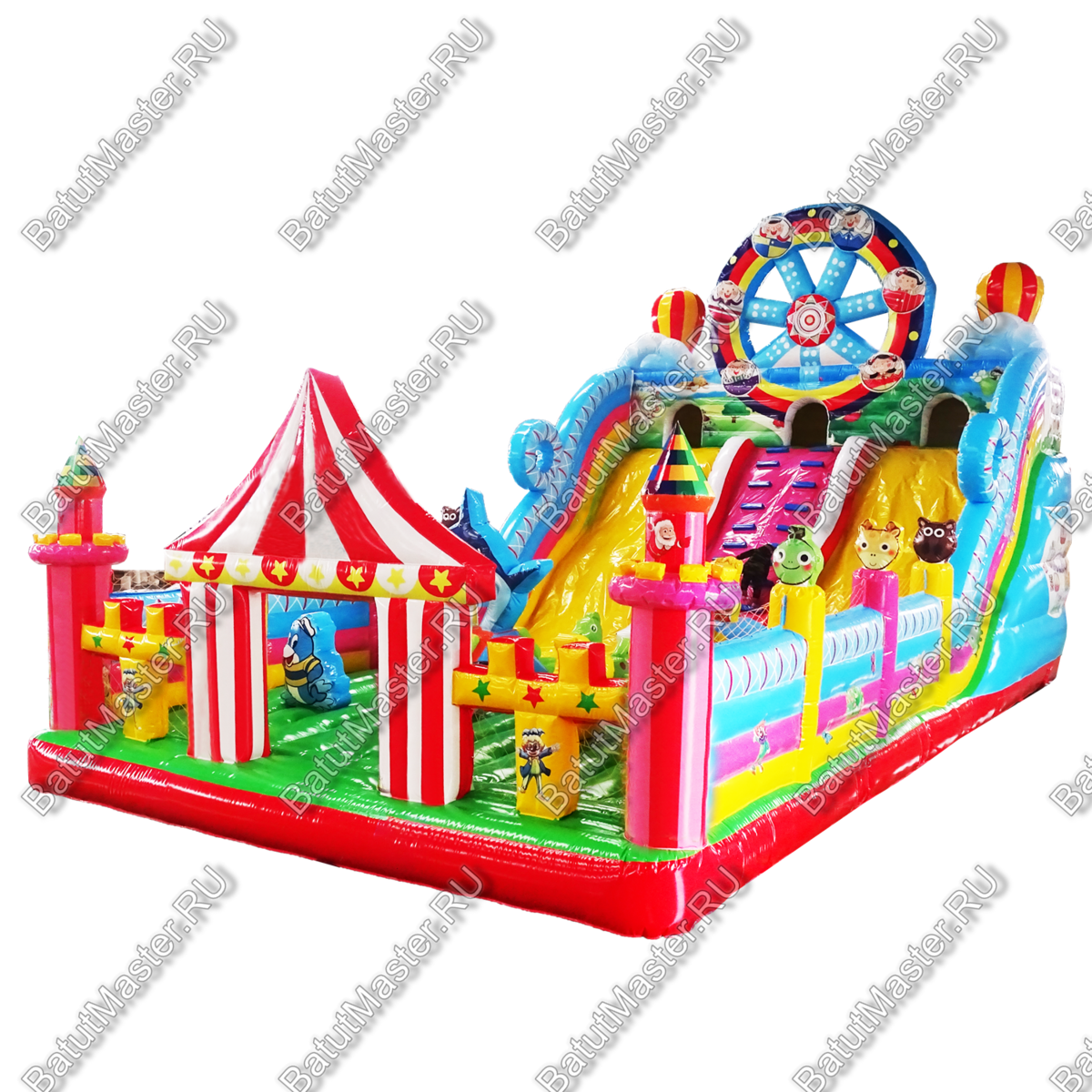 Батут «Парк развлечений» пестрит яркими цветами и потрясающими декорациями, которые передают атмосферу весёлого парка развлечений. Во время игры ребёнка будут сопровождать надувные фигуры забавных животных, весёлых человечков и различных аттракционов, в том числе и большая фигура колеса обозрения, что возвышается над батутом.
