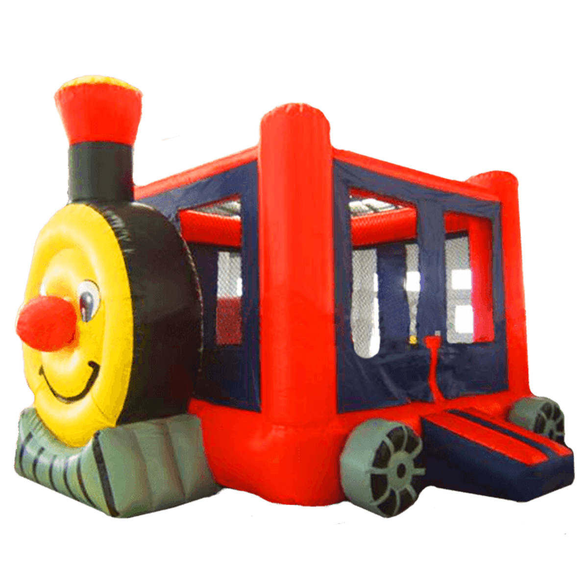 Этот уличный батут отличается от иных моделей своеобразным дизайном, развлекательный аттракцион выполнен в виде паровозика с веселым лицом-смайликом сбоку изделия. Надувные колесики внизу боковых сторон изделия придают аттракциону еще большую схожесть с настоящим паровозом. Вход внутрь имеет специальный надувной порог, который упрощает процесс залезания для малышей.