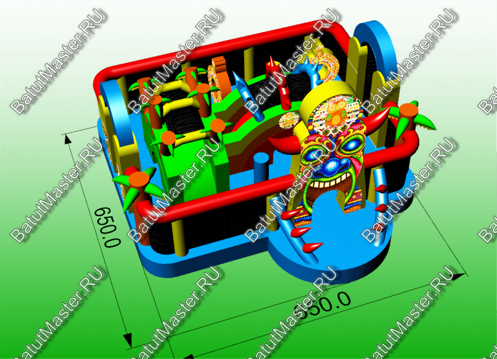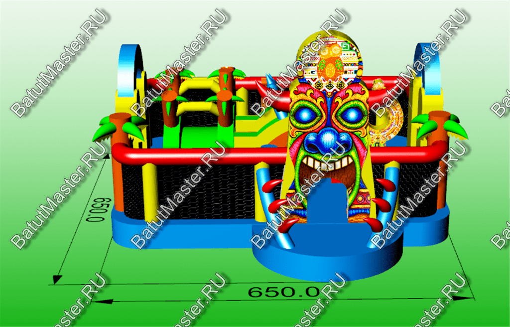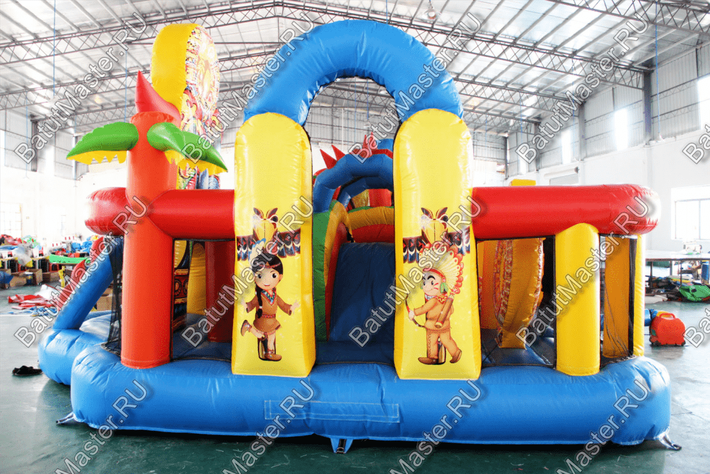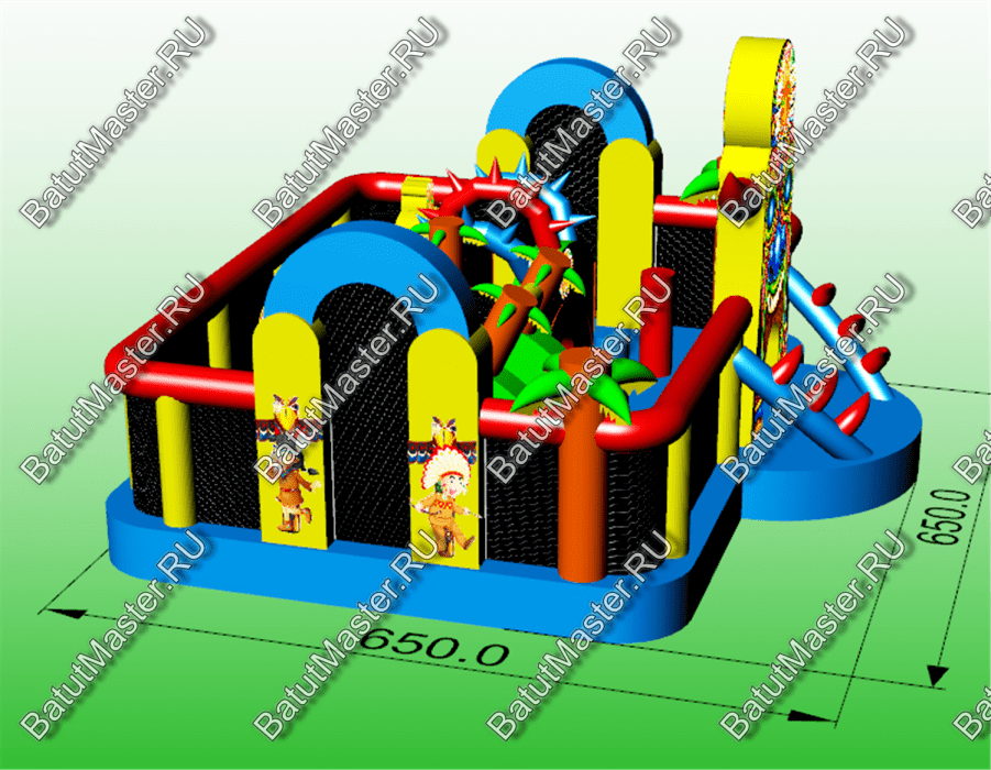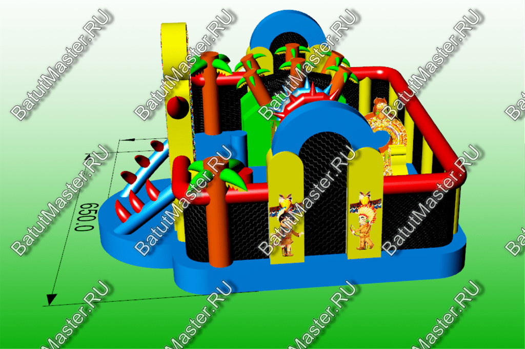 Яркие цвета оформили множество колонн-столбиков, которые усеяли площадку, стены по всему периметру обтянуты сеткой, по углам стоят огромные пальмы с сочными зелеными листьями. Игровые препятствия из ПВХ только помогают малышу еще веселее резвиться и прыгать. Две горки – ключевое развлечение для маленьких сорванцов, они выходят из самого начало и продолжаются вдоль всего аттракциона, для полной безопасности малышей обтянуты сеткой. С каждой стороны имеется огромное изображение индейских традиционных рисунков.