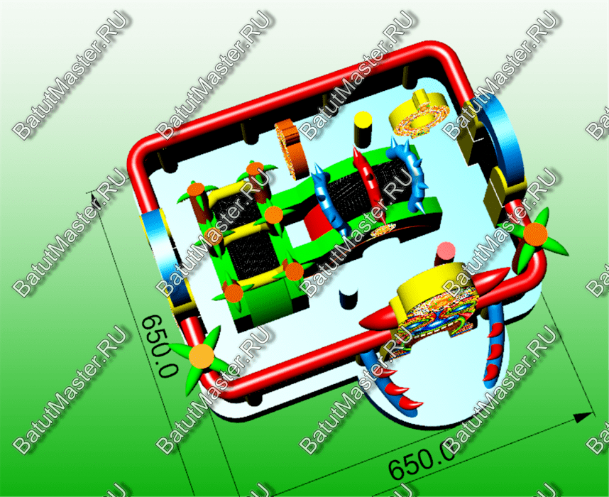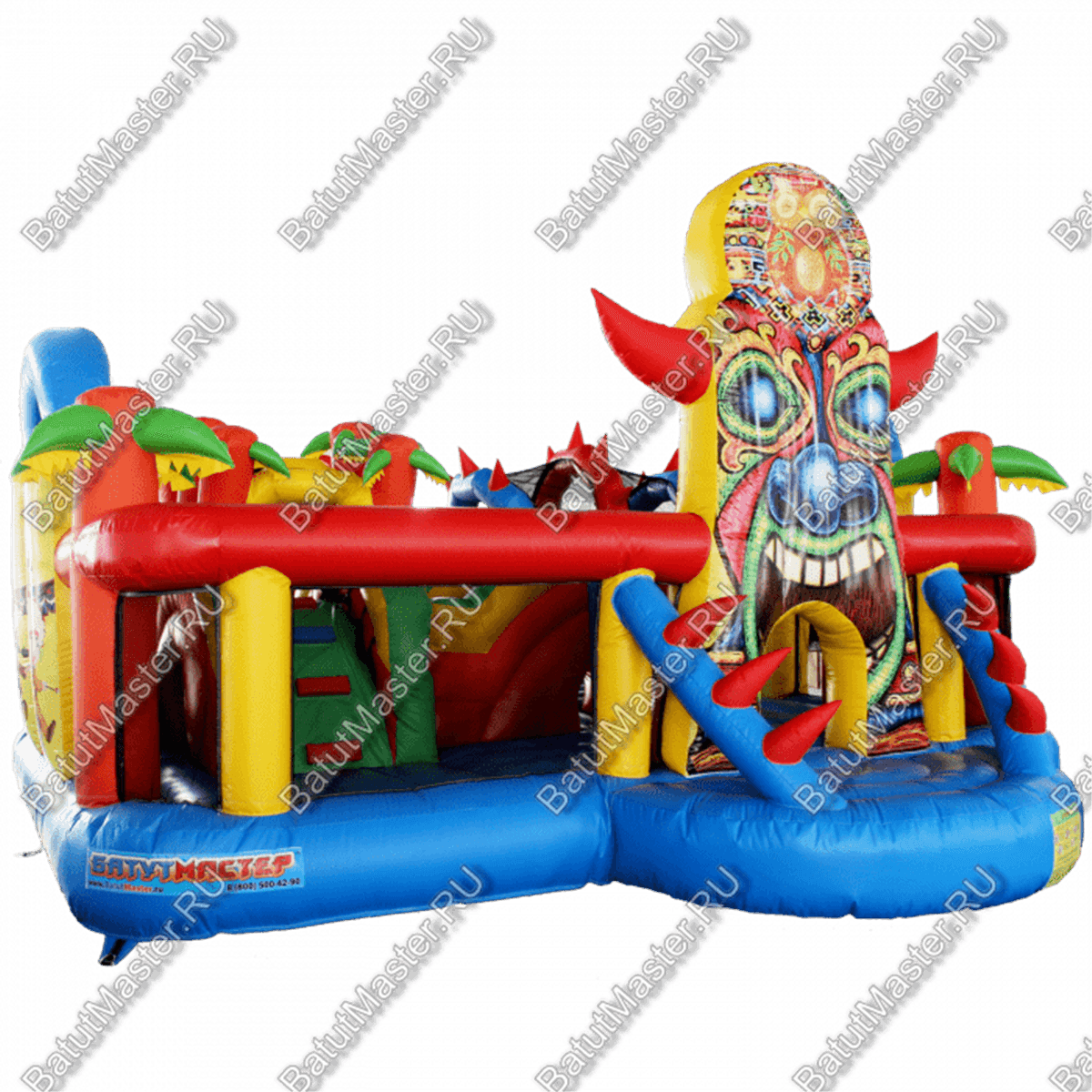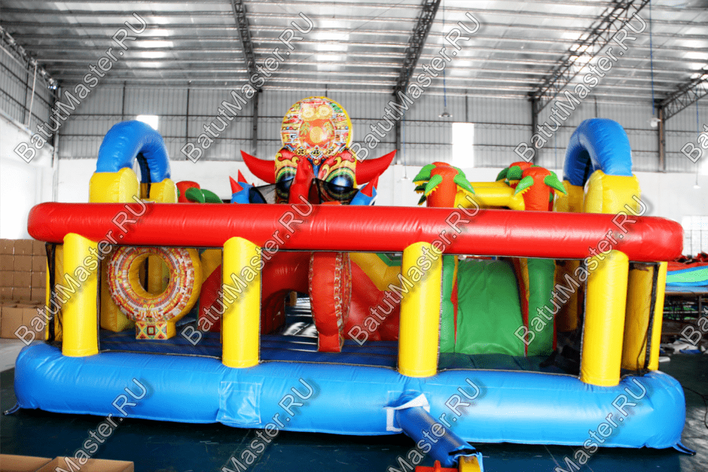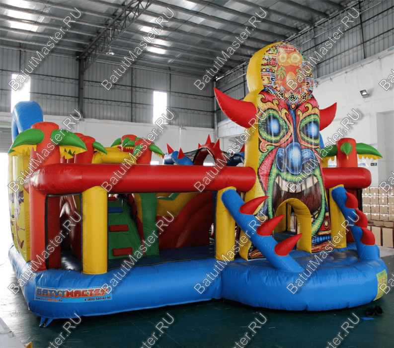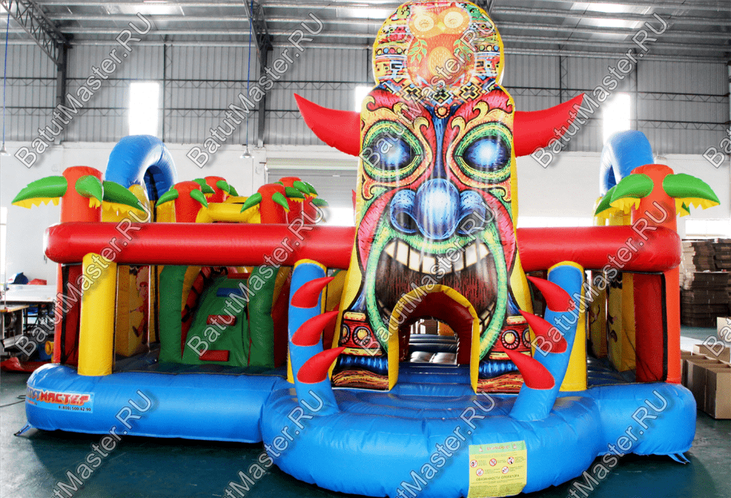 Яркие цвета оформили множество колонн-столбиков, которые усеяли площадку, стены по всему периметру обтянуты сеткой, по углам стоят огромные пальмы с сочными зелеными листьями. Игровые препятствия из ПВХ только помогают малышу еще веселее резвиться и прыгать. Две горки – ключевое развлечение для маленьких сорванцов, они выходят из самого начало и продолжаются вдоль всего аттракциона, для полной безопасности малышей обтянуты сеткой. С каждой стороны имеется огромное изображение индейских традиционных рисунков.