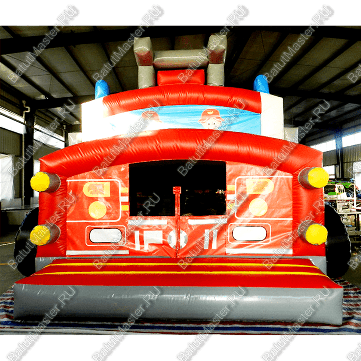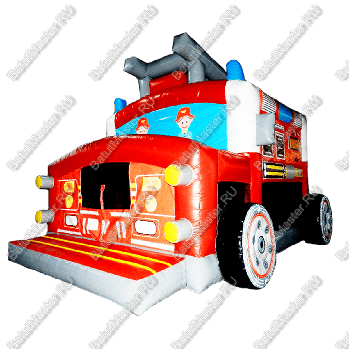 Очутиться и провести время в пожарной машине мечтает каждый ребенок. В этом случае детей порадует надувной батут в виде спецтехники с интересным наполнением внутри. Узнаваемый комплекс снаружи выполнен в красном цвете, что полностью повторяет окраску спасательной машины. Здесь даже есть огромные надувные колеса. Попасть внутрь можно спереди комплекса, для этого есть небольшое окно. Бока защищены прочной сеткой черного цвета, сквозь которую родители смогут следить за детьми. Комплекс будет заметен издалека, так как мягкие надувные модули в виде сирен и спасательной лестницы расположены высоко на его крыше. Спереди имитировано окно с водителем и пассажиром-спасателем, имеются яркие желтые фары, окна по бокам.