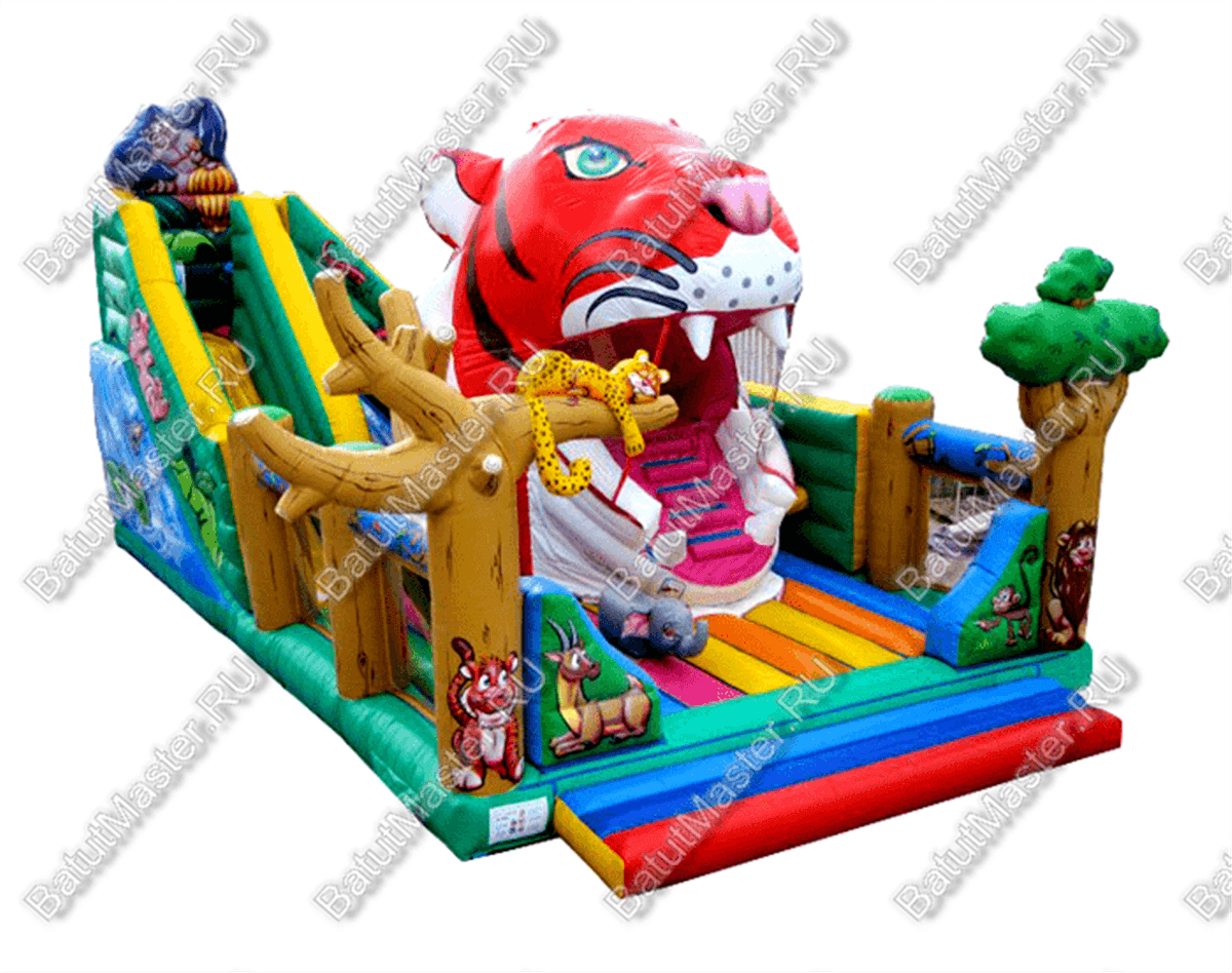 Ключевой элемент надувного батута – огромная голова тигра с открытой пастью, куда дети легко могут попасть по лестнице, чтоб дальше спуститься с горки. Этот элемент выглядит достаточно реально, верхняя челюсть имеет 2 надувных клыка. Коммерческая конструкция очень яркая, заметная и высокая (высота – 6 м). Общая площадь батута составляет 84 м², что позволяет находиться на развлекательной площадке одновременно больше двум десяткам детей. И начинается аттракцион для бизнеса с входа шириной на всю стенку, где по бокам установлены надувные деревья с зелеными кронами. На одном из них мило отдыхает рысь. Внизу покорно ждут гостей и другие надувные обитатели жарких стран: обезьяна, лев, маленький тигренок и т. д. Общая картинка надувного батута передает детям полностью атмосферу африканских прерий с ярким миром животных и растительности.