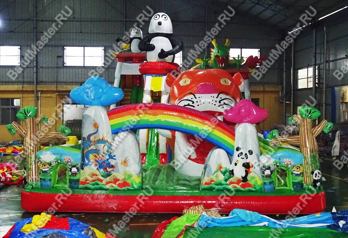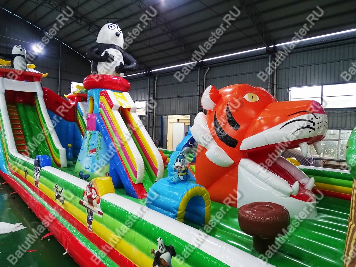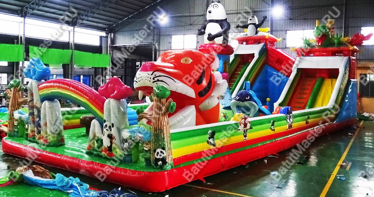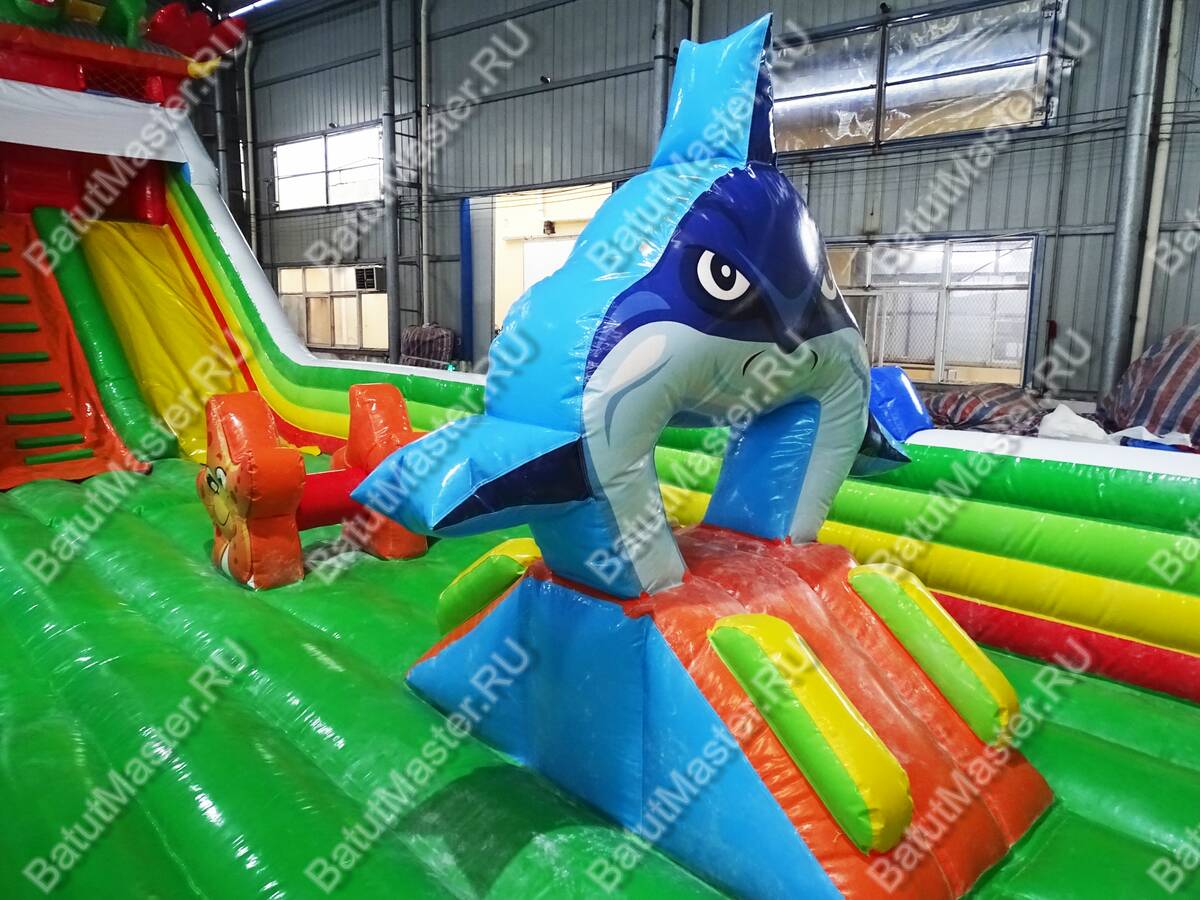 Комплекс для активных игр веселой командой «Прайд 2» привлечет внимание детей разного возраста. Это не просто надувной батут, это целая арена для невероятных приключений, где дети получат незабываемые эмоции. Здесь есть несколько горок разной величины, скалодром, надувные деревья, радуга, тоннель, скалодром и многое другое. Все это рассчитано на то, чтобы дети забирались на мягкие модули и весело прыгали вниз. Здесь также установлена горка для самых маленьких непосед, сверху которой размещена надувная акула. В центре батута стоит огромная голова тигра, в которую можно также забираться.