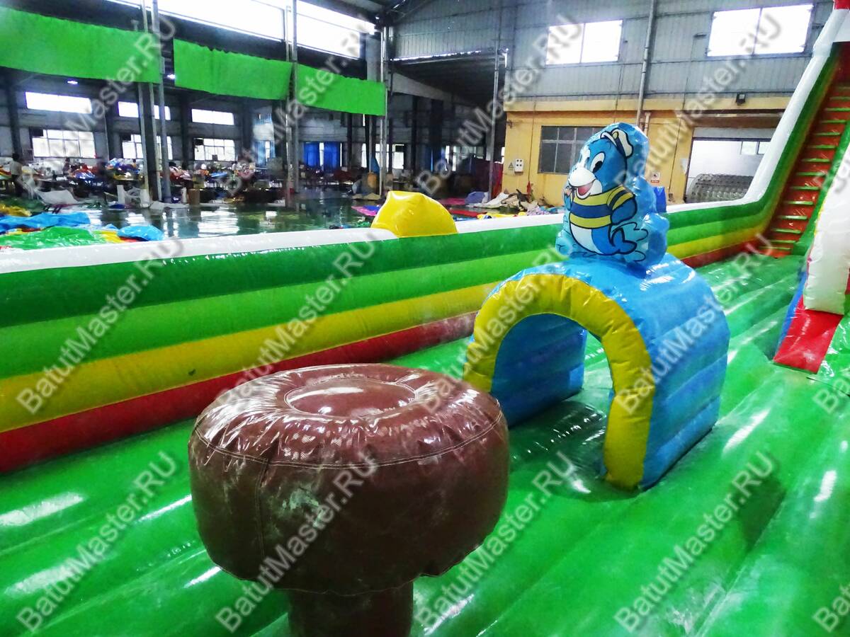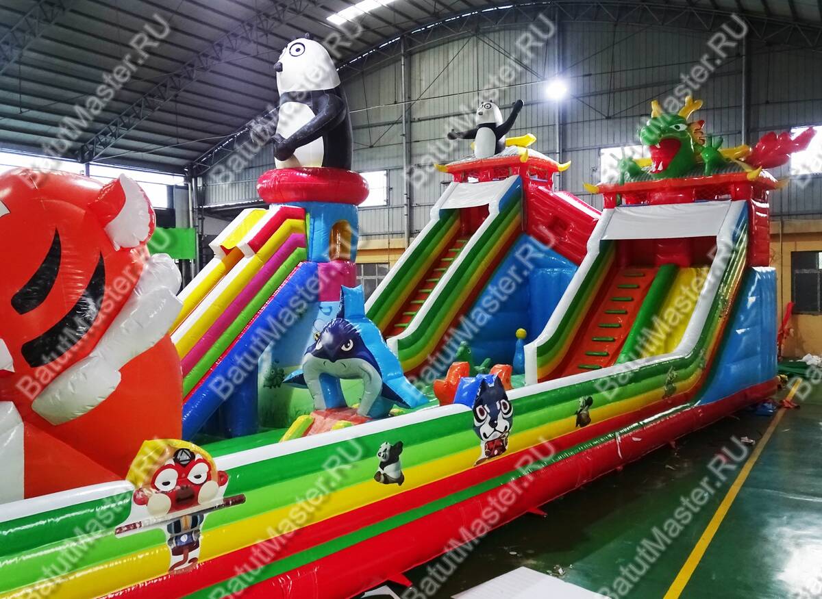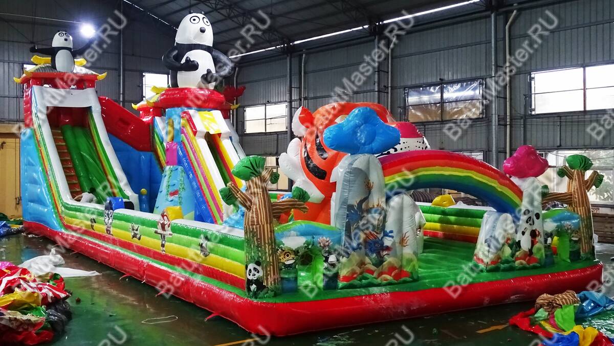Комплекс для активных игр веселой командой «Прайд 2» привлечет внимание детей разного возраста. Это не просто надувной батут, это целая арена для невероятных приключений, где дети получат незабываемые эмоции. Здесь есть несколько горок разной величины, скалодром, надувные деревья, радуга, тоннель, скалодром и многое другое. Все это рассчитано на то, чтобы дети забирались на мягкие модули и весело прыгали вниз. Здесь также установлена горка для самых маленьких непосед, сверху которой размещена надувная акула. В центре батута стоит огромная голова тигра, в которую можно также забираться.