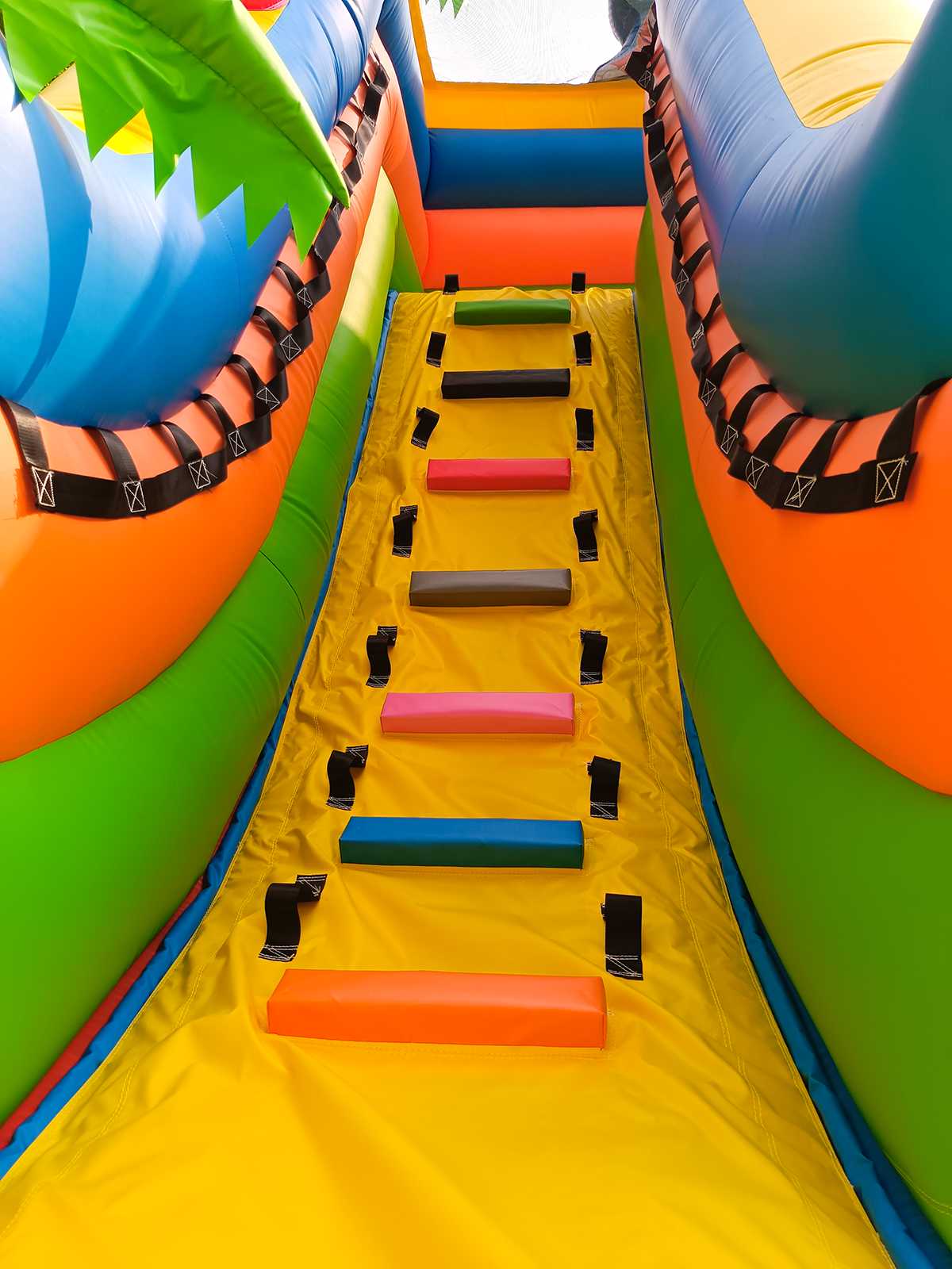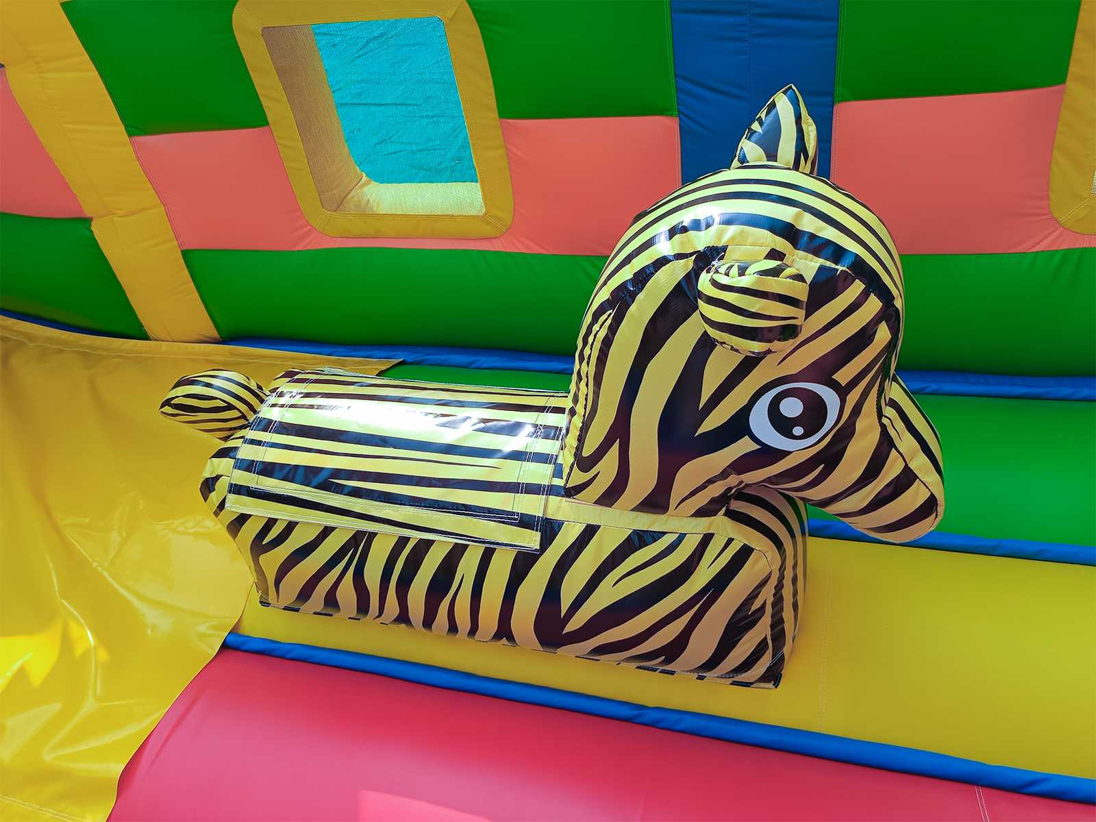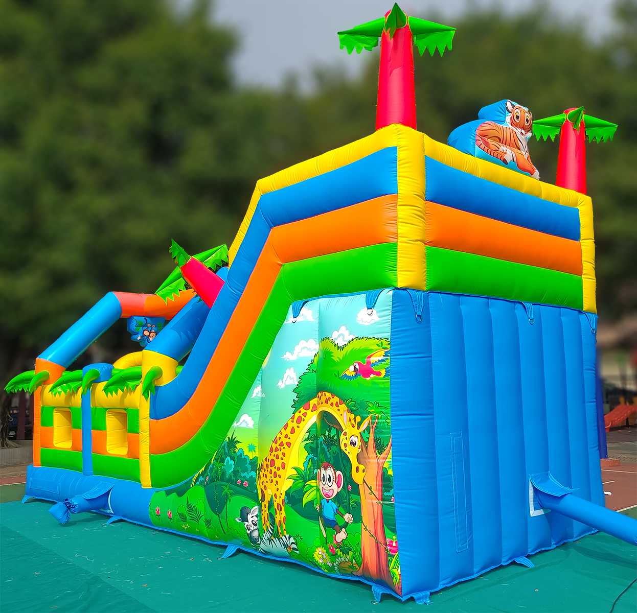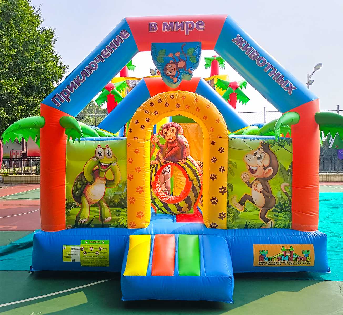 Надувной батут «Приключение в мире животных» непременно порадует маленьких первооткрывателей. Он вмещает в себя целую команду юных непосед, где они смогут резвиться, прыгать и преодолевать высокий подъем и спуск. На входе батут украшает арка с изображением цветов, животных и птиц, а также пальм. Все это задает особую атмосферу на игровой арене. Внутри есть вертикальные модули в виде столбцов, кольца, а также самое интересное – подъем по ступенькам и спуск. Все это развивает в детях силу и выносливость, а также способствует укреплению мышц. Яркий комплекс как нельзя лучше подходит для бизнеса. Полностью мобильный, его можно надувать и сдувать сколько угодно раз. Он изготовлен из высококачественного нетоксичного ПВХ, прошедшего предварительное ламинирование. Коммерческий батут по бокам защищен высокими бортами, что предотвращает от выпадения наружу. По бокам также есть сетка, таким образом дети всегда будут на виду у родителей. Прекрасный вариант для того, чтобы обустроить детскую площадку в помещении или на открытом воздухе. Его можно устанавливать на любую ровную поверхность и даже на песок. В комплекте имеется необходимое оборудование для установки и эксплуатации.