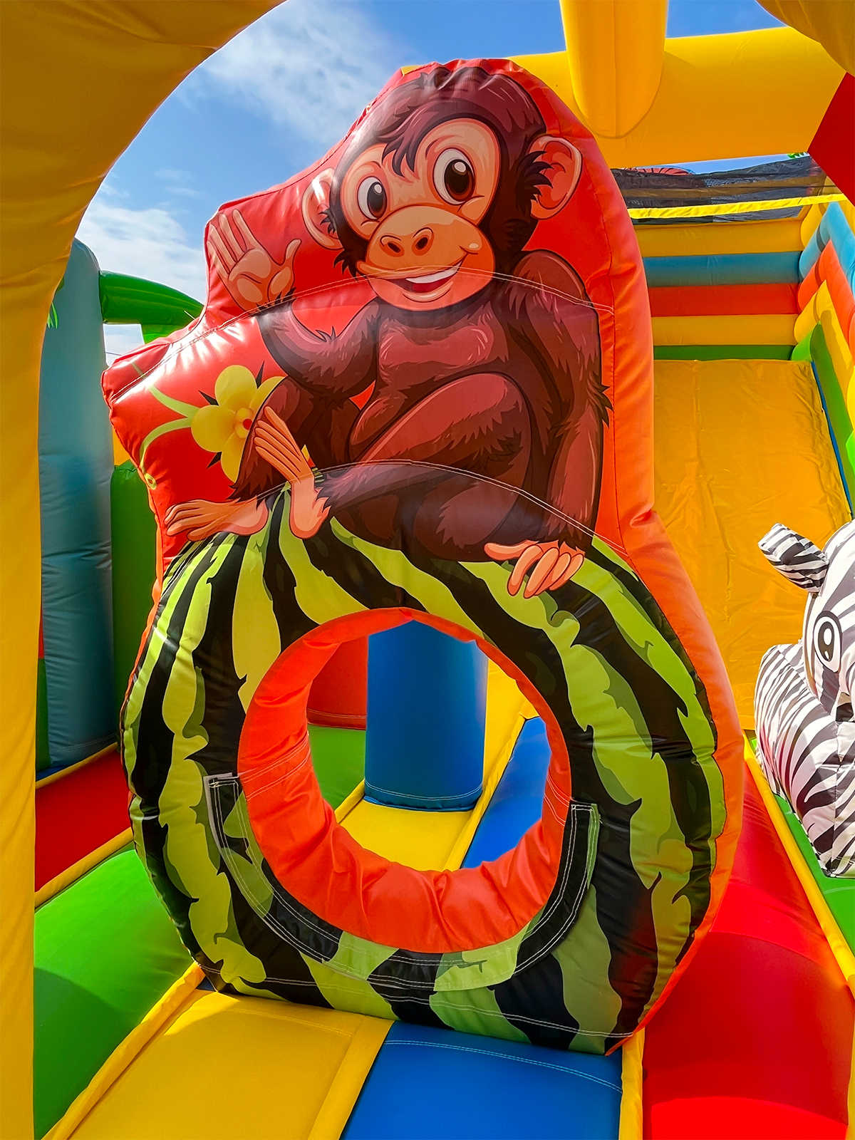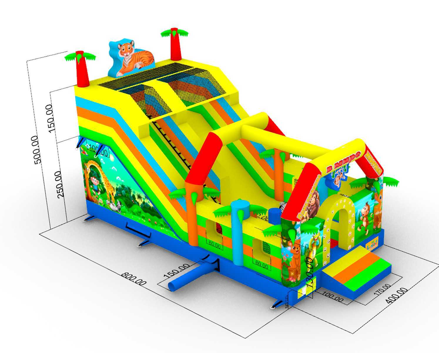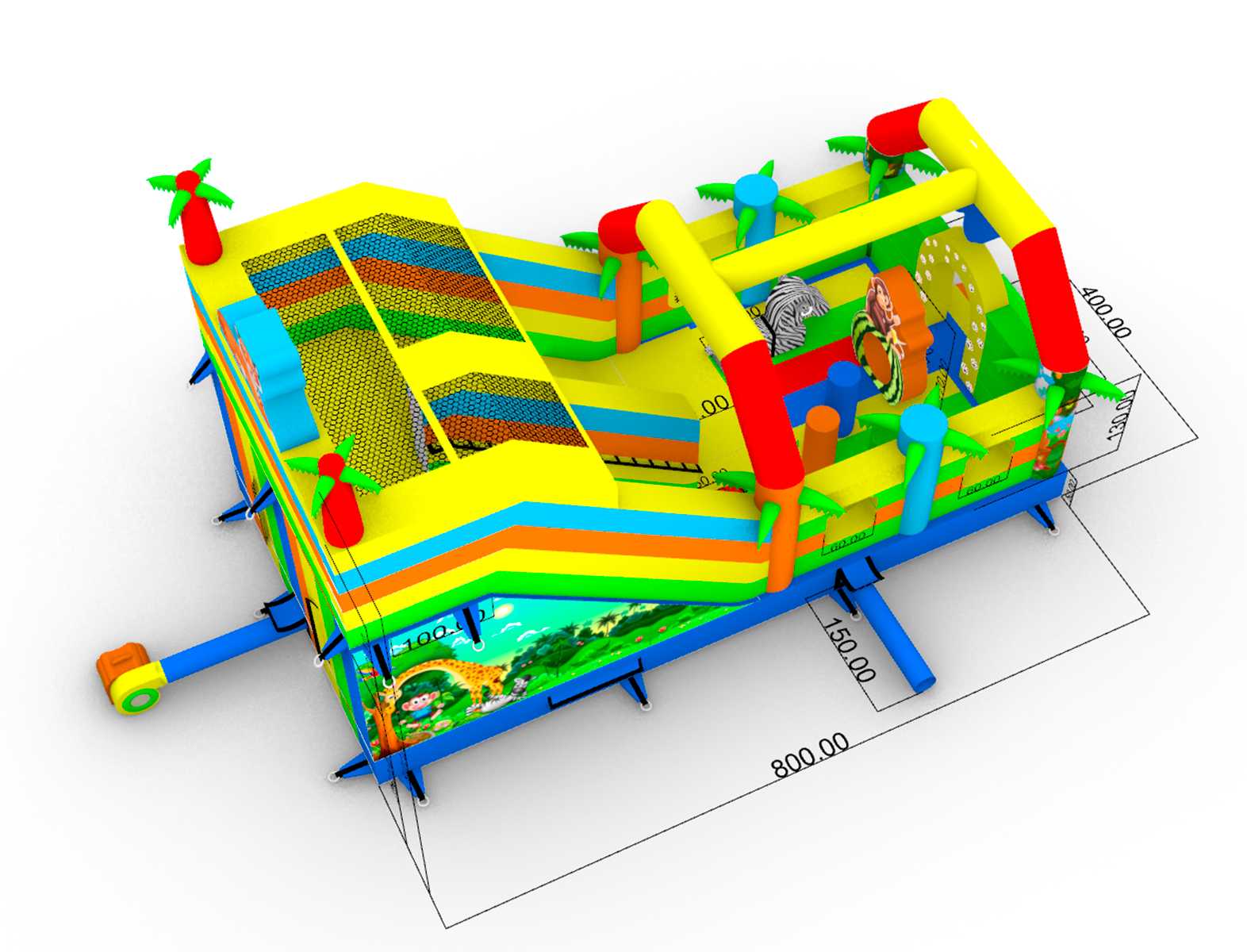 Коммерческий надувной батут «Приключение в мире животных 3» 8x4x5 м создан для того, чтобы привлекать внимание и превращать каждое детское мероприятие в незабываемое событие! Аттракцион оформлен в стиле джунглей: на его ярких стенках весело приветствуют гостей милые животные, деревья и зелёные лужайки 🌴🦁. Благодаря живым цветам батут выглядит очень красочно и моментально выделяется среди других развлечений.