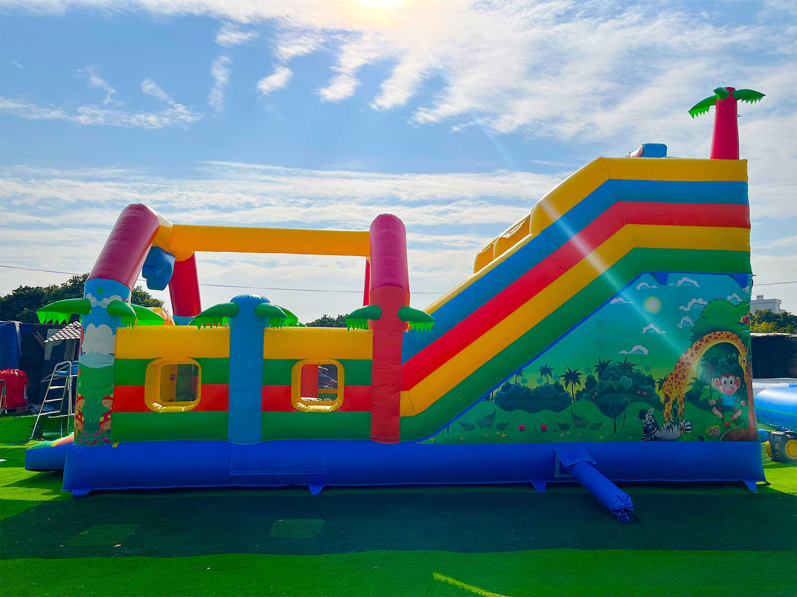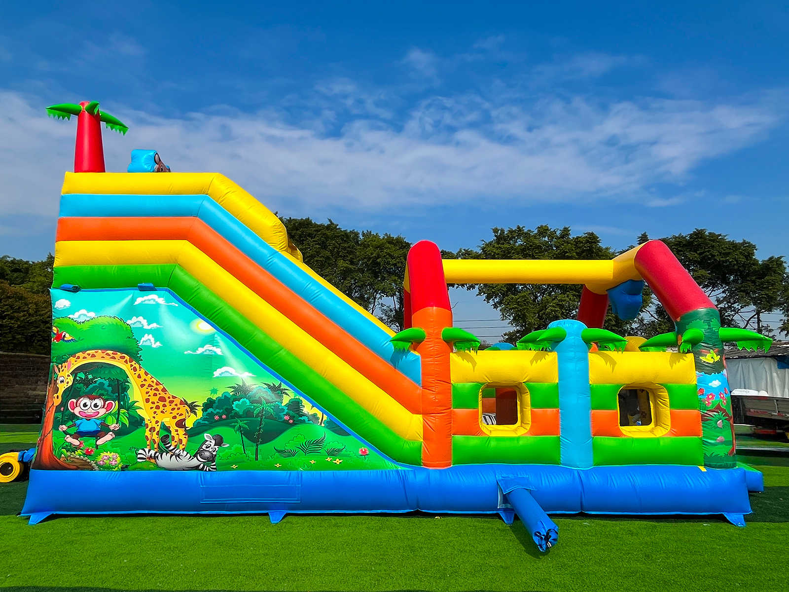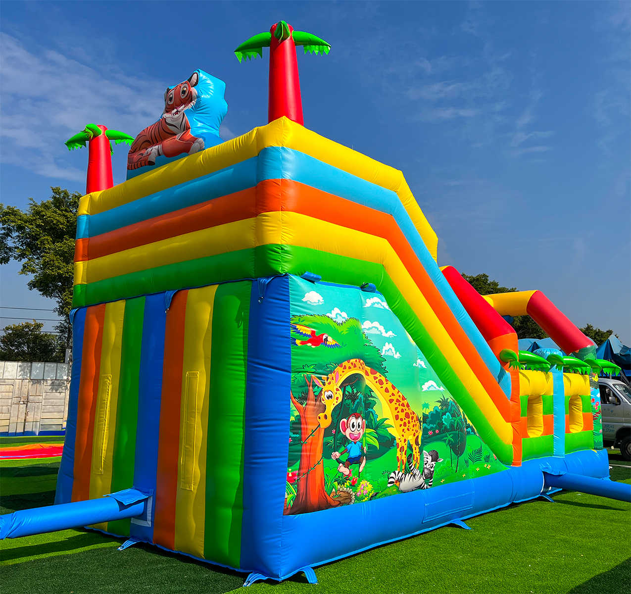 Коммерческий надувной батут «Приключение в мире животных 3» 8x4x5 м создан для того, чтобы привлекать внимание и превращать каждое детское мероприятие в незабываемое событие! Аттракцион оформлен в стиле джунглей: на его ярких стенках весело приветствуют гостей милые животные, деревья и зелёные лужайки 🌴🦁. Благодаря живым цветам батут выглядит очень красочно и моментально выделяется среди других развлечений.