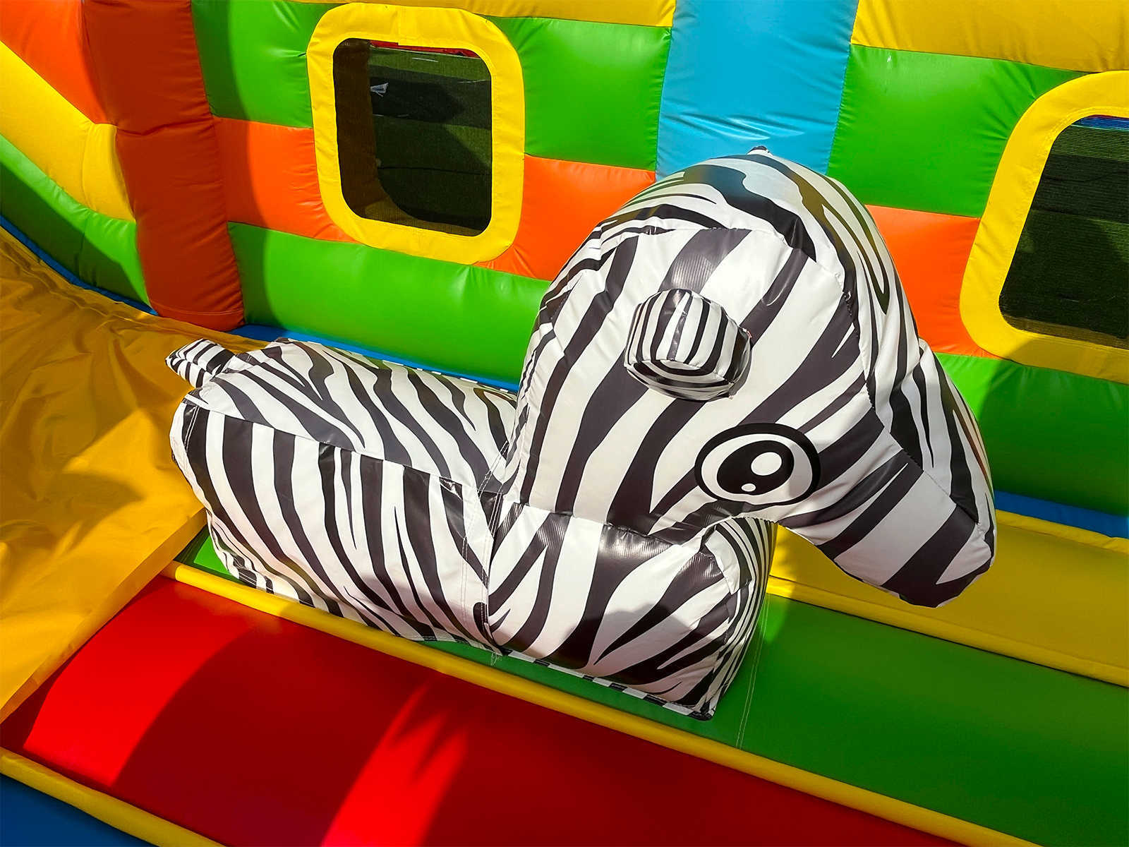 Надувной батут предлагает детям настоящий простор для активности: можно прыгать, бегать, играть с декоративными фигурами и скатываться с весёлой горки с высотой старта 2,5 м. Компактные размеры (8x4x5 м) позволяют устанавливать его как в помещении, так и на улице.