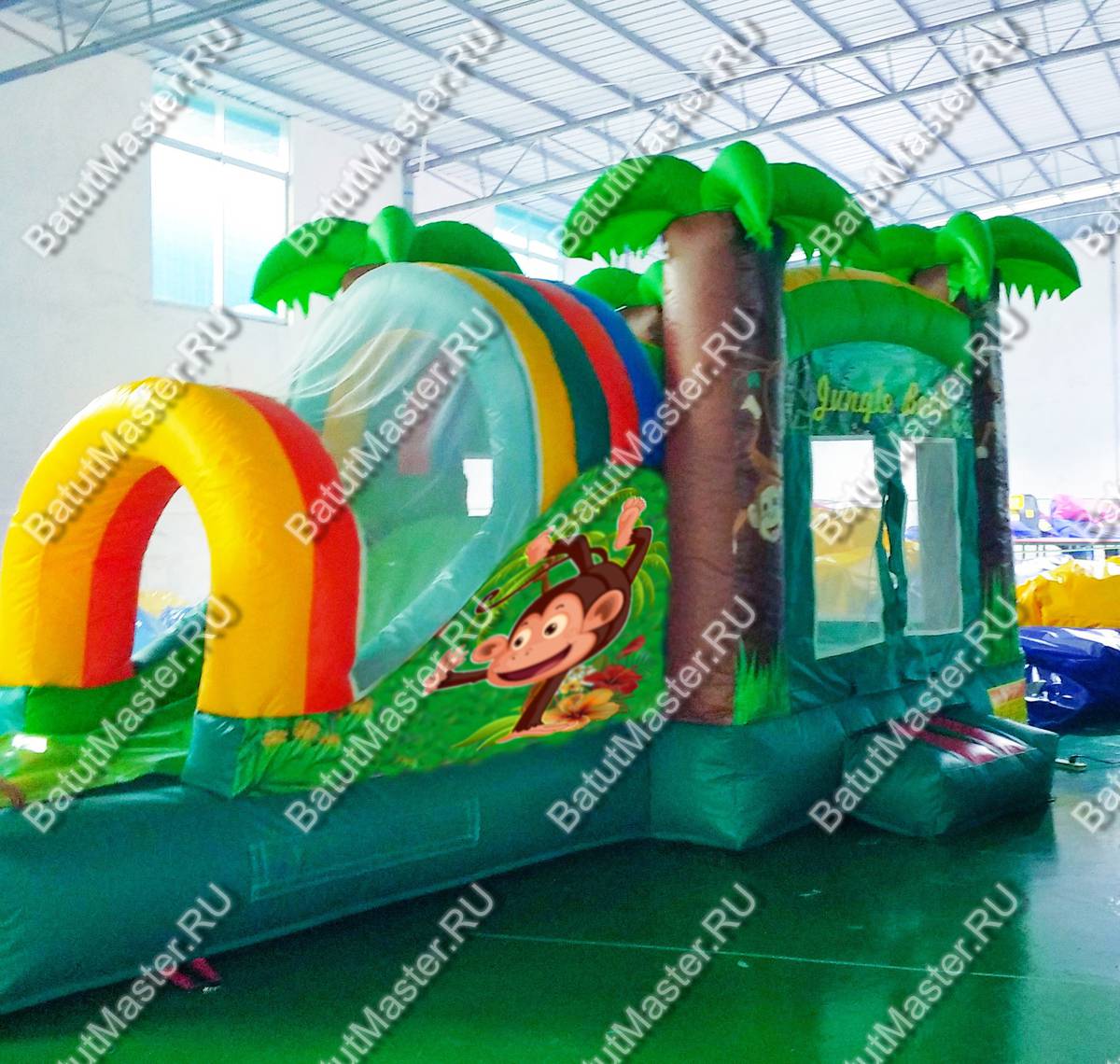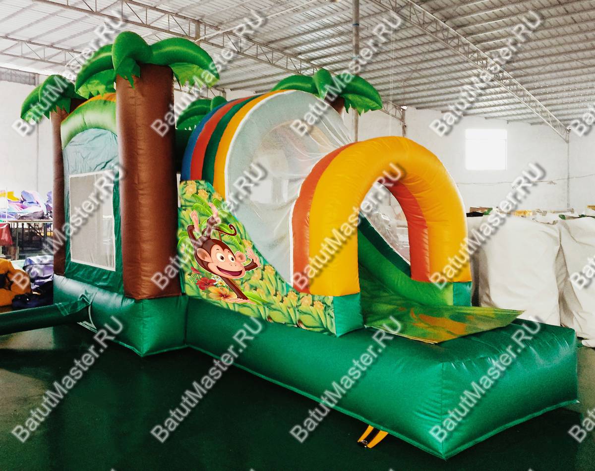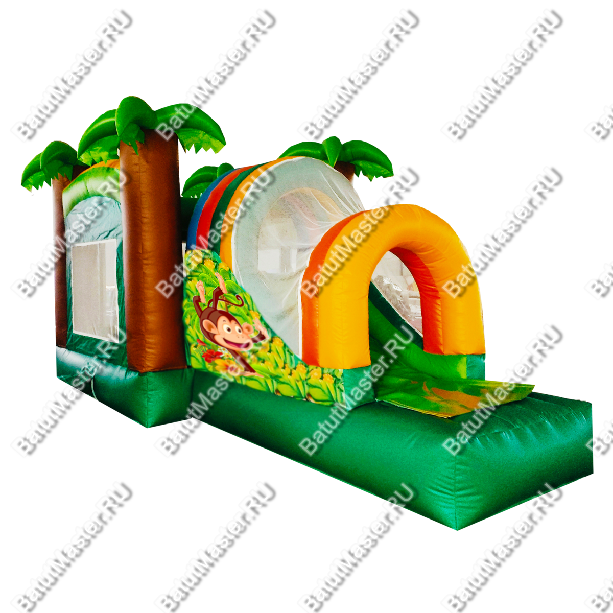 Надувной батут данной модификации - это компактный аттракцион для прыжков, кувырканий и спуска стилизованный под джунгли. С одной стороны имеется вход, который надежно фиксируется липучкой, а с другой стороны размещена горка, с которой дети так любят кататься. Прыжковое поле позволяет отталкиваться от надувной основы и подлетать вверх, отчего у детей улучшится координация движений и ловкость. По всему периметру батута возвышаются надувные пальмы, за которые закреплена прочная сетка. Таким образом дети во время игр не выпадут наружу и всегда останутся на виду у родителей.