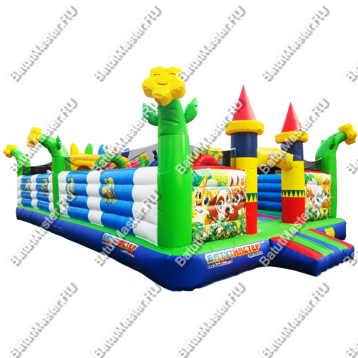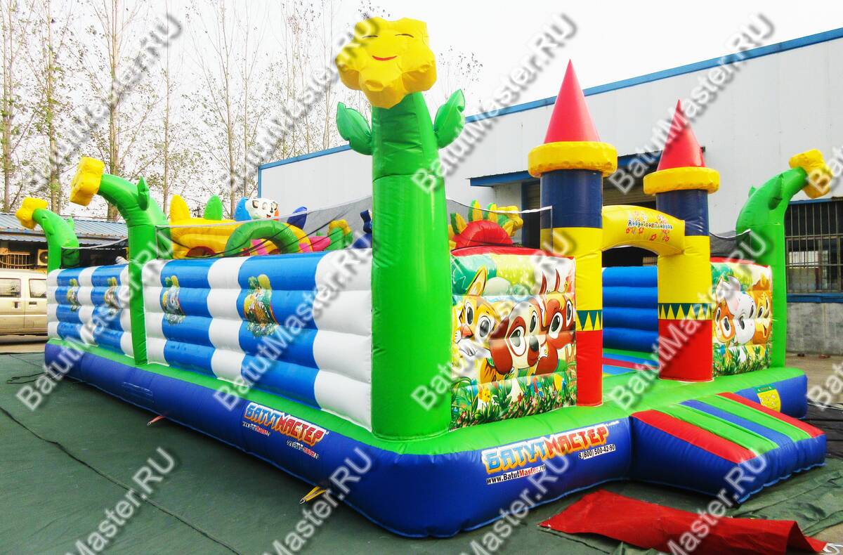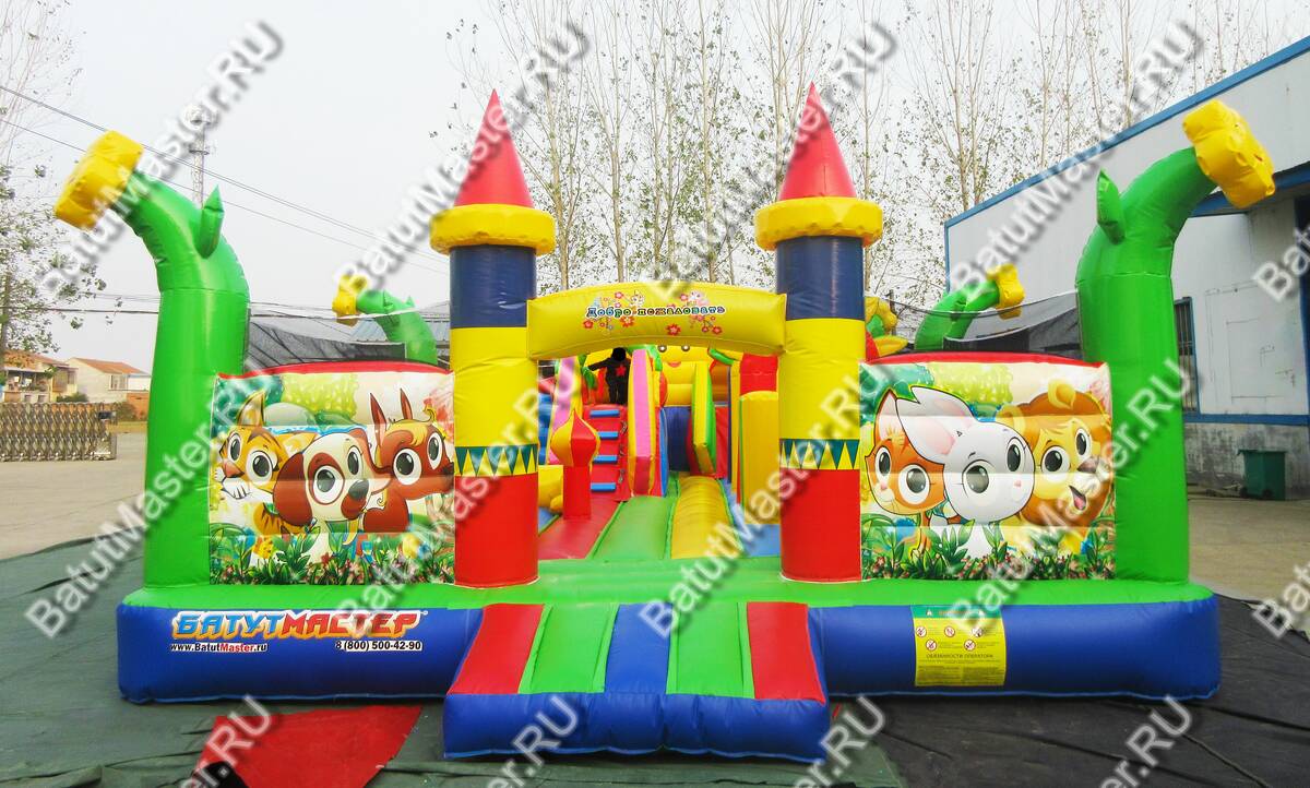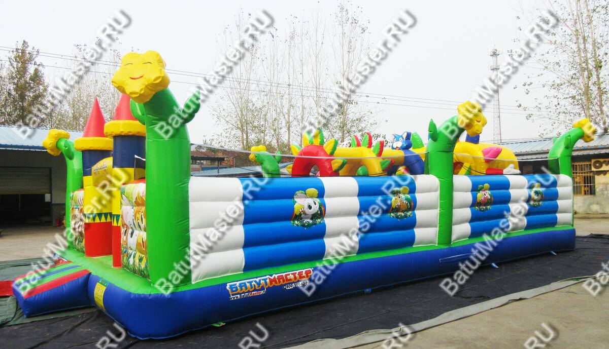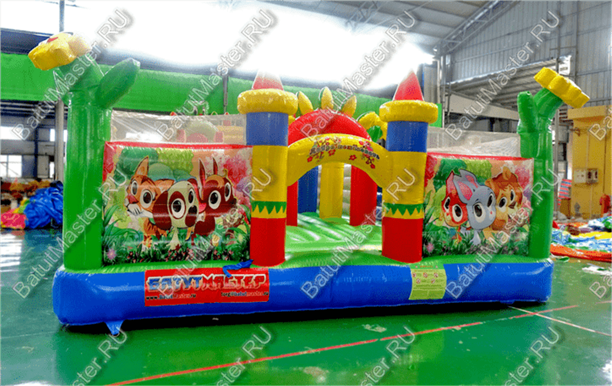 «Радужный город 2» притягивает взгляд не только красочностью, но и изображениями весёлых зверят. Различные забавные животные встречаются тут повсюду и могут порадовать малышей даже в виде надувных фигур. Также внешний вид батута подчёркивают высокие башни и большие надувные цветочки.