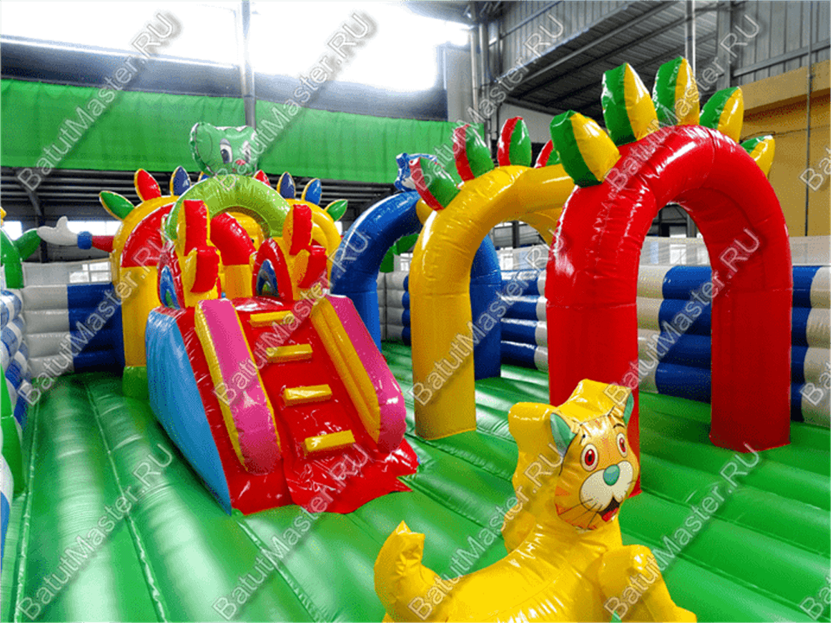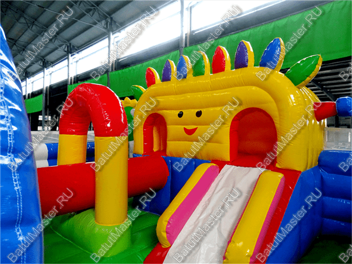 Наполнение батута обязательно понравится юным посетителям. Внутренне пространство не перегружено аттракционами, и там есть место для бега и прыжков. В то же время тут хватает и различных игровых предметов: арки, различные груши, надувные фигуры, а также небольшая горка для большего веселья. При этом горка является ещё и небольшой полосой препятствий. Чтобы попасть на балкон и скатиться с горки, нужно забраться по лесенке и проползти по надувной трубе.
