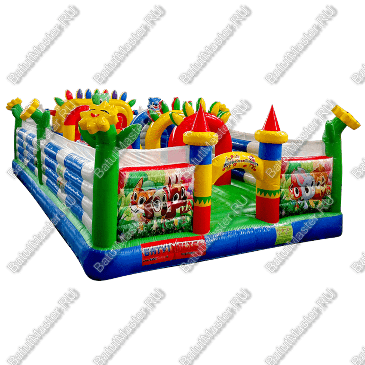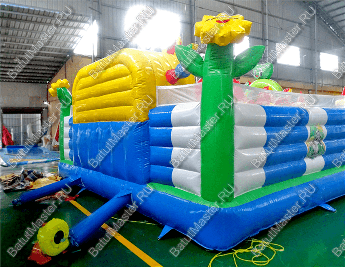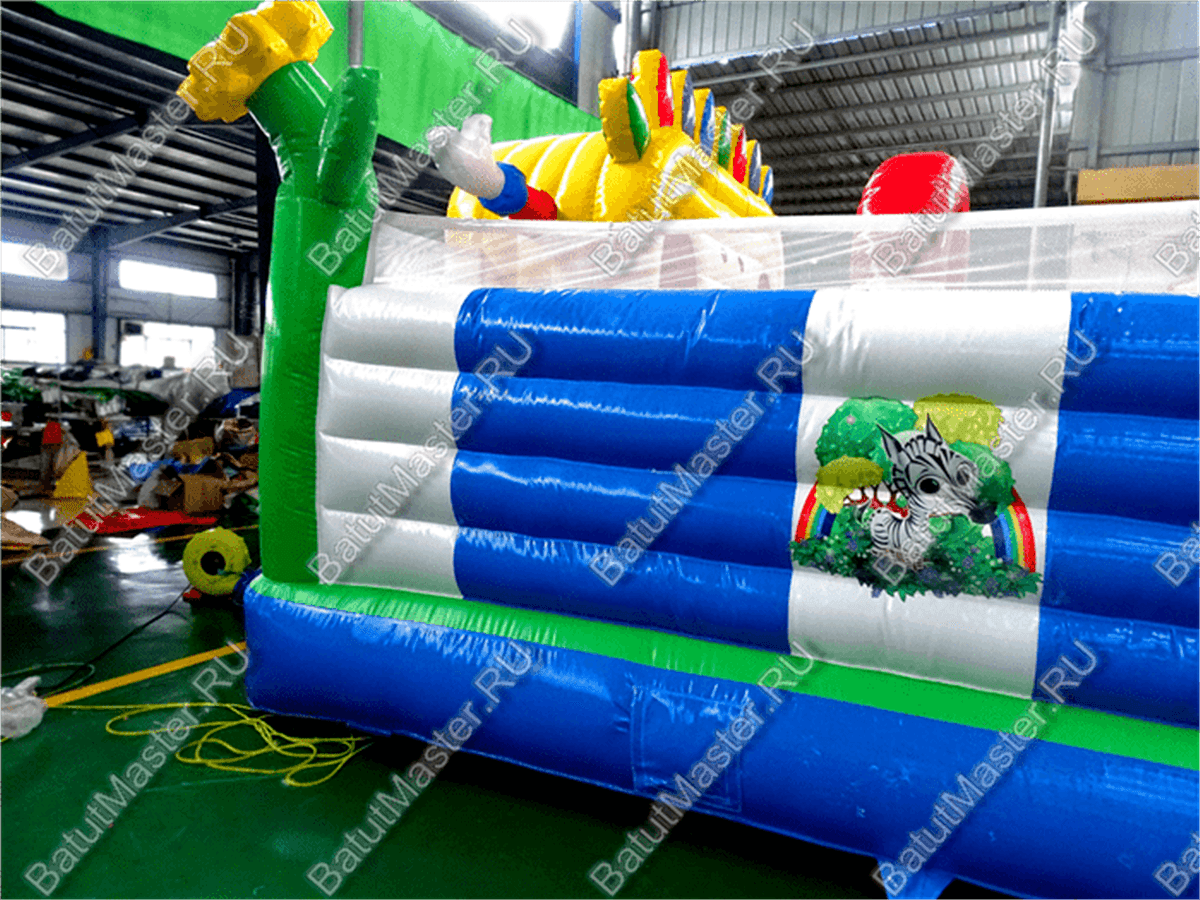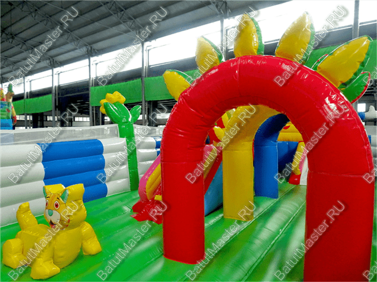 Этот батут отлично подойдёт для игр детей младшего возраста. Тут нет высоких горок, которые могут напугать самых маленьких, зато есть надувные фигуры весёлых животных, и на них можно сесть верхом. Внутри батута очень много места, так что детям точно есть, где побегать и попрыгать. Среди многочисленных разноцветных арок можно играть в пятнашки, что увлечёт ребёнка на долгие часы.