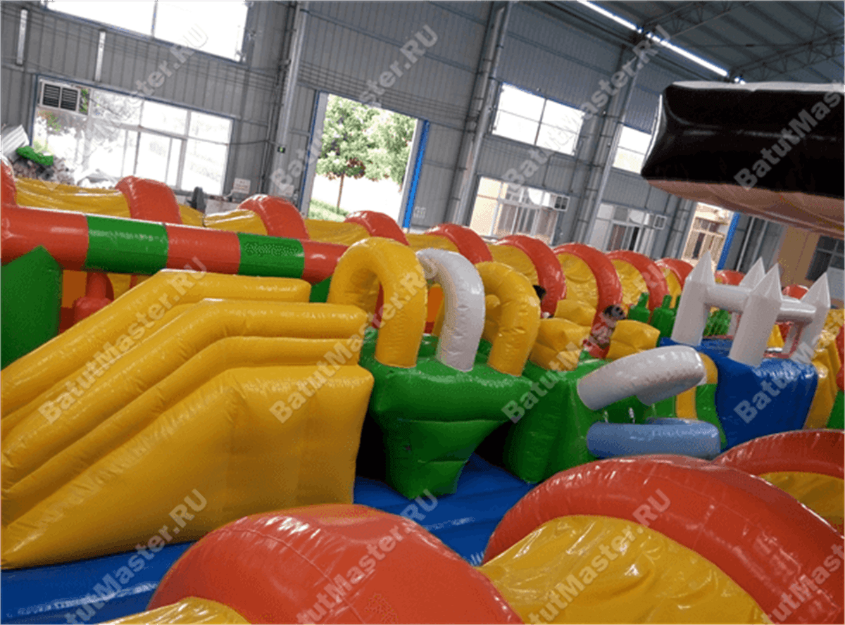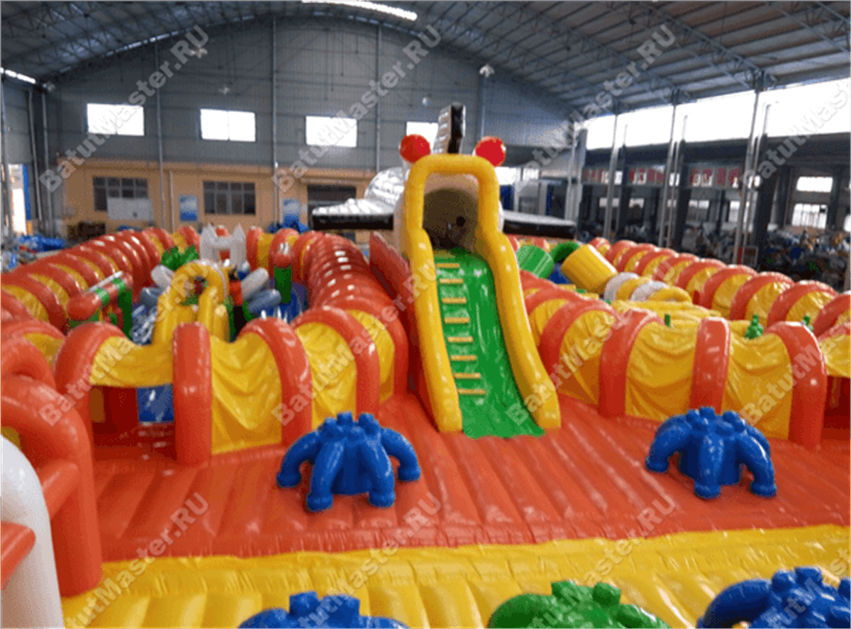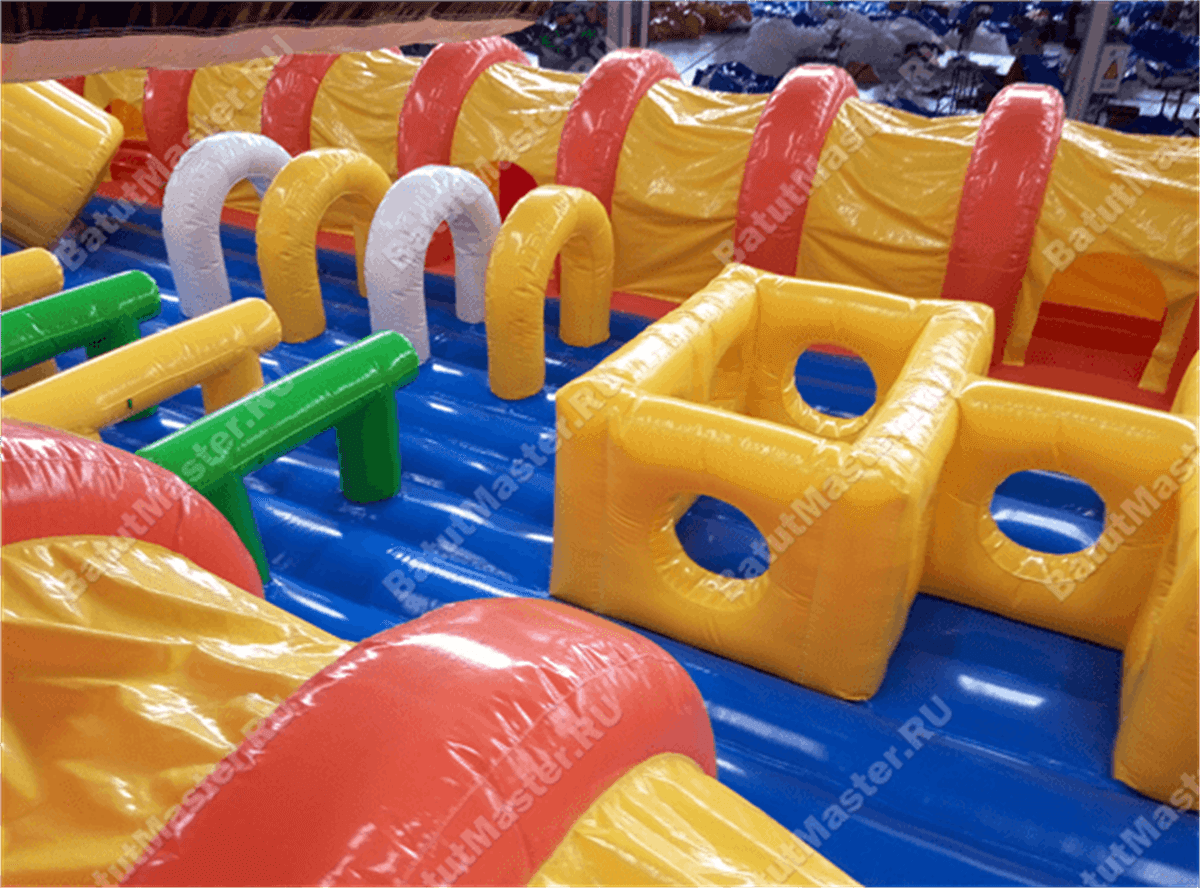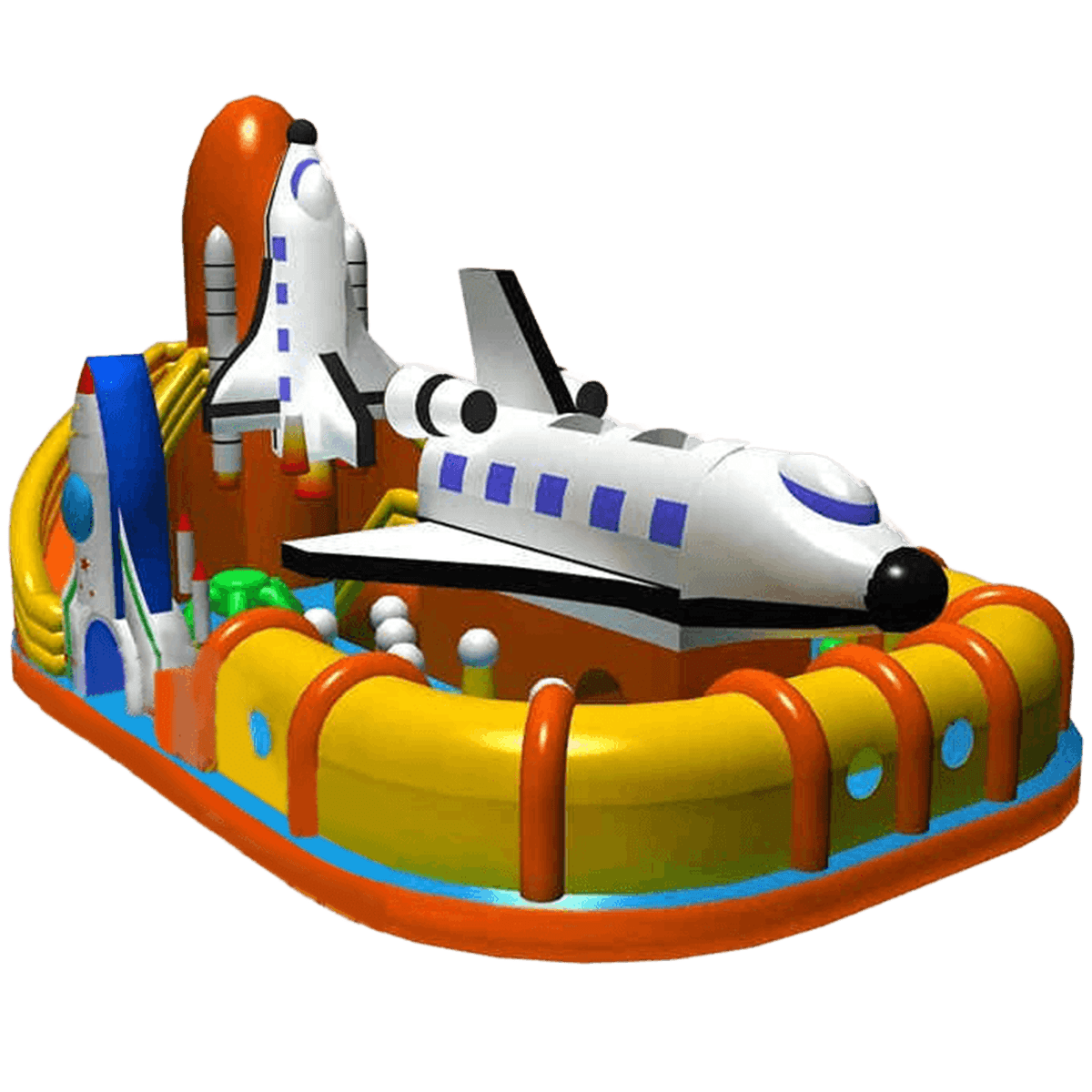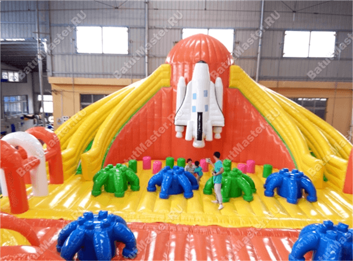 Ограждение площадки изготовлено в виде замкнутого туннеля с иллюминаторами, подобно космической станции. И в это ограждение можно забраться через внутренние лазы, чтобы проделать длинное путешествие по периметру и вылезти в нужной точке. Центральное место площадки занимает надувной самолет, который располагается вдоль длины батута, с обеих сторон от него установлены яркие фигуры горок, столбиков, высоких тоннелей, арок и лазов. Ближе к задней части аттракциона размещаются космические тумбы под установку ракет и невысокие яркие столбики. Сразу за этой зоной начинается территория запуска ракеты, которая присоединена к основной конструкции. Со стороны хвостовой части вправо и влево отходят зоны лестницы и горки, поэтому с каждой стороны ребенок может взобраться внутрь стартовой площадки, которая изготовлена в виде закрытого купола, и дальше выбрать, с какой стороны спуститься вниз.