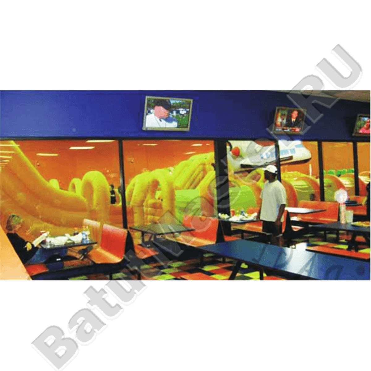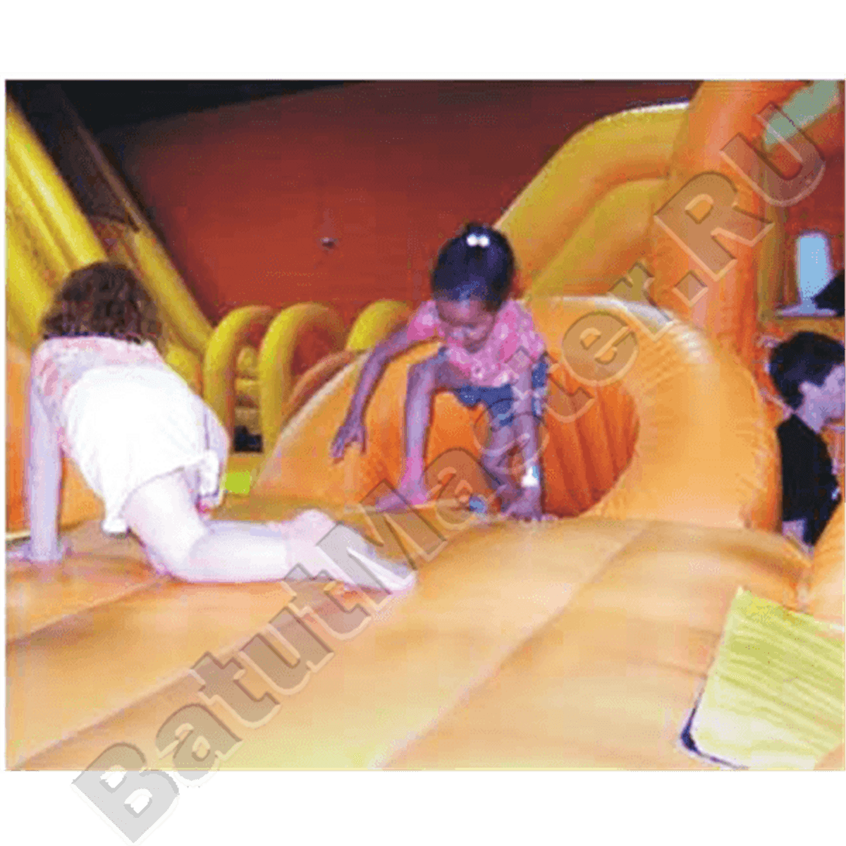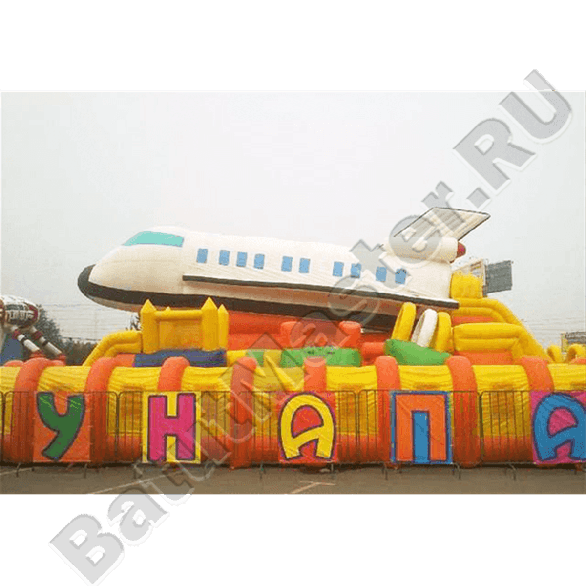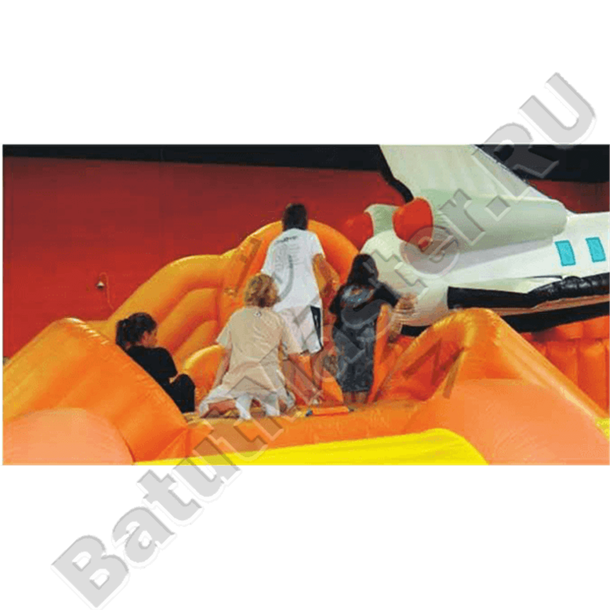 Внешний вид батута для бизнеса привлекает с самого начала: он выглядит, как длинный закрытый тоннель из желтого и оранжевого ПВХ с множеством небольших окошек. В центре между двумя овальными зонами, которые ограничиваются тоннелем, установлена фигура самолета. В каждой из этих зон дети смогут найти огромное количество развлекательных модулей, а при желании можно организовать соревнование по прохождению всех препятствий.