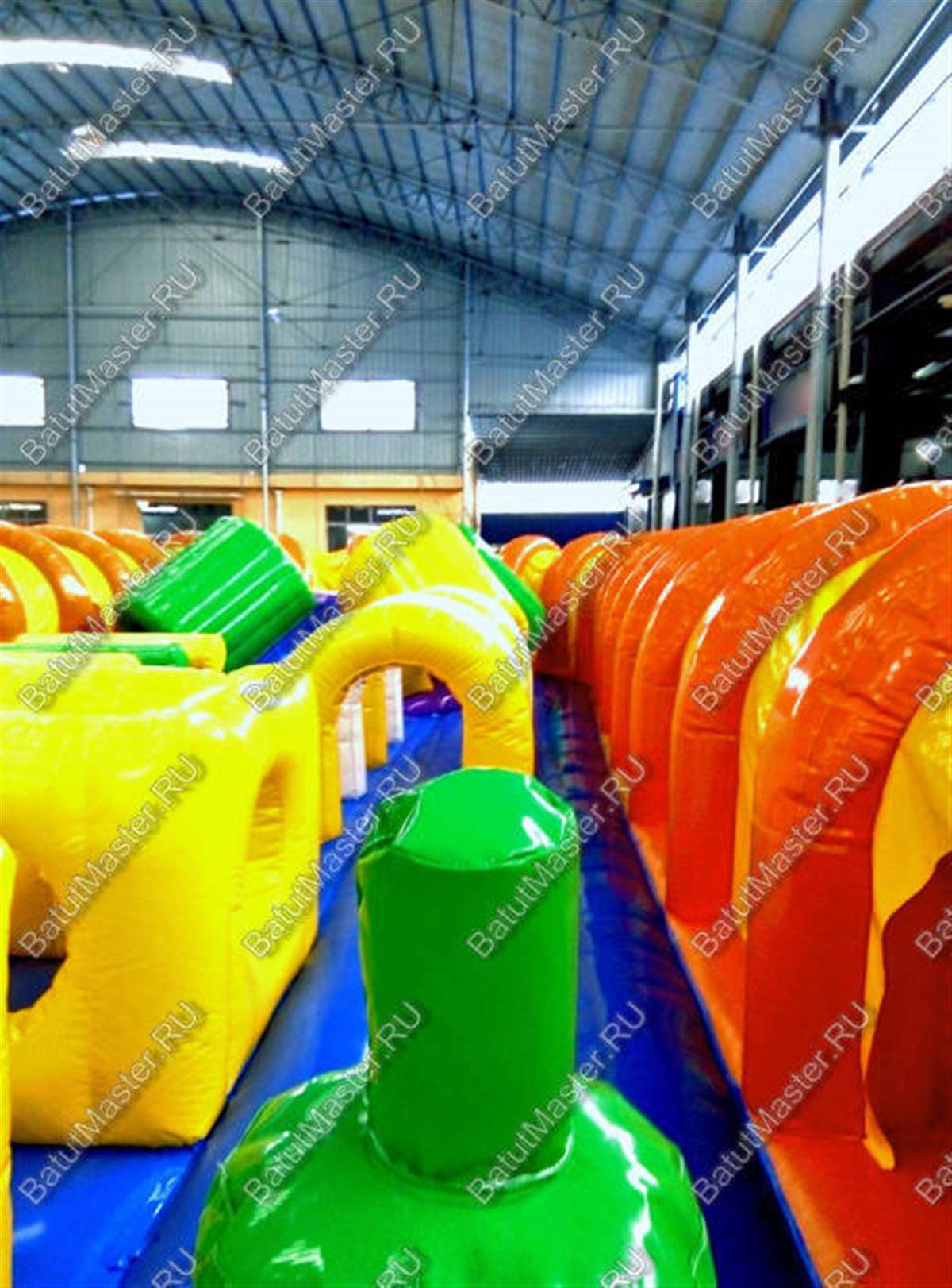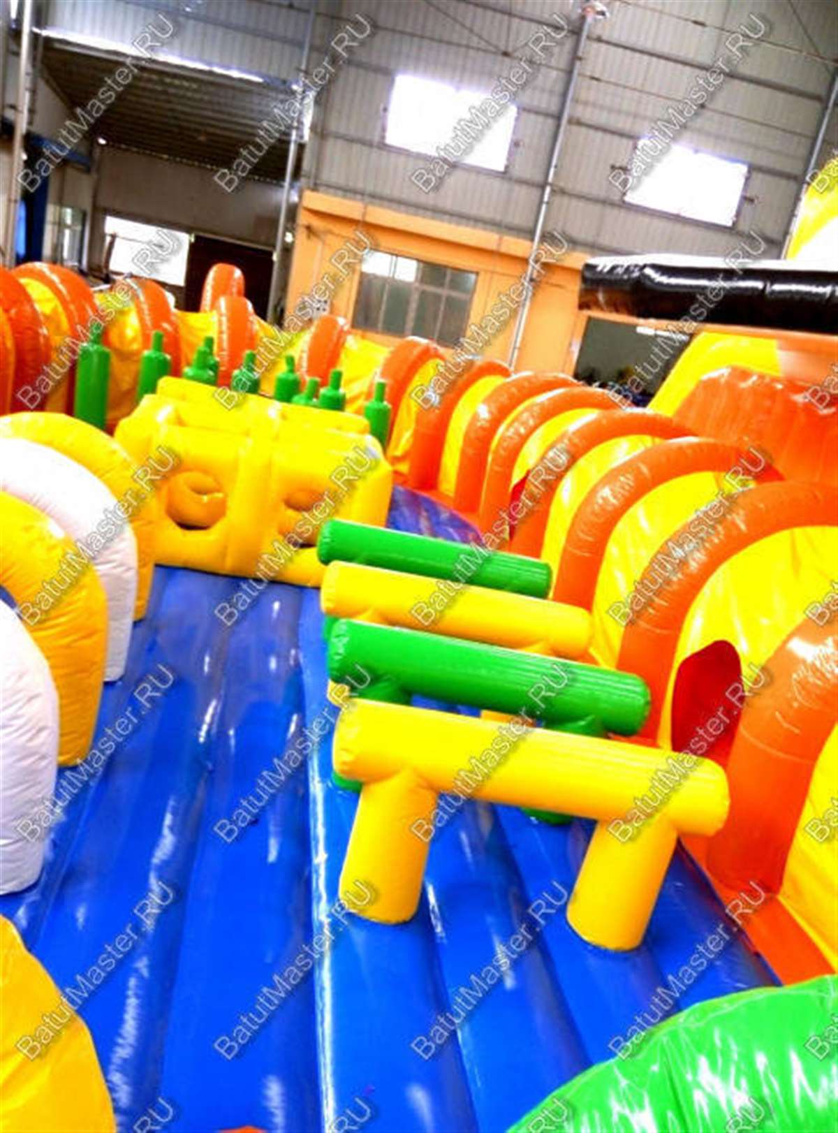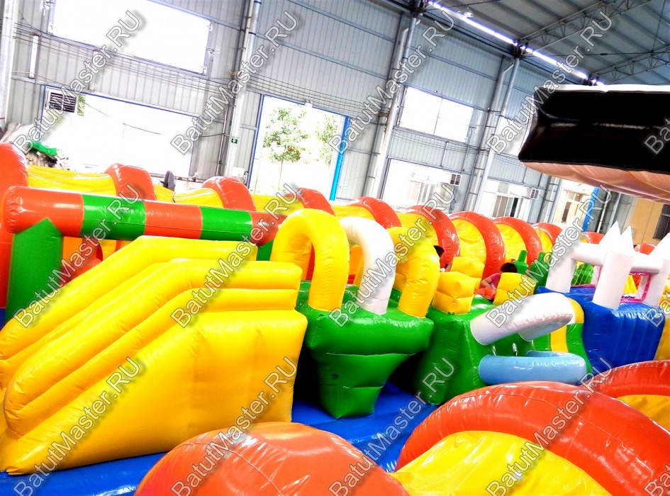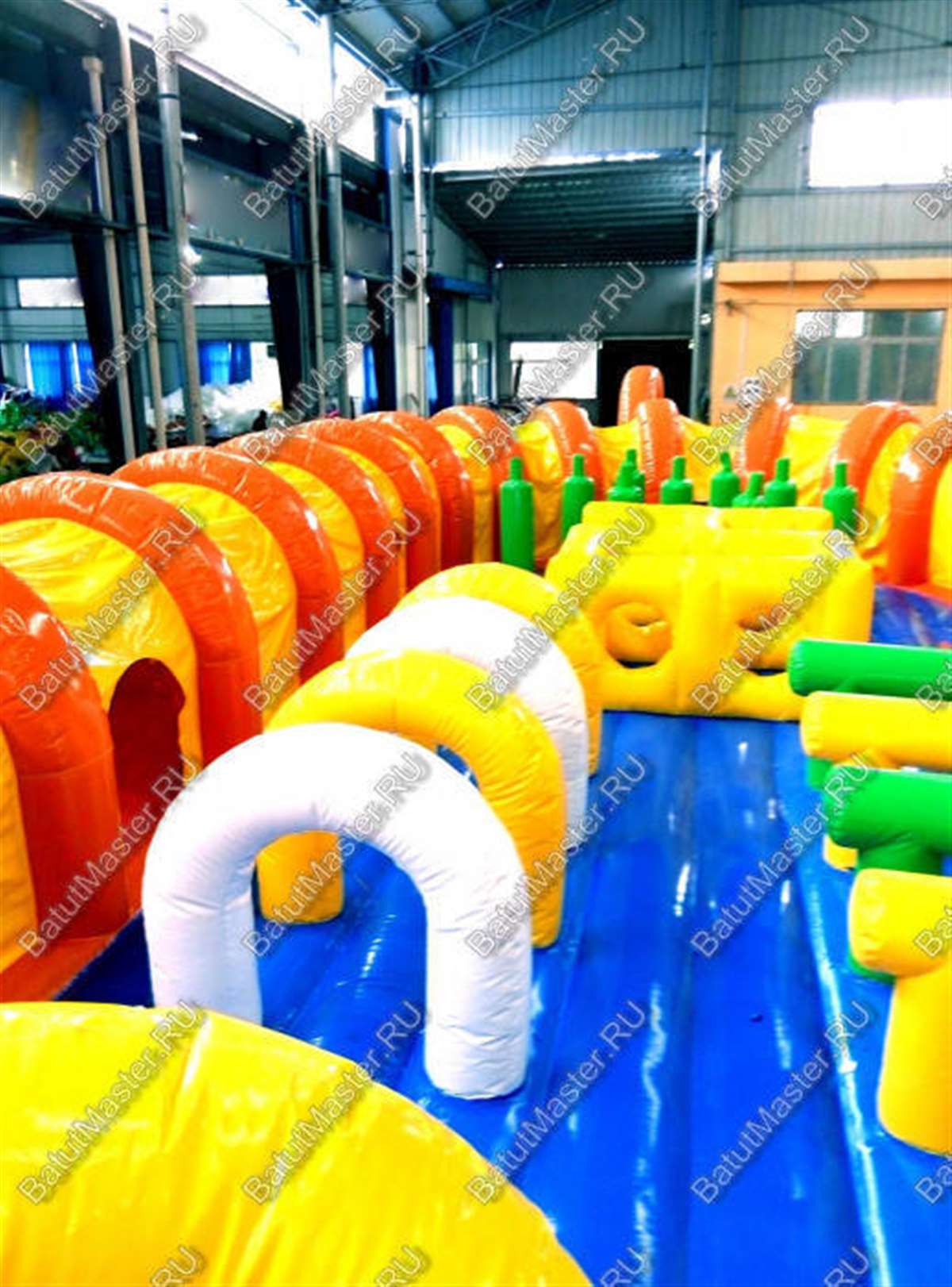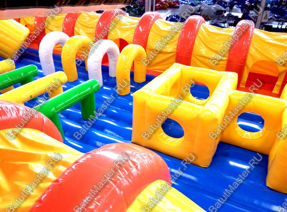 Внешний вид батута для бизнеса привлекает с самого начала: он выглядит, как длинный закрытый тоннель из желтого и оранжевого ПВХ с множеством небольших окошек. В центре между двумя овальными зонами, которые ограничиваются тоннелем, установлена фигура самолета. В каждой из этих зон дети смогут найти огромное количество развлекательных модулей, а при желании можно организовать соревнование по прохождению всех препятствий.