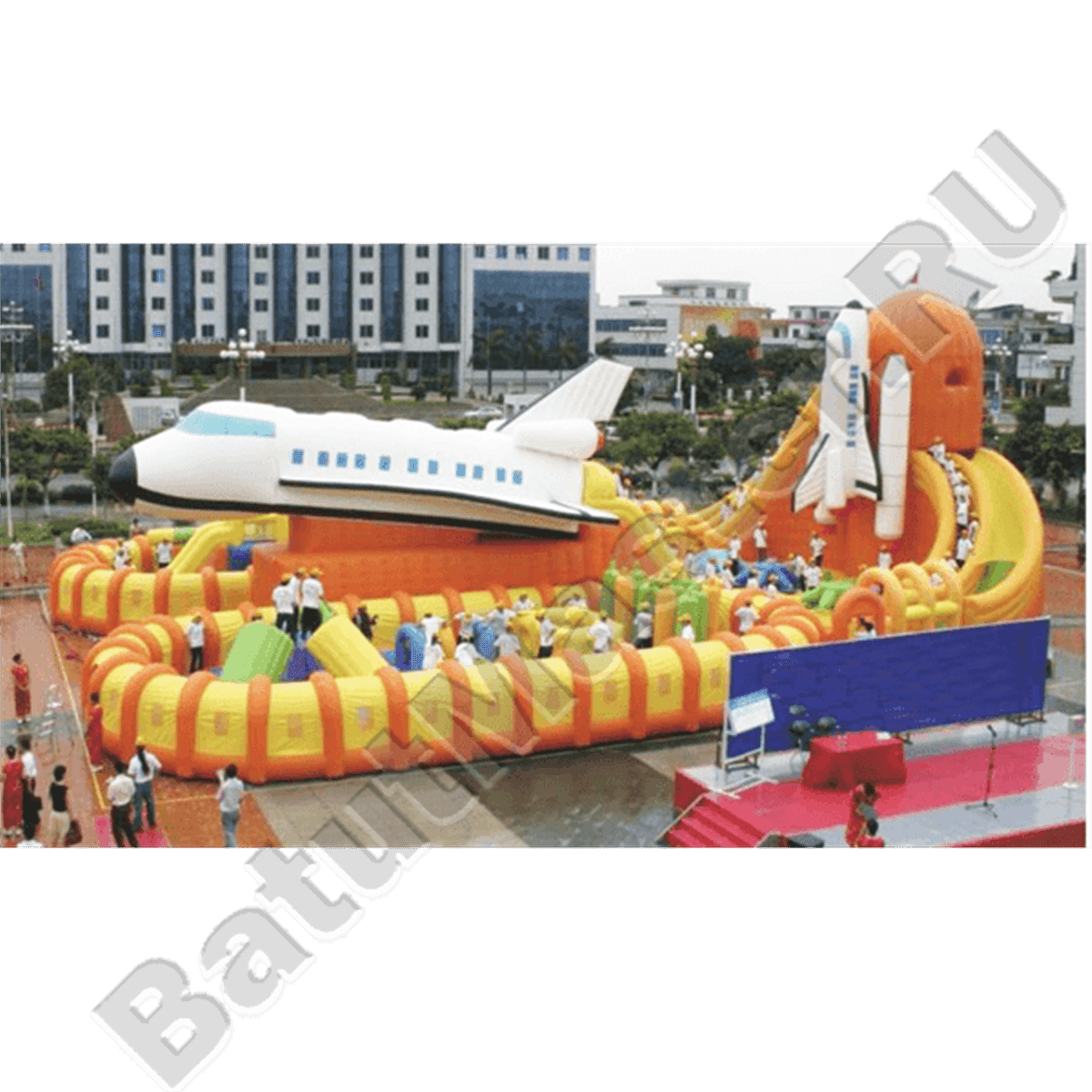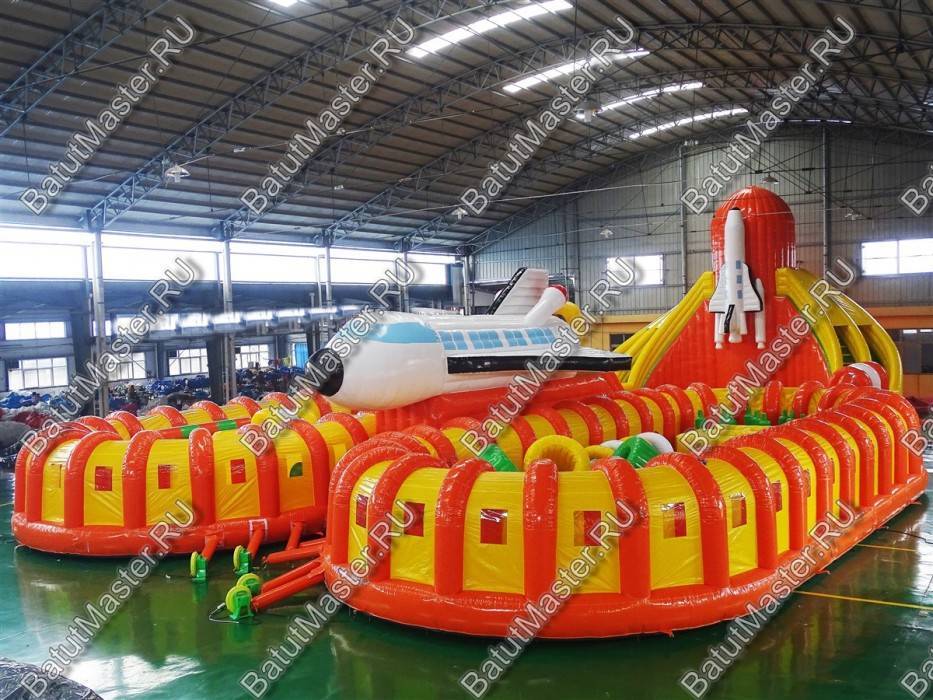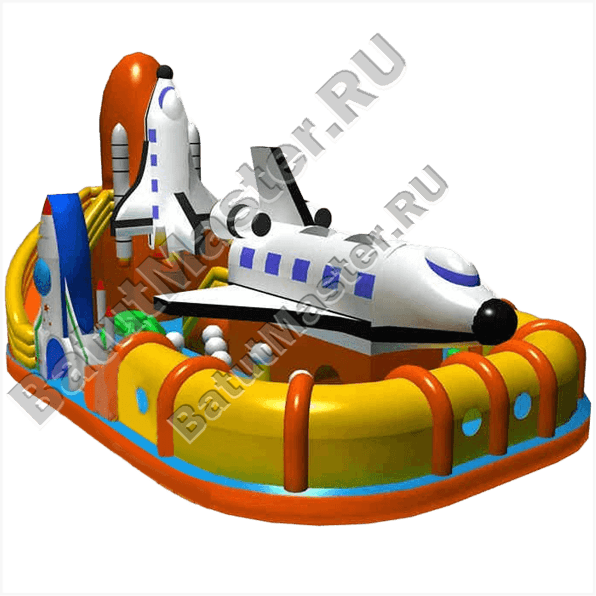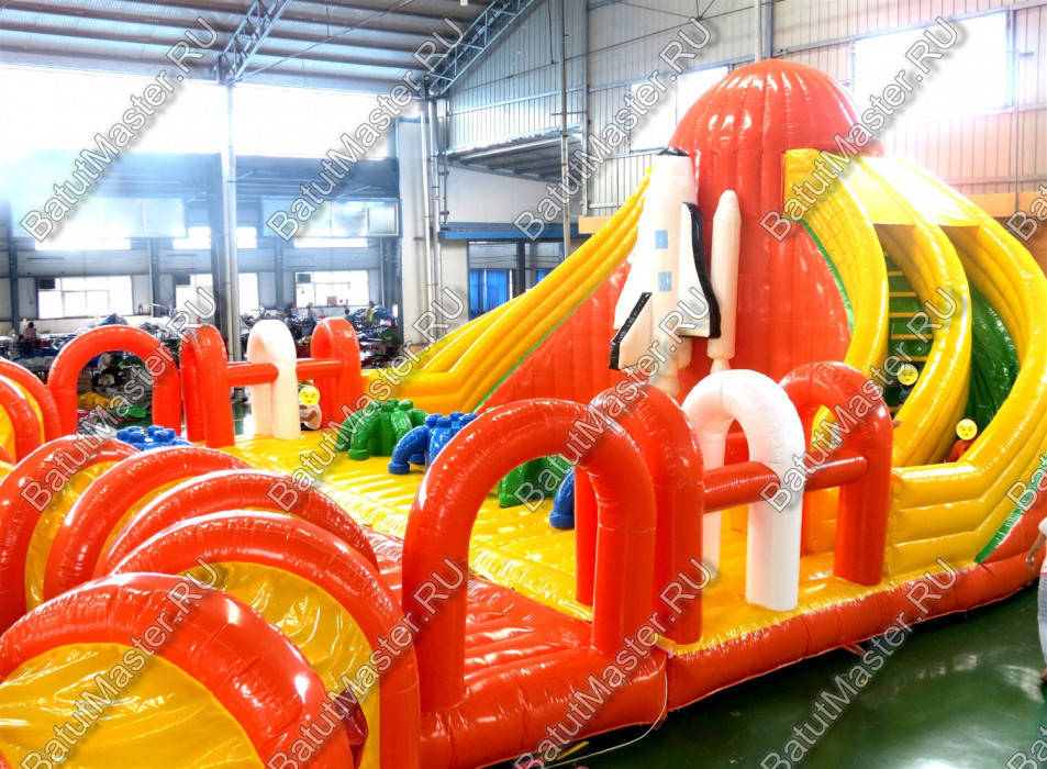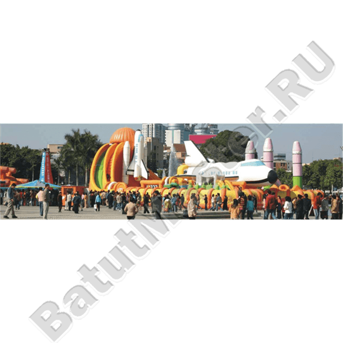 Представленный надувной батут их ПВХ – просторная площадка, напоминающая своим дизайном космодром. Многофункциональность коммерческого аттракциона заключается в том, что при размерах 30 на 20 м он делится на 3 основные площадки и каждая из них представлена множеством игровых фигур и препятствий.