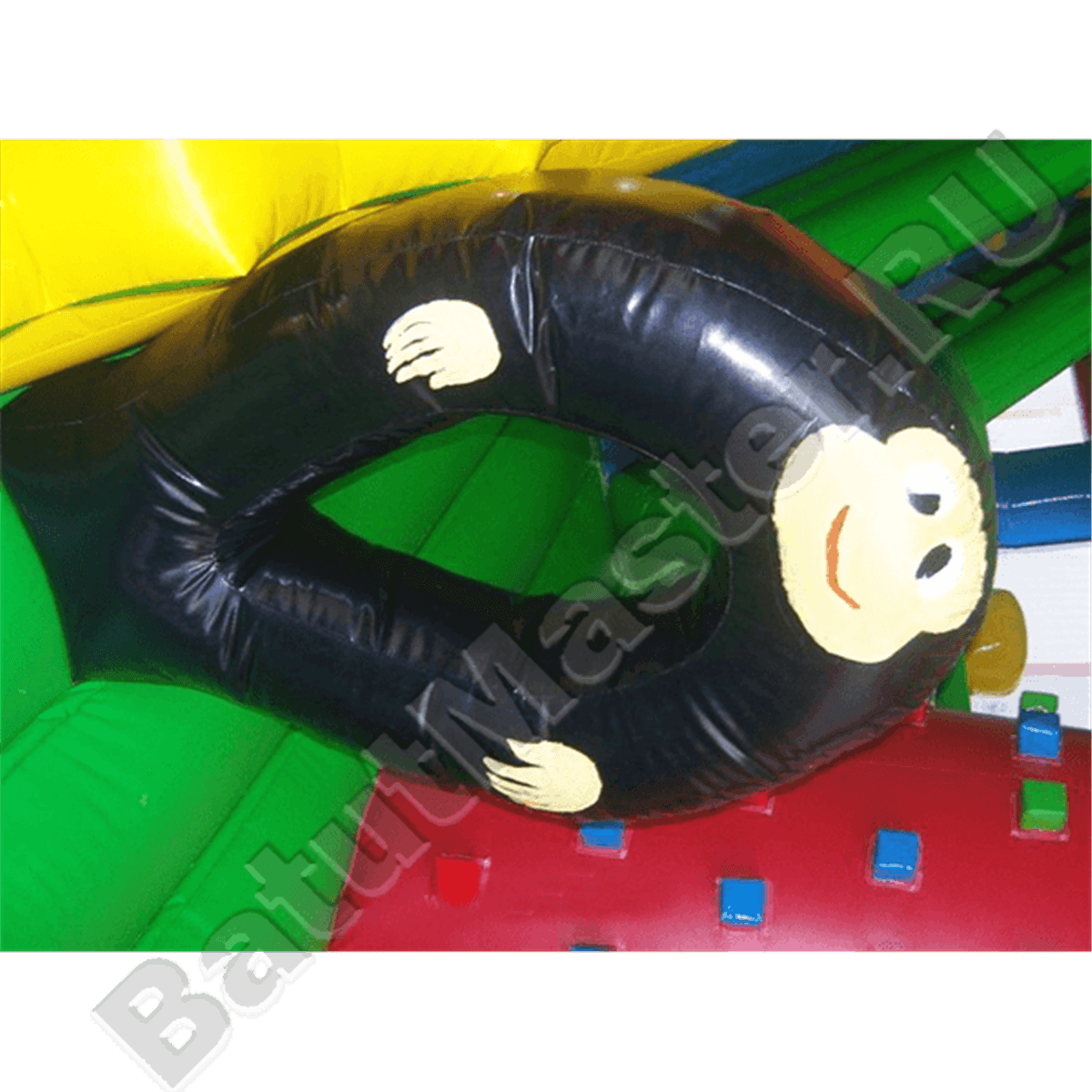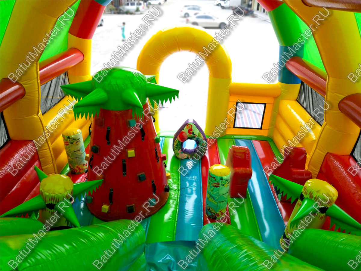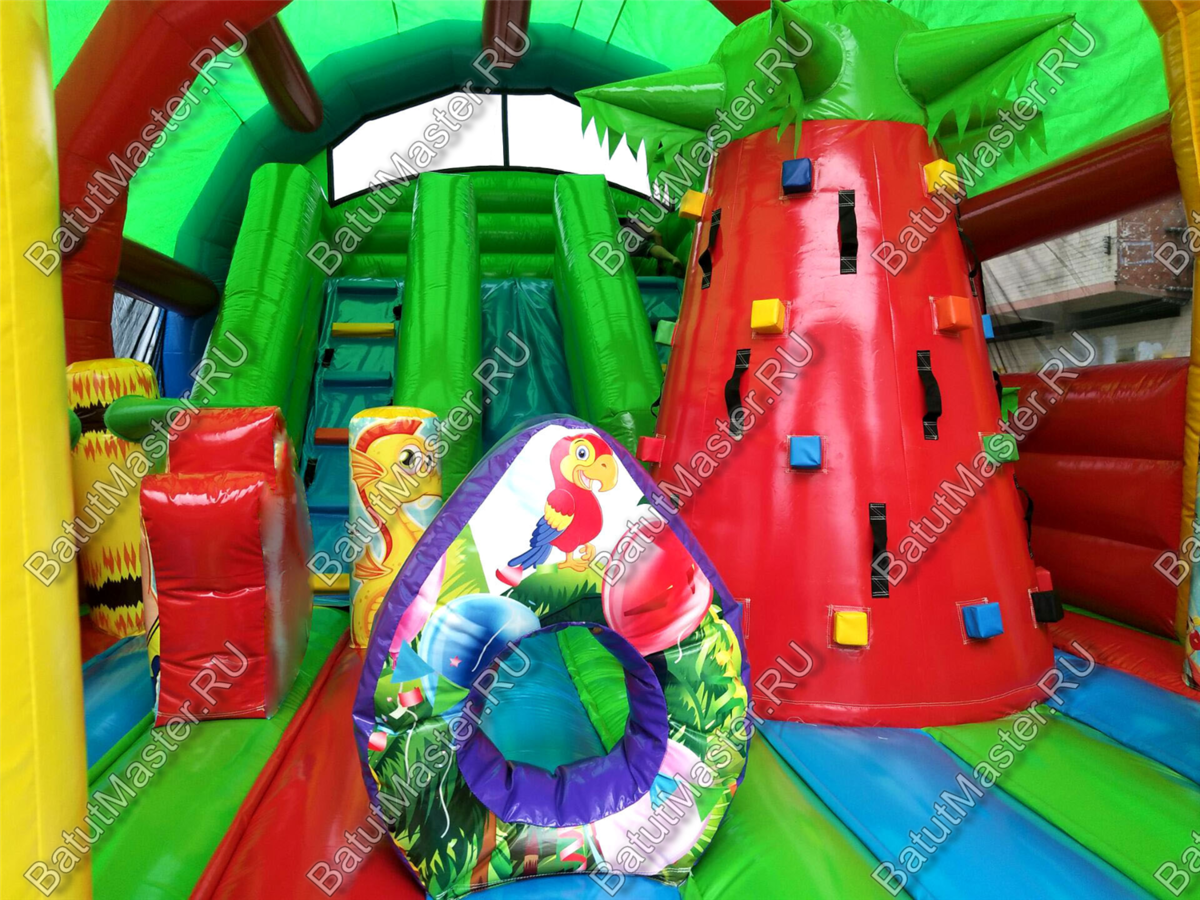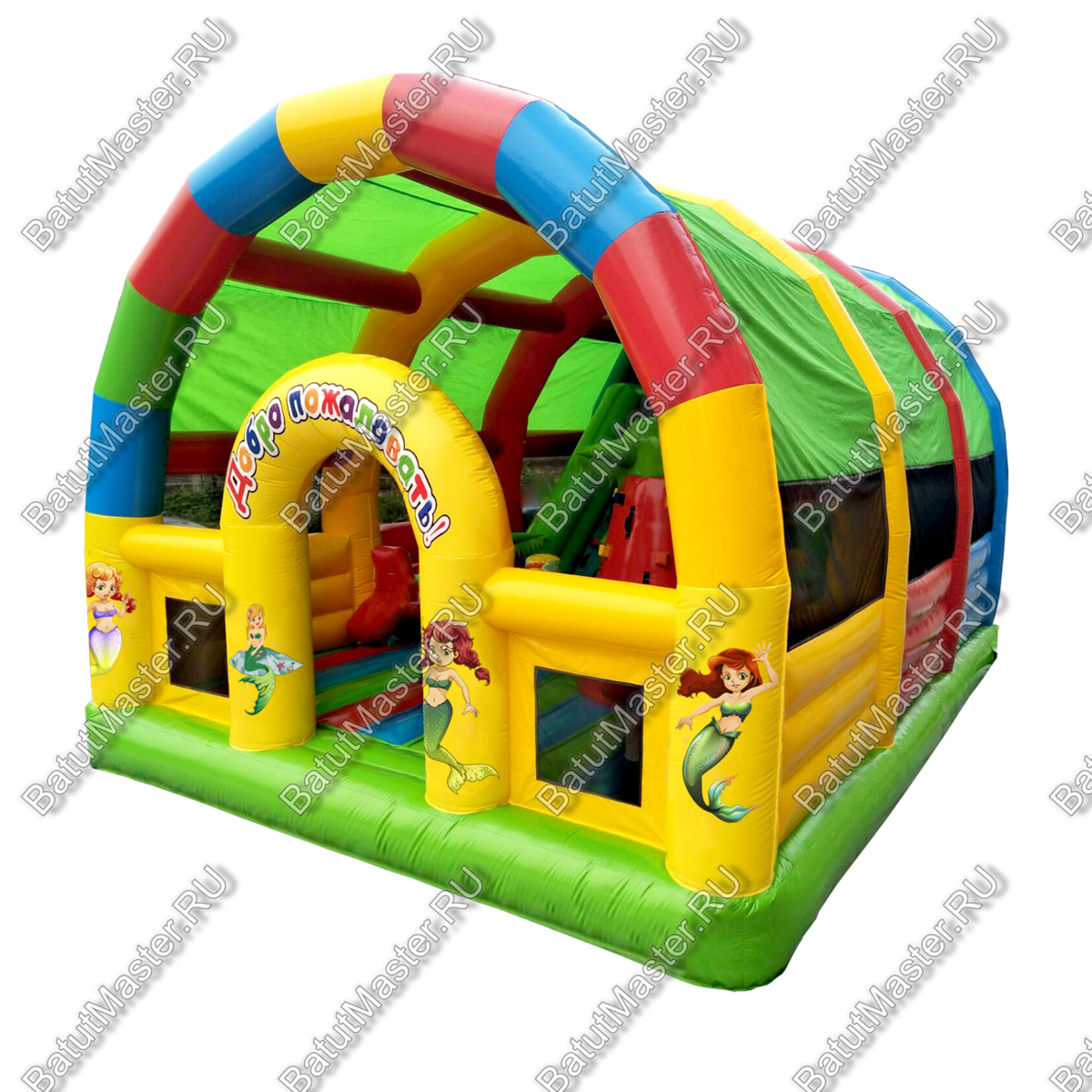 Начинается коммерческий аттракцион с ярко желтой надувной фасадной стены, изготовленной в виде арки и небольших прозрачных окон с изображениями русалок. Над аркой входа выступает еще одна разноцветная арка, но больших размеров – это начало навеса. Как только дети попадут внутрь батута, перед ними откроется целый комплекс игровых фигур в виде гриба, пальмы, круглого лаза с изображением обезьяны, скалодрома и др. Задняя часть батута вмещает в себе ярко зеленую горку с двумя лестницами и одним спуском. Стартовая площадка горки полностью закрыта со всех сторон и находится на высоте 3 м.