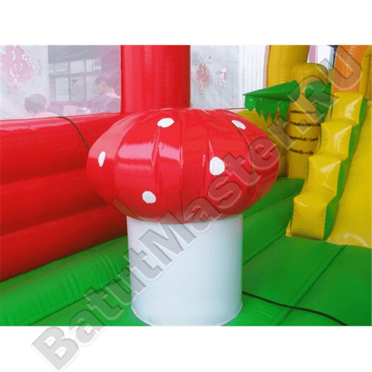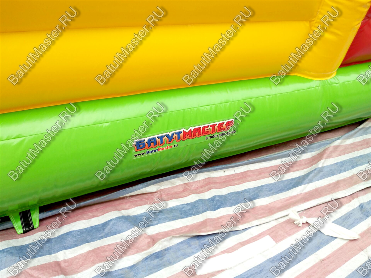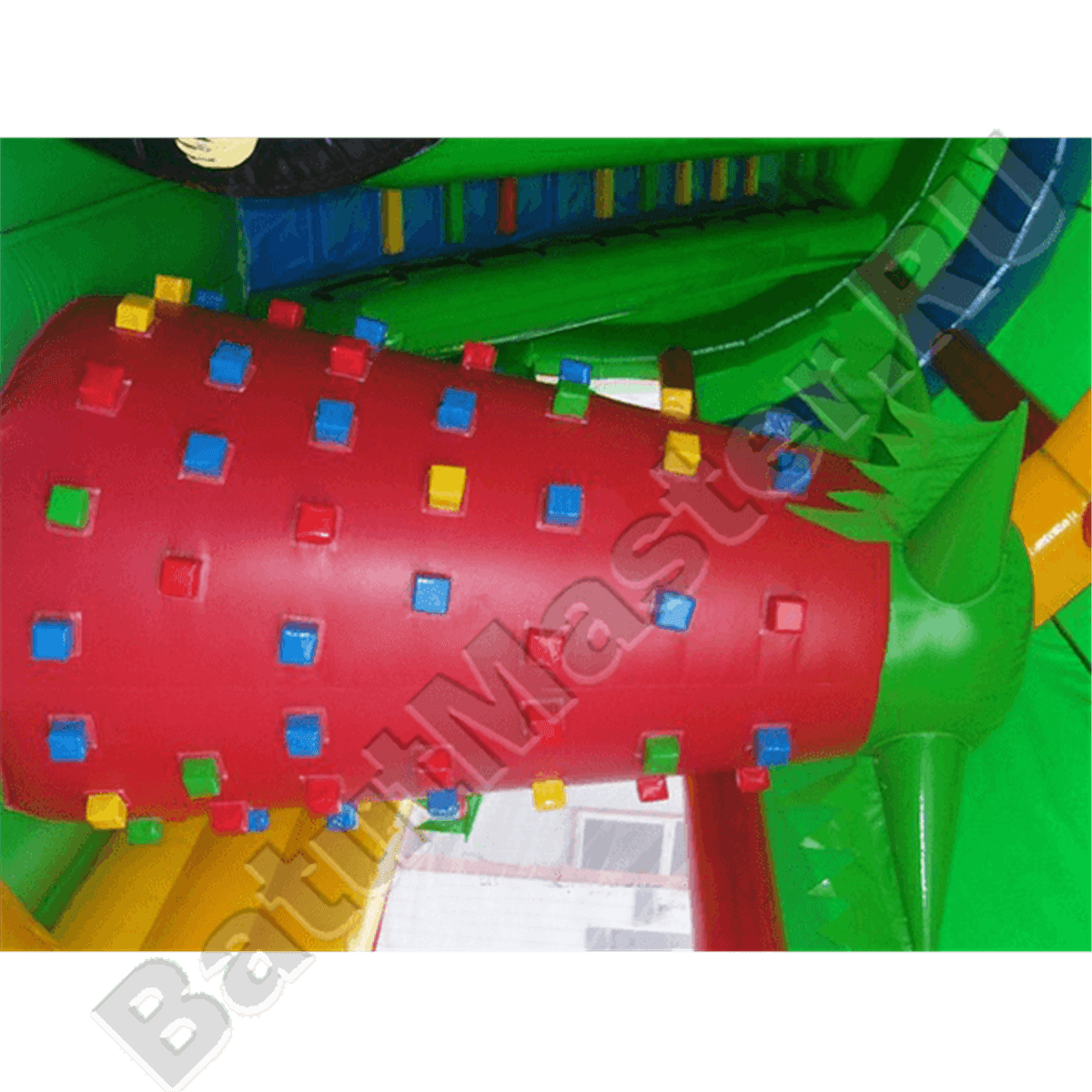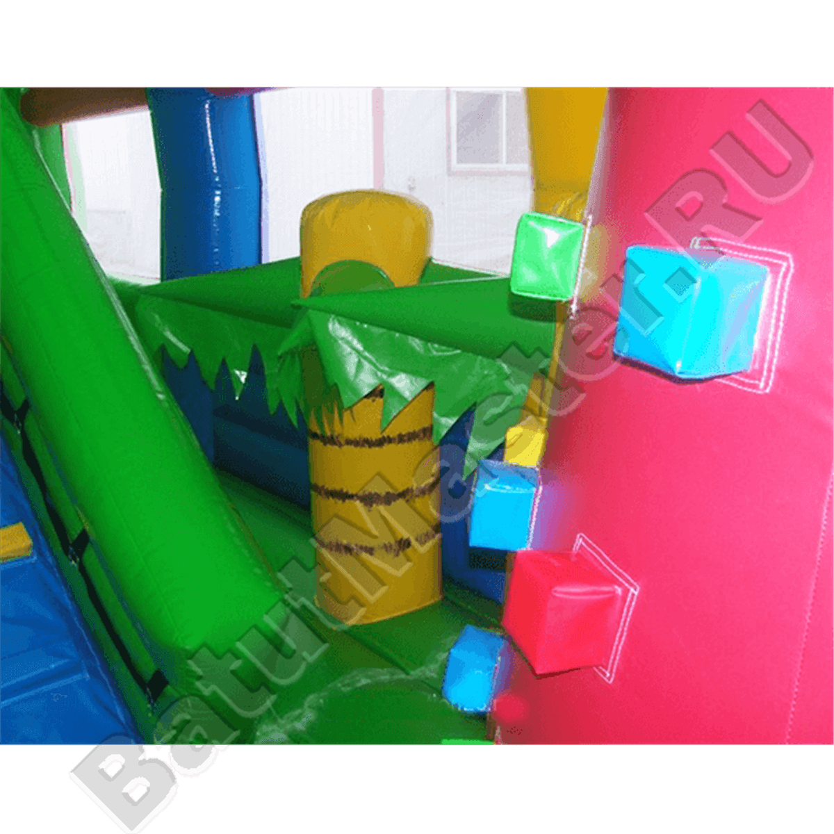 Начинается коммерческий аттракцион с ярко желтой надувной фасадной стены, изготовленной в виде арки и небольших прозрачных окон с изображениями русалок. Над аркой входа выступает еще одна разноцветная арка, но больших размеров – это начало навеса. Как только дети попадут внутрь батута, перед ними откроется целый комплекс игровых фигур в виде гриба, пальмы, круглого лаза с изображением обезьяны, скалодрома и др. Задняя часть батута вмещает в себе ярко зеленую горку с двумя лестницами и одним спуском. Стартовая площадка горки полностью закрыта со всех сторон и находится на высоте 3 м.