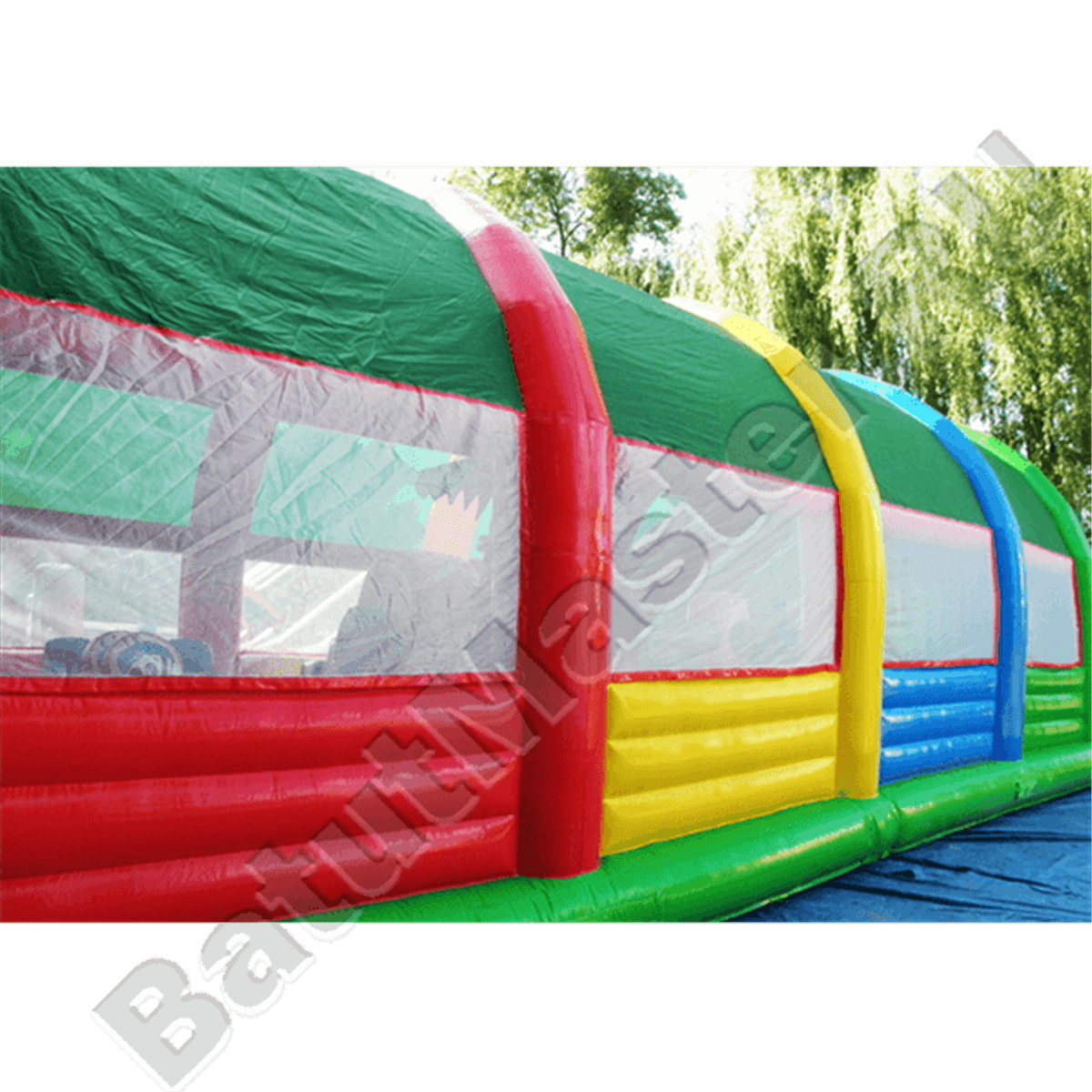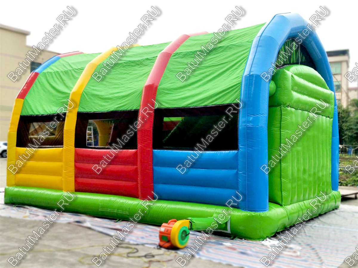 Представленный надувной батут является одним из наиболее успешных коммерческих проектов среди всех игровых площадок для бизнеса, так как оснащен съемным навесом. Сам же навес имеет дугообразную конструкцию, что позволяет создавать закрытое пространство и надежно защищать детей от дождя, ветра и солнца. Материал ПВХ, из которого сделан данный навес, под воздействием солнца создает внутри батута уютную и теплую атмосферу и не дают нагреваться высокой горке. Навес может быть изготовлен не только из ПВХ, но и из нейлона, тогда вес конструкции значительно снижается.