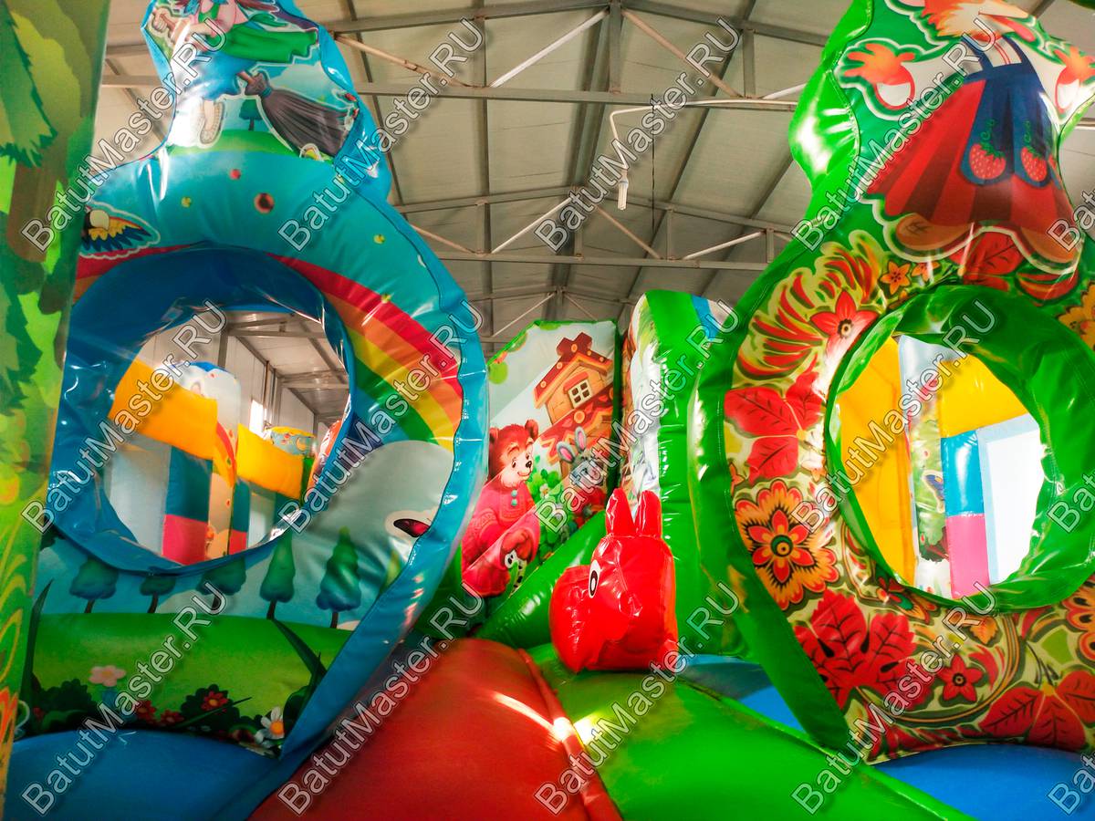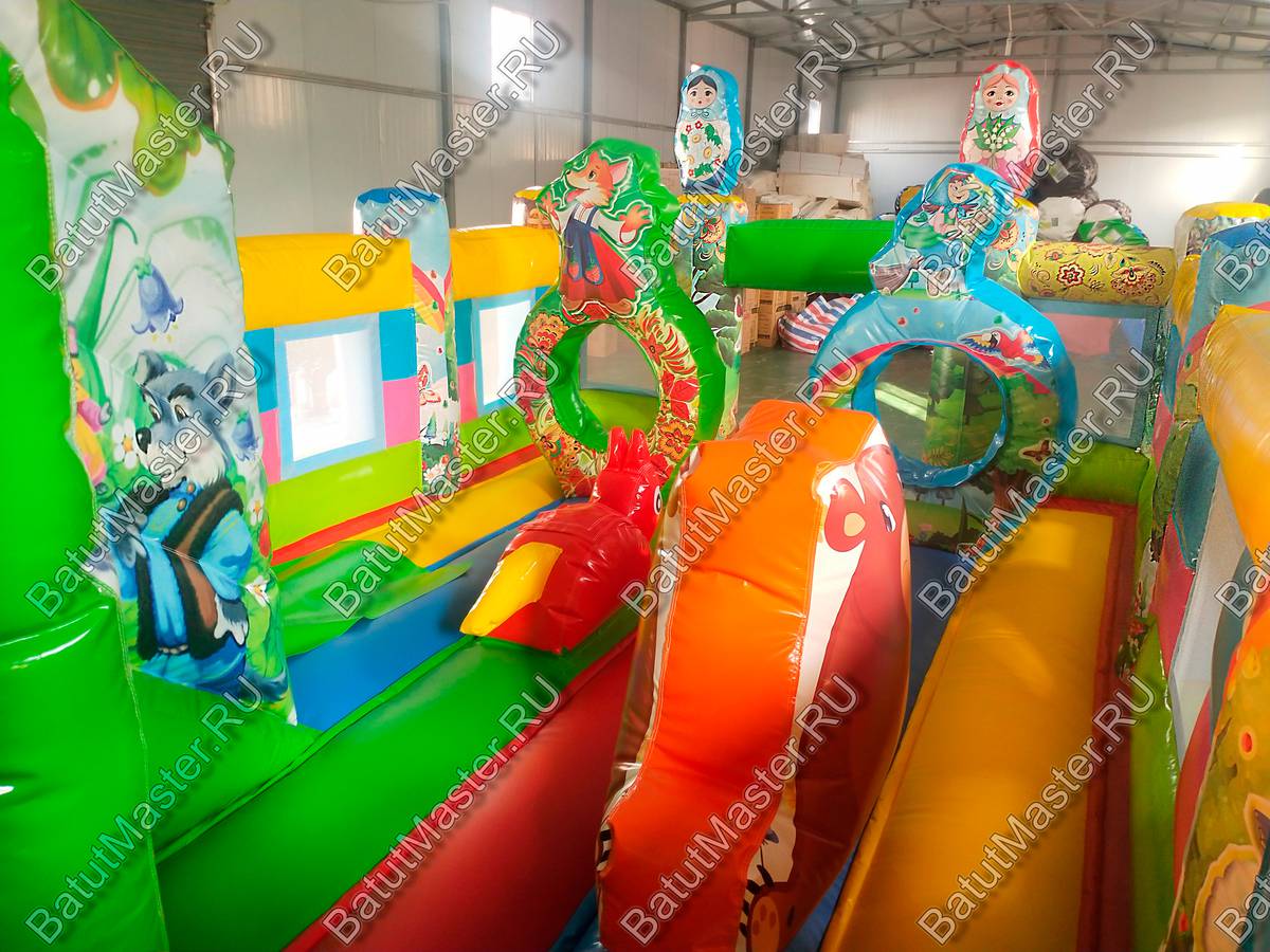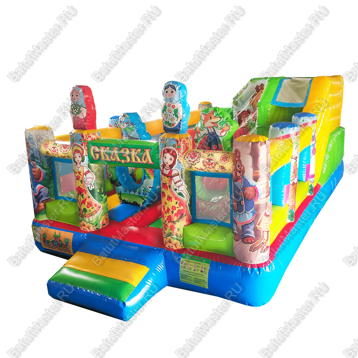 Открытый батут «Русские сказки» входит в категорию – детское надувное оборудование для ведения развлекательного бизнеса. Популярность аттракциона позволяет использовать его в парках, развлекательных центрах, игровых площадках и других местах массового скопления детей. Для того чтобы посетителям было весело и интересно в надувную конструкцию включены следующие элементы: